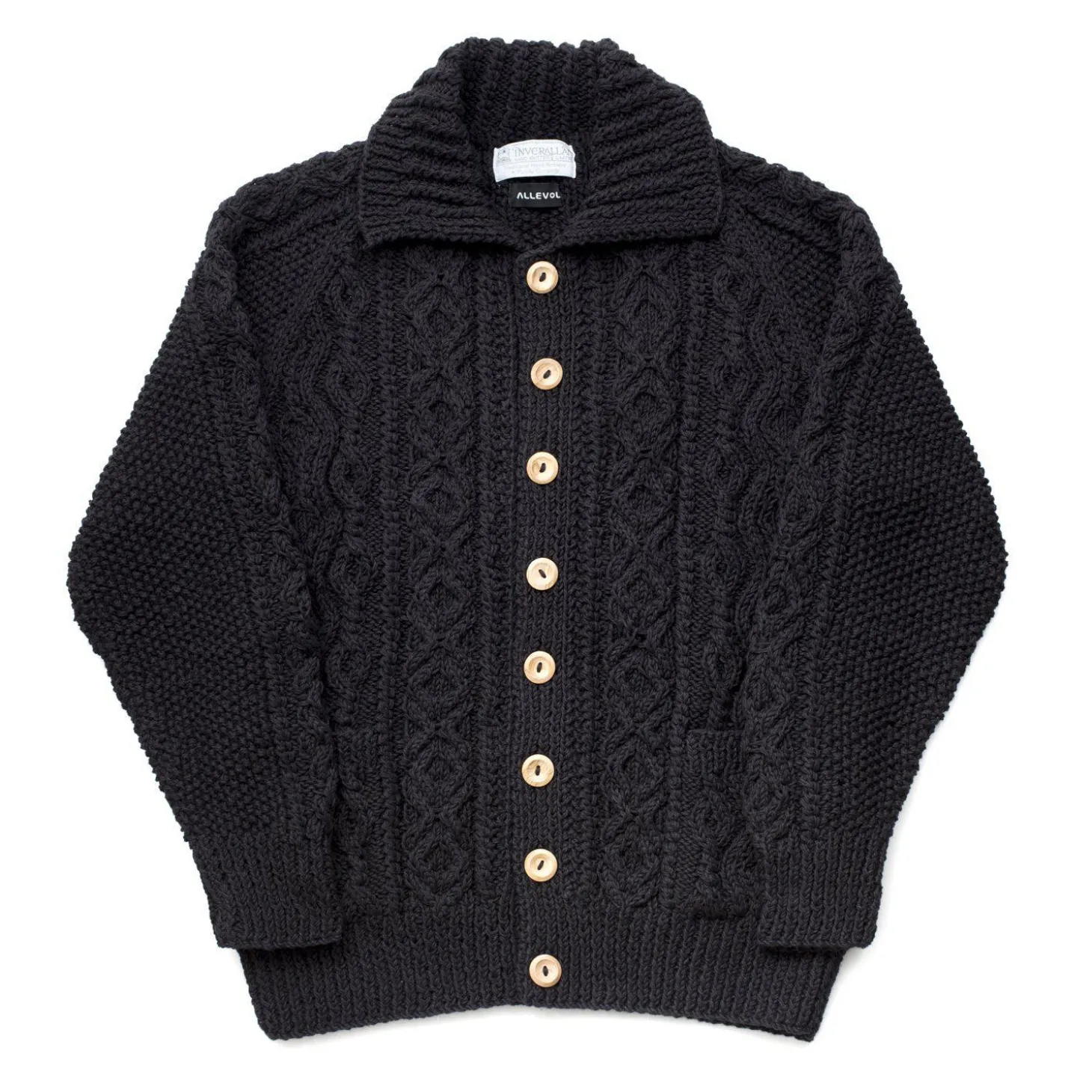A collaboration with Inverallan of Scotland, all pieces are limited in no and hand knitted to a traditional cable knit pattern, in a thick black dyed cotton, with crafted wooden buttons