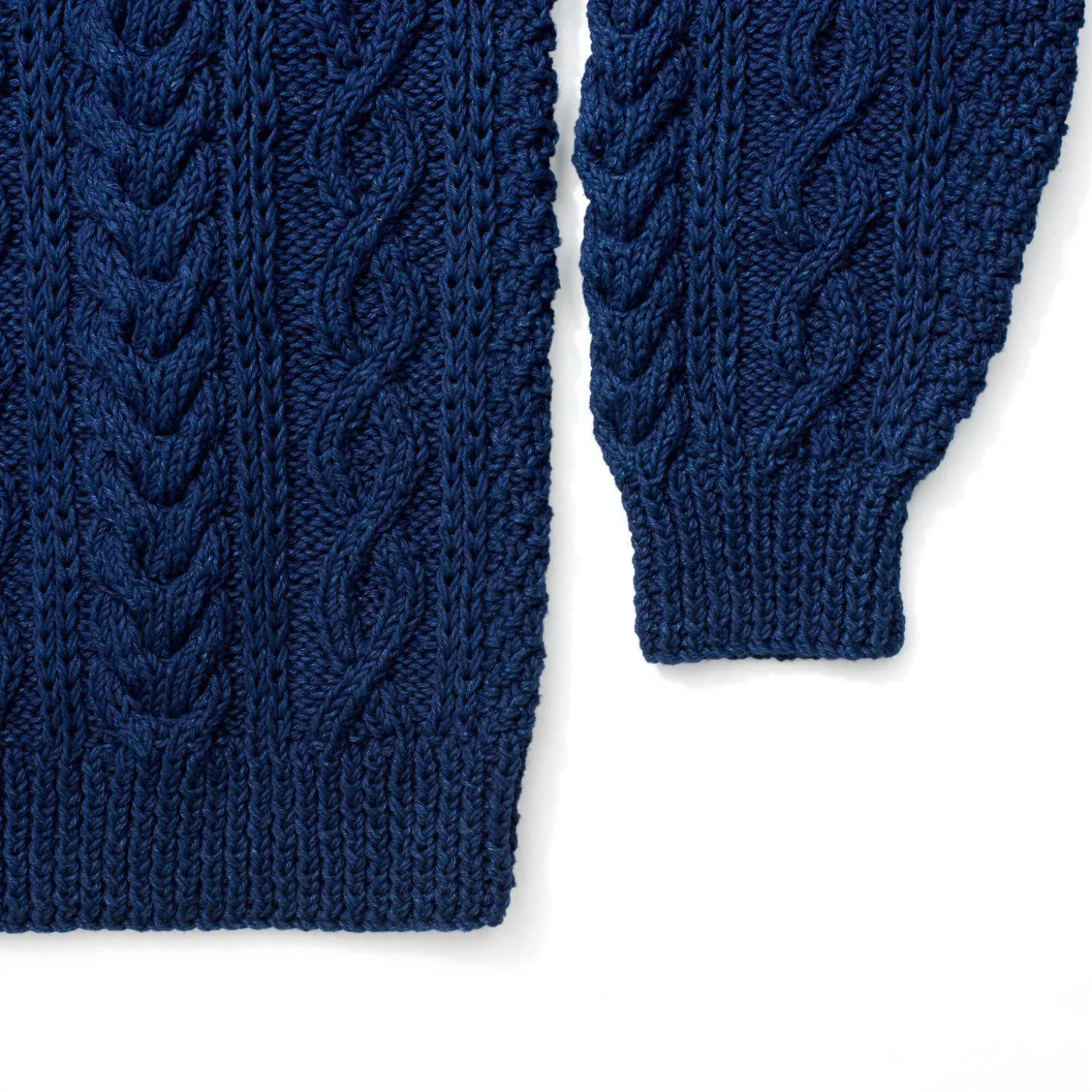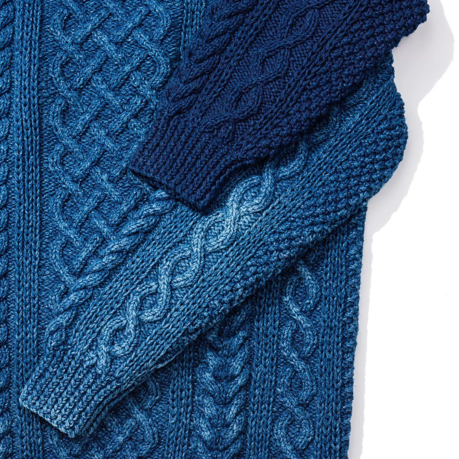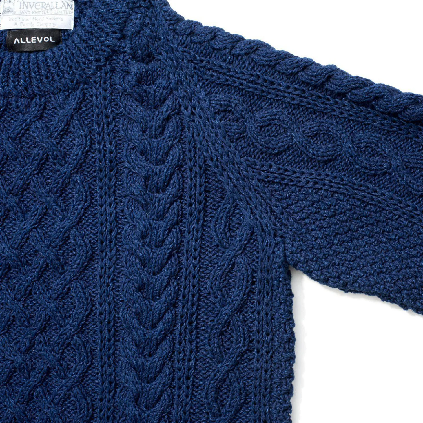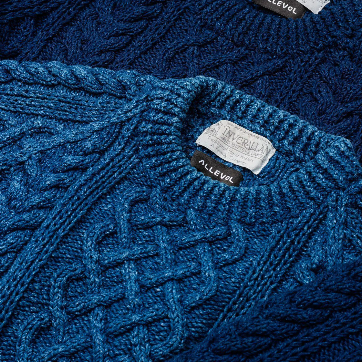 A collaboration between Allevol and Inverallen of Scotland. All pieces are limited in no. and hand knitted to a traditional cable knit pattern, in thick indigo-dyed cotton, which over time, will fade like a pair of jeans