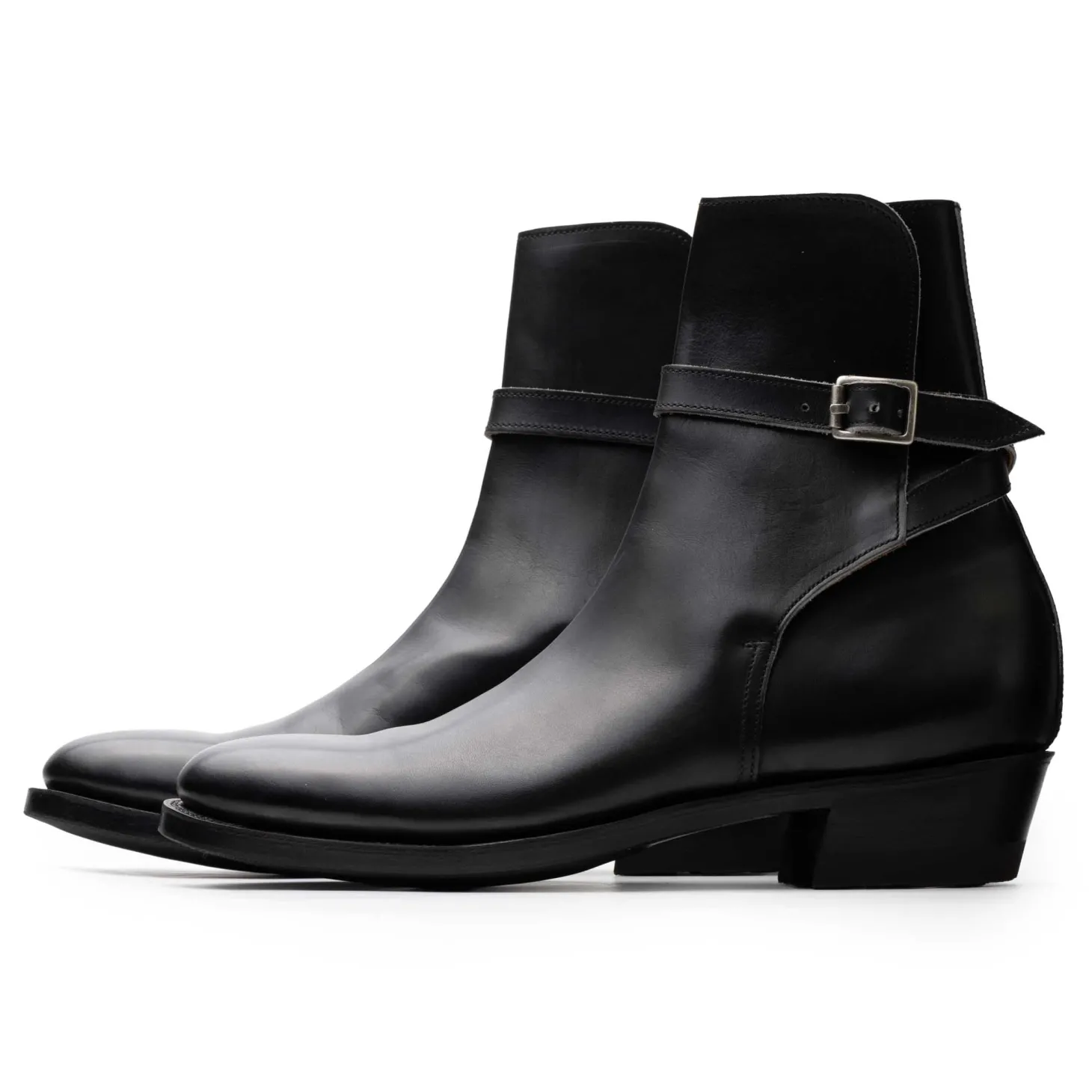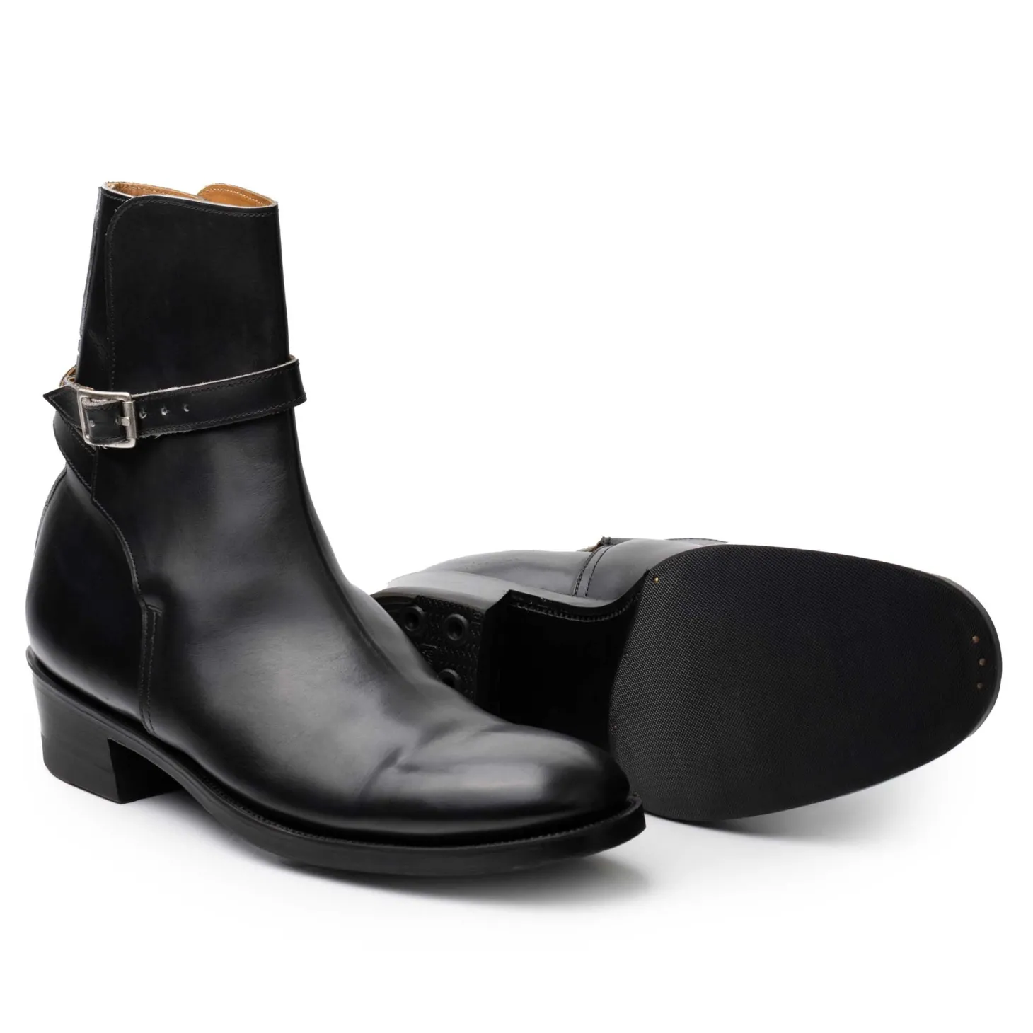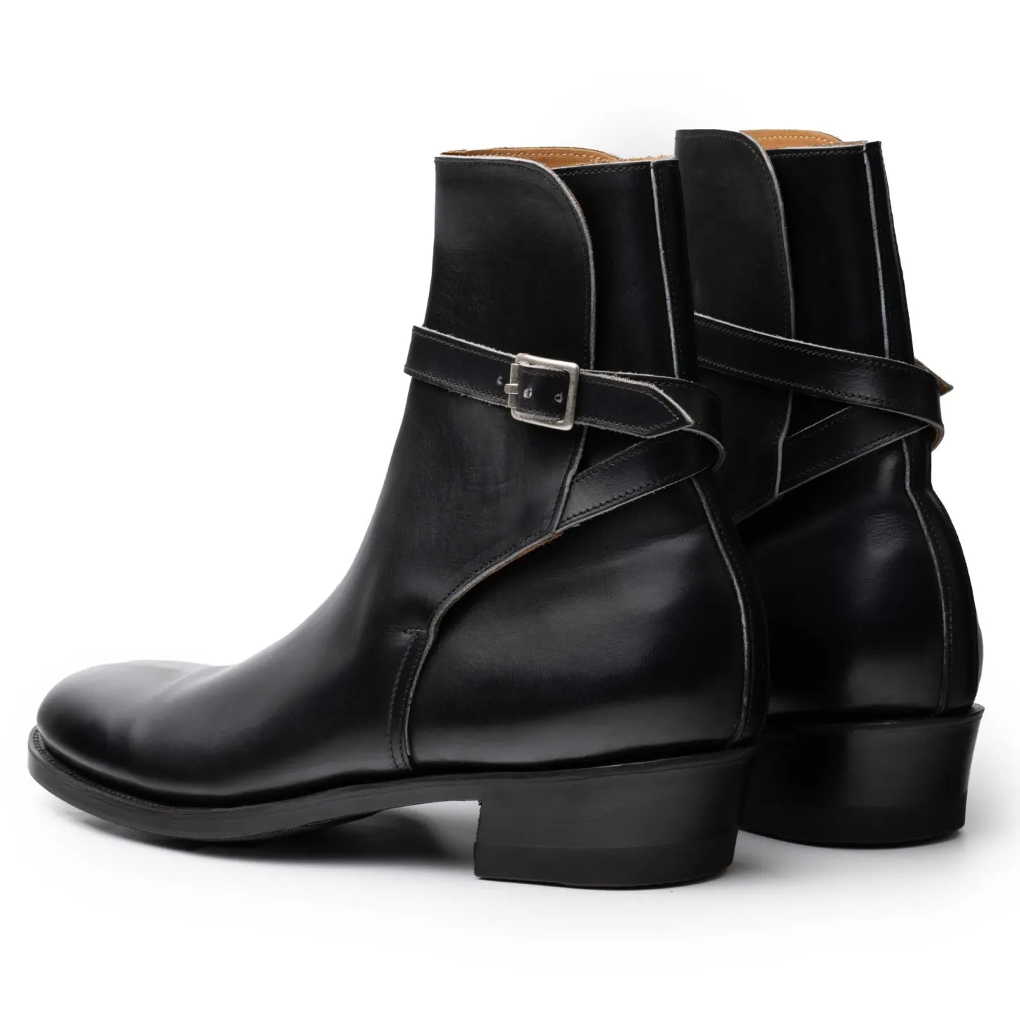 The calfskin uppers are put together in three sections, with each section expertly cut by hand. Put together with intricate, tonal stitching, the Jodhpur boot also features a belt closure where two halves cross one another in an ‘X’ shape, before looping through to the outside shaft and finished with a brass buckle adjuster.
