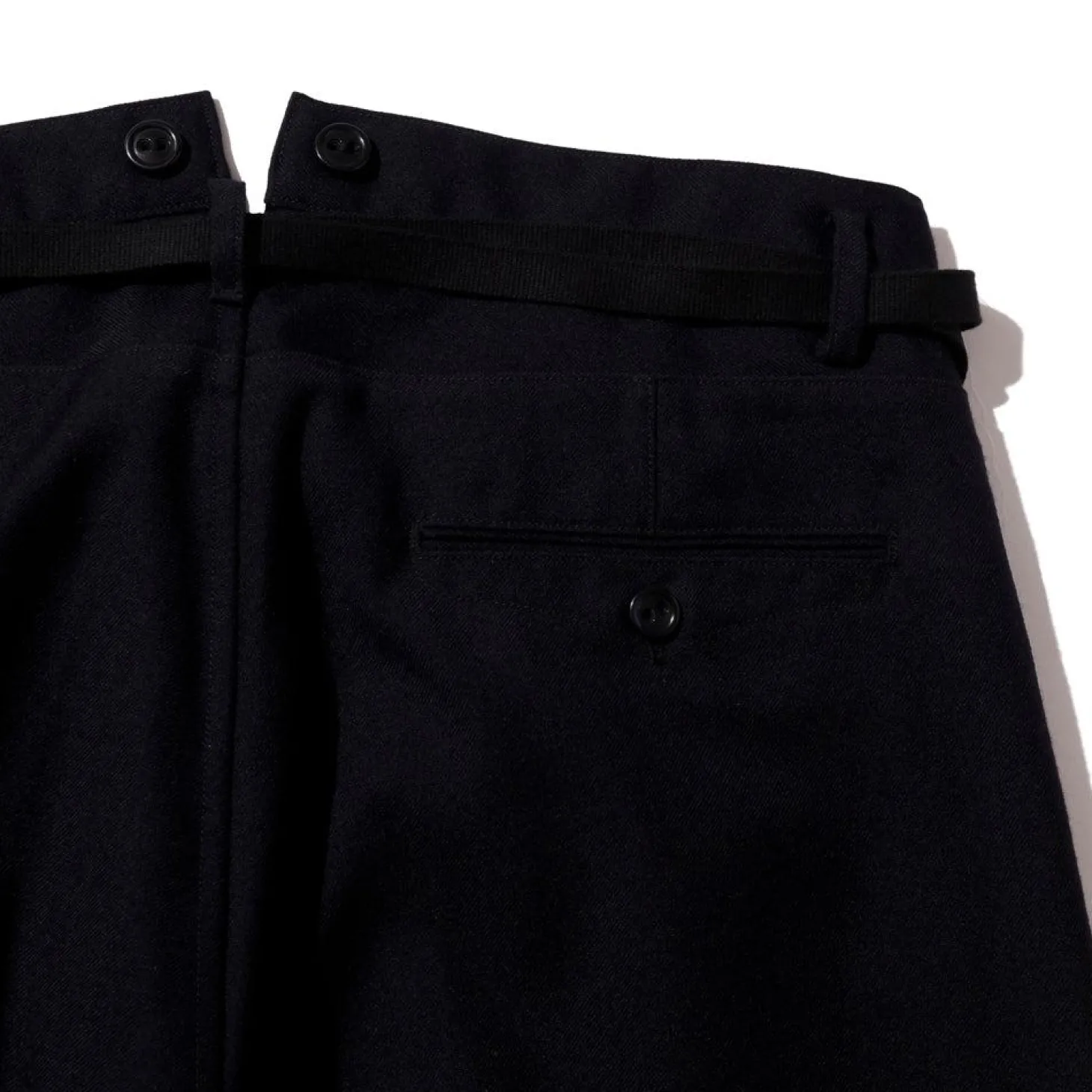 Cut in Japan from the brand’s exclusive rover wool twill, the Alain is a straight fitting trouser, with a pleated front and belted waist with tie system as well as a button front. Complete with two front pockets sewn on the outside seam with intricate stitch detail and a single rear pocket with button closure. A fishtail back and buttons on the inside waist band and back complete the look.