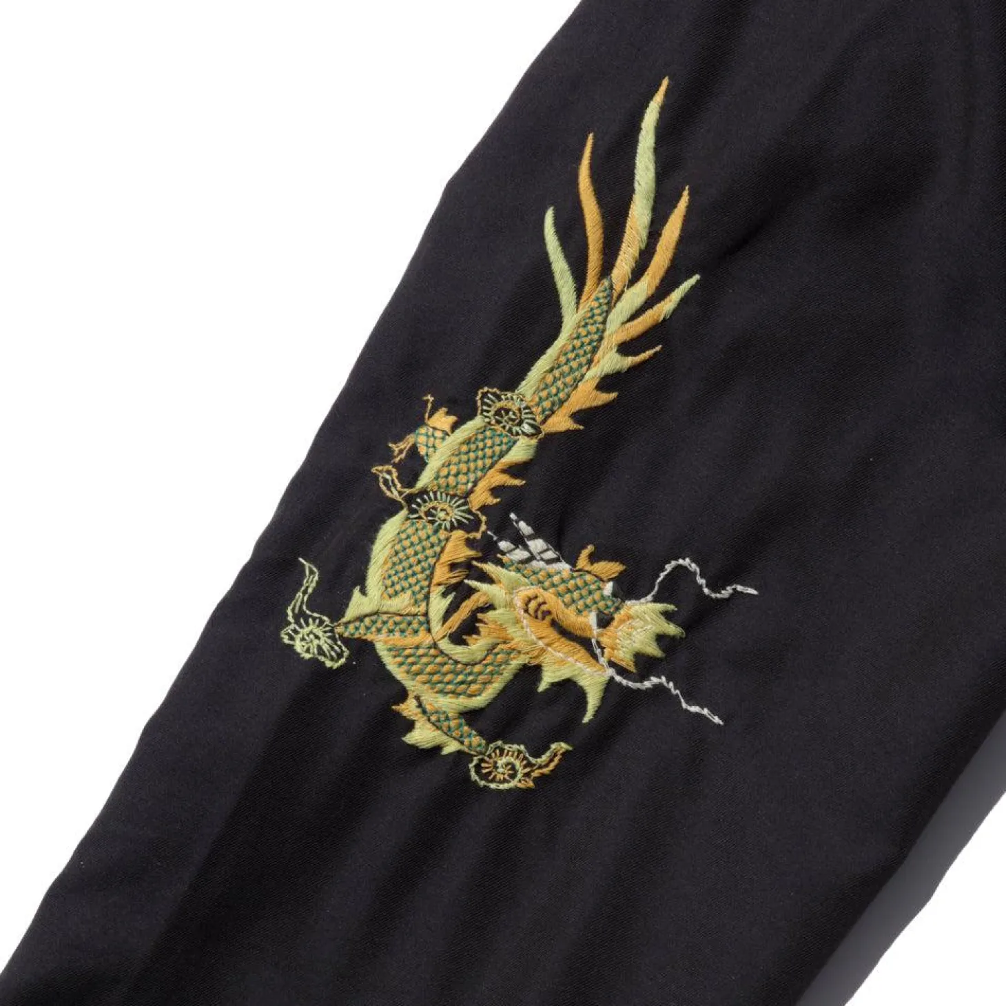 Souvenir jackets, also known as suka-jans have a vibrant a rich history dating back to the post-war occupation of Japan. Servicemen stationed overseas would have these jackets made for themselves or a loved one, embroidered with local motifs and imagery to bring home as a memento.