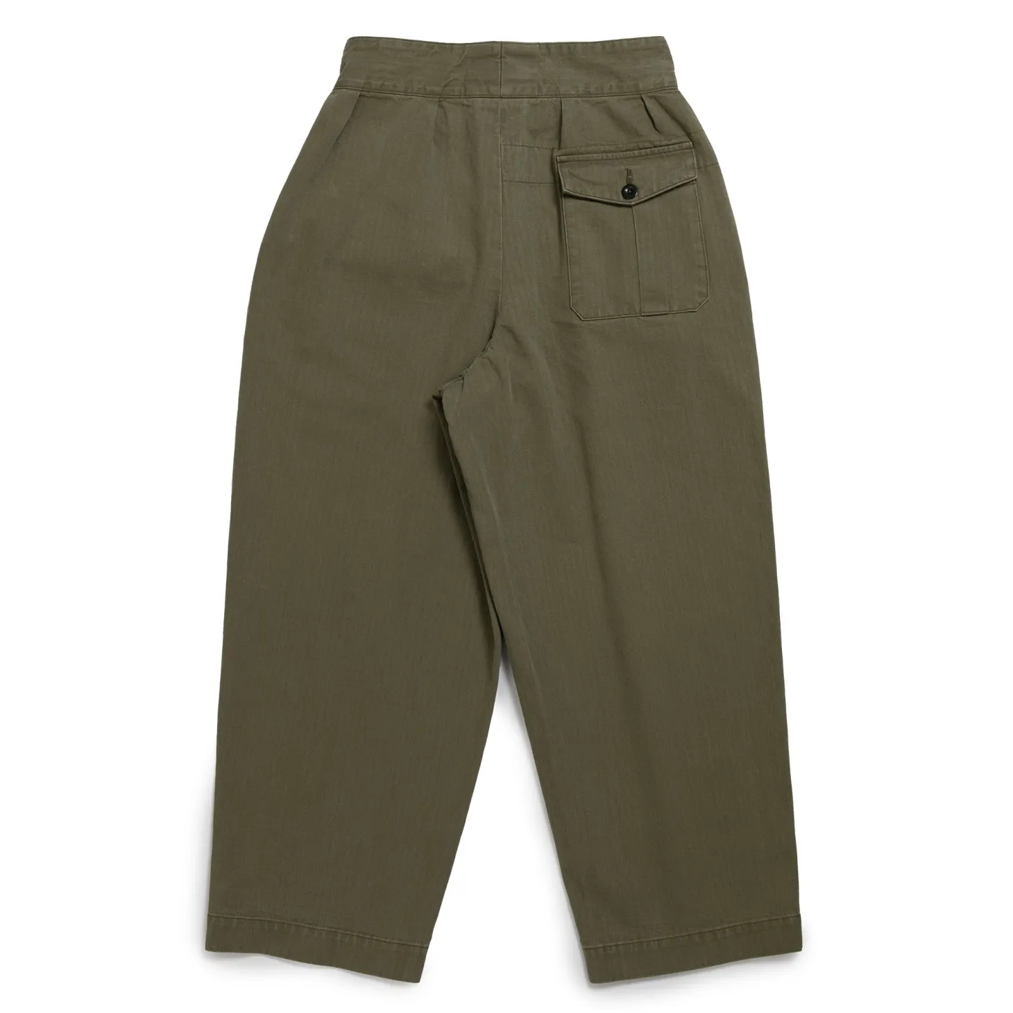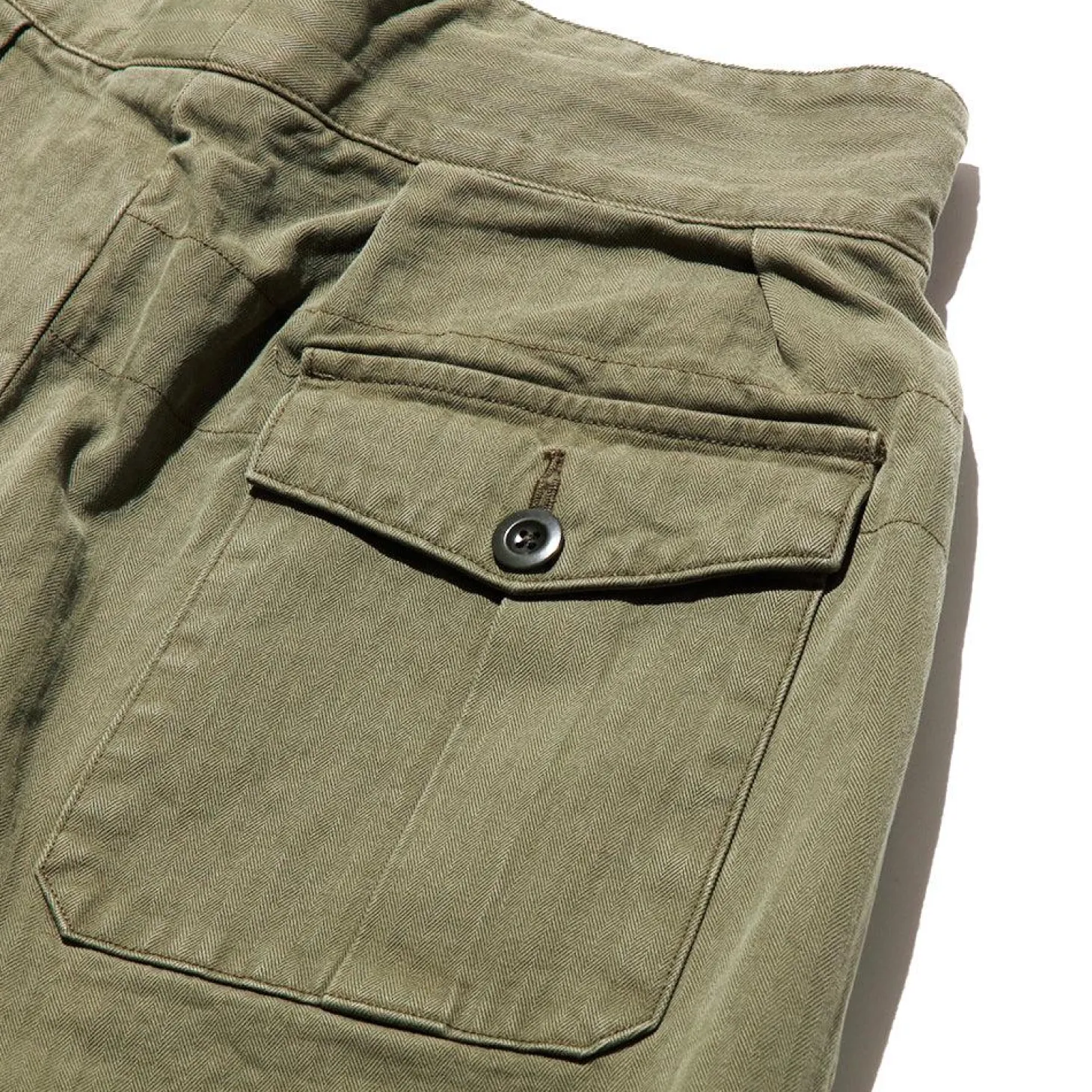 The Gurkha Trouser is defined by its double-pleated front and high, cummerbund-style waistband with buckle fastenings. Cut in Japan from 100% cotton, these are available in two colour-ways. The HBT has a vintage feel to it, while the trousers have two front pockets and one rear pocket. Double pleated front and buckle closure have been paired with a roomy, relaxed tapered silhouette for a modern, clean look.