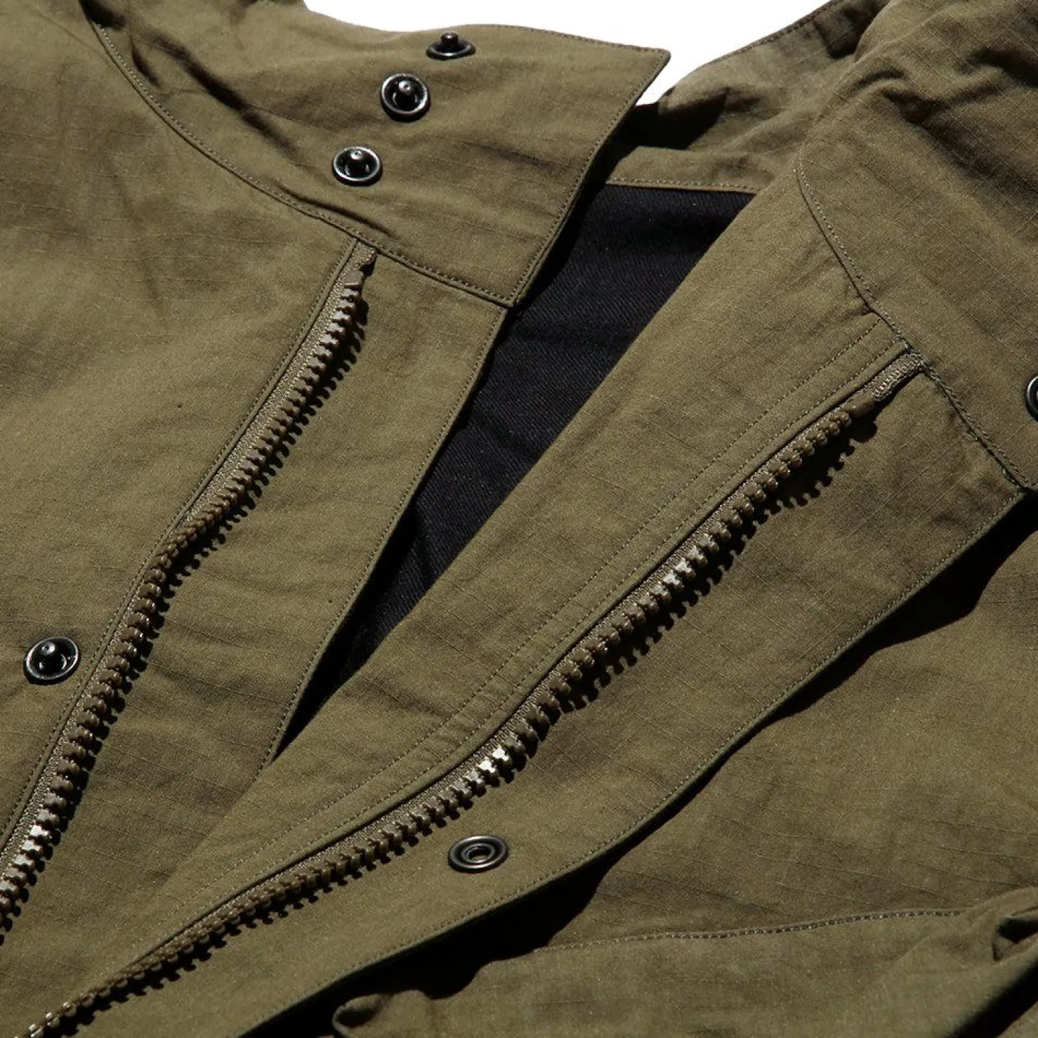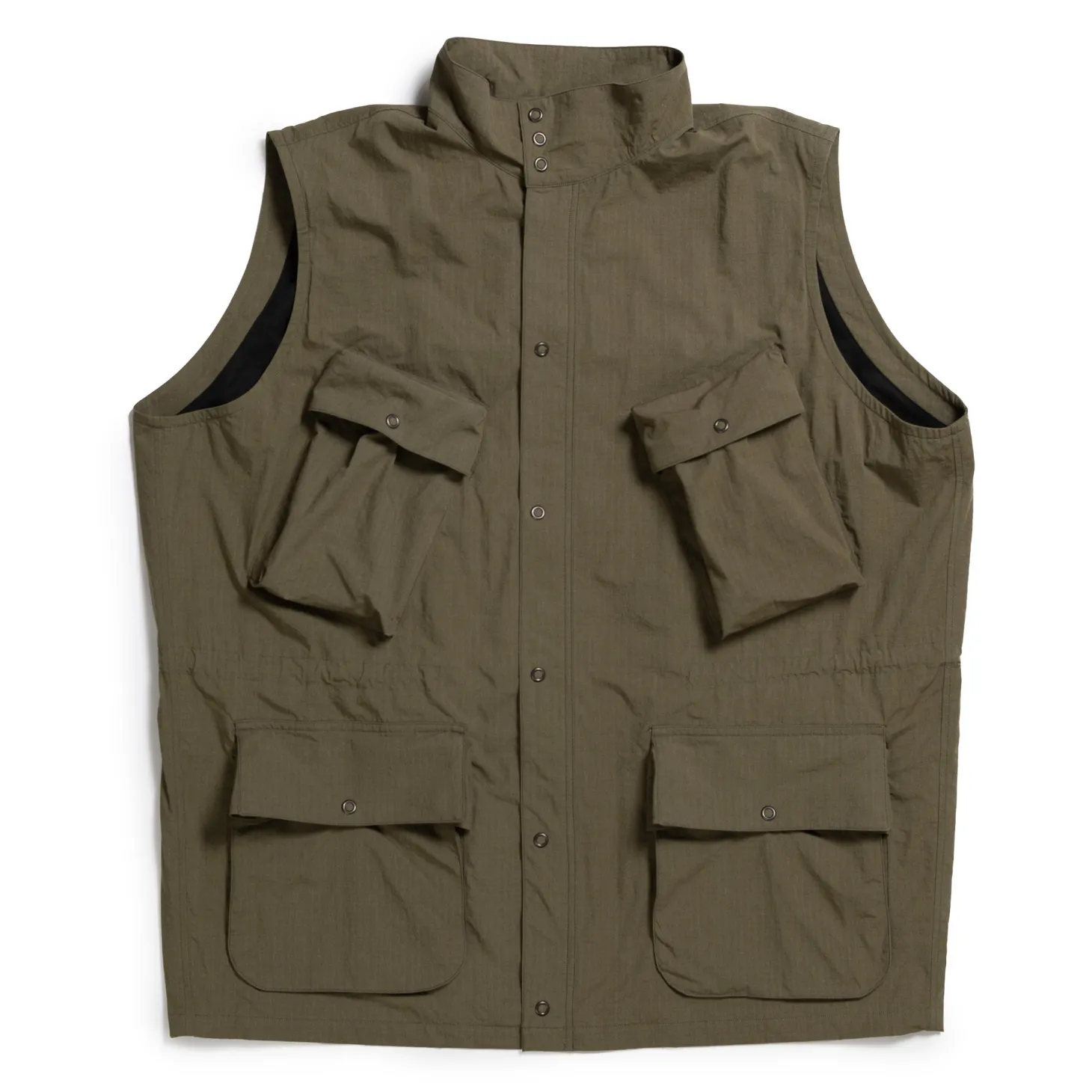 Cut in Japan from a 50/50 cotton nylon ripstop, this Military Vest is extremely lightweight, making it the ideal layering piece. The Vest features two chest gusseted pockets with snap closure and two lower pockets with snap closure. A snap button front with concealed zip front front and a loose stand collar have been paired with a drawstring waist to aid fit.