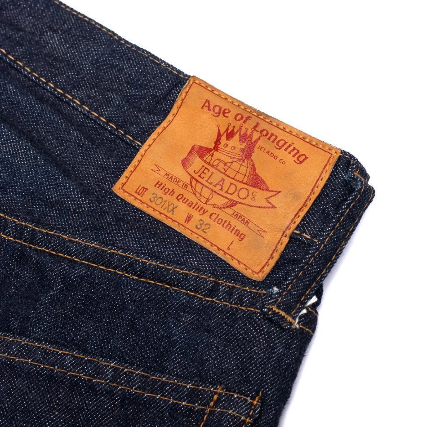 The leather patch is cut from subtle horsehide and features ‘The Age of Longing’ & Jelado branding stamped on, giving a vintage appearance. A high rise with a full cut has been paired with exposed copper rivets, a five-button front and Jelado’s signature cotton thread arcuate sewn on the back pockets.