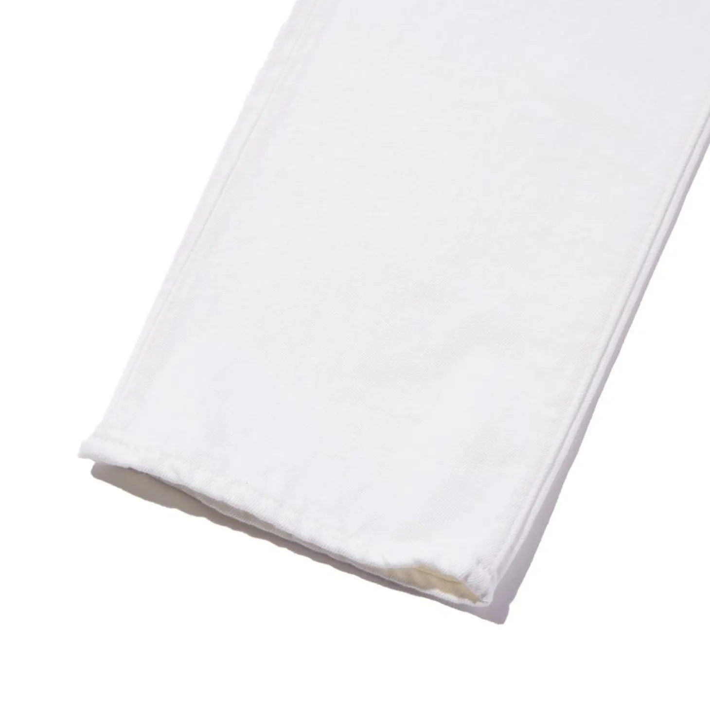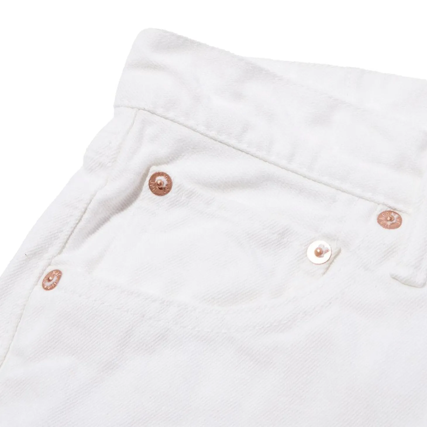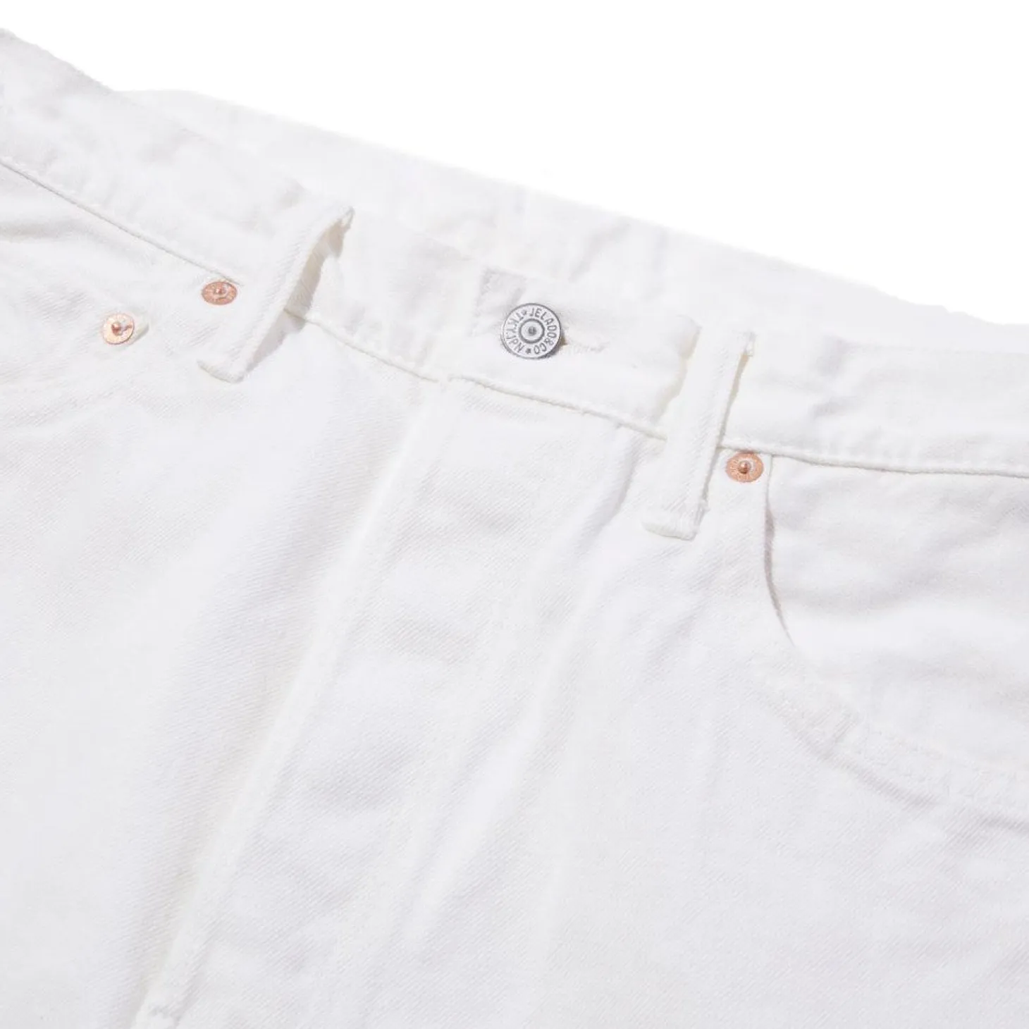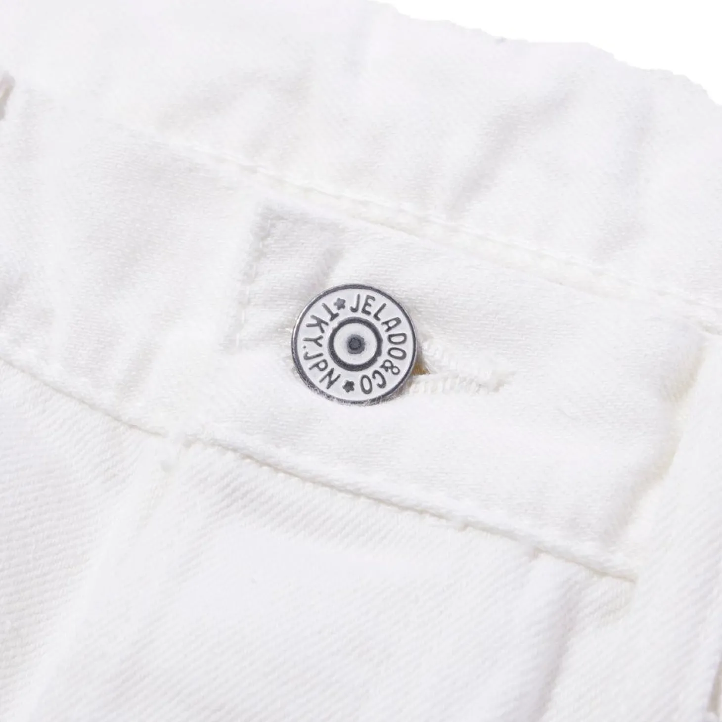 A high rise with a straight has been paired with exposed copper rivets, a five-button front and Jelado’s signature cotton thread arcuate sewn on the back pockets as well as a paper patch.