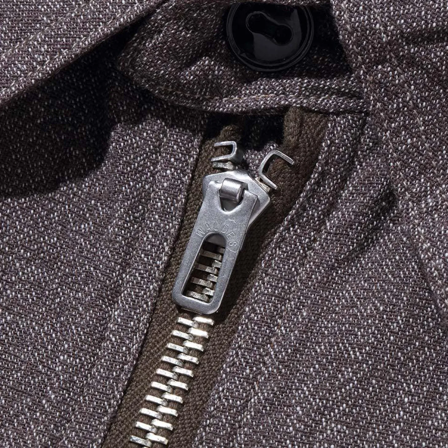 The Ciggy is complete with a zip front, using a Waldes zipper, and features classic workwear shirt detailing like chain-stitch run offs, throat tabs and triple stitch construction used through-out.