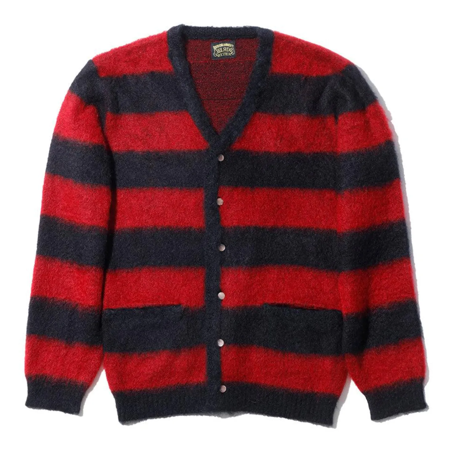 This mohair cardigan is cut from a blend of highly textured mohair, nylon and wool in Japan. Coming in a red x black stripe, the neckline has been paired with a relaxed feel giving a laid back and Grunge look. Soft to the touch and incredibly easy to wear, the garment also features a six button front, with two hip pockets and knitted cuffs.