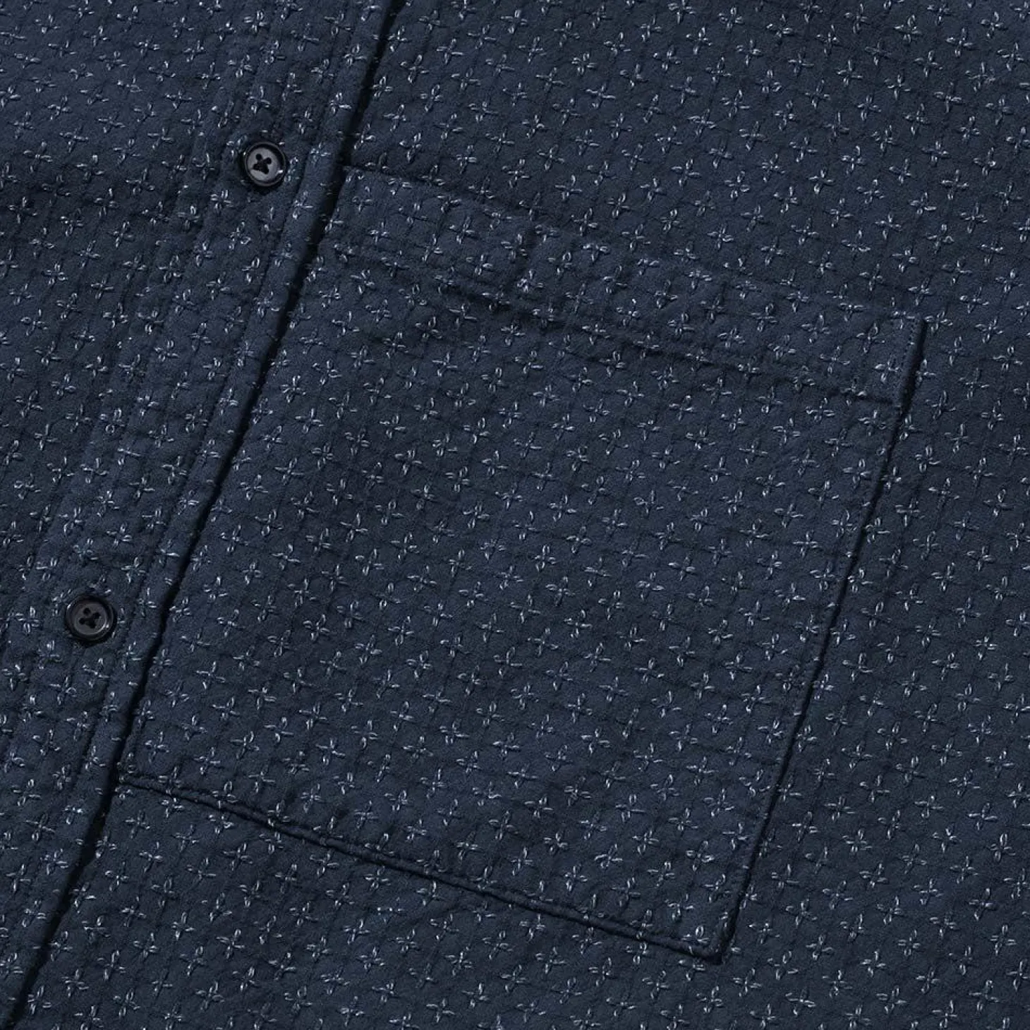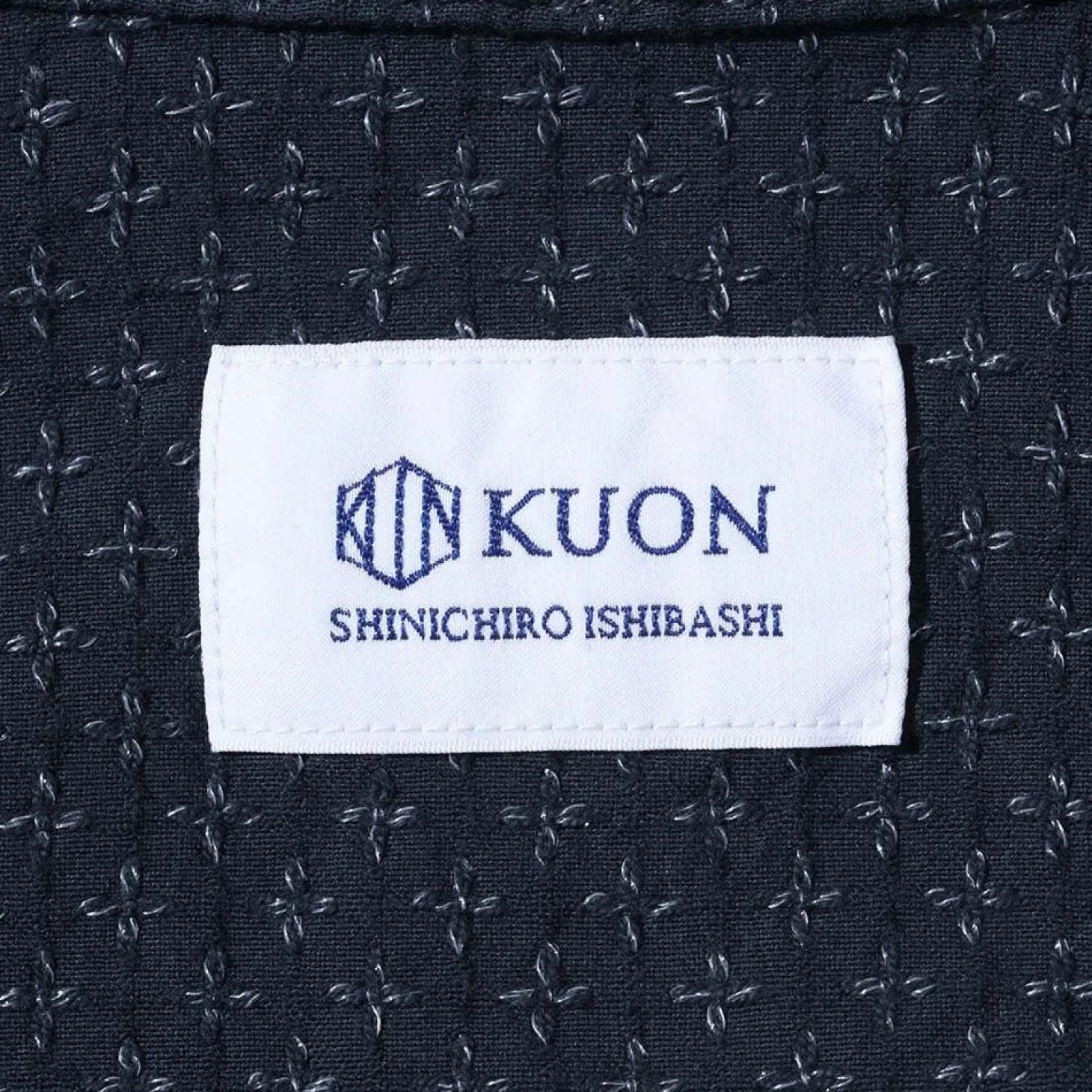 Here we have the Regular Collar Cross Sashiko Shirt, forming a key piece from Kuon’s SS22 collection. Cross Sashiko is a high-density double-woven Sashiko-ori fabric with 2-ply 40 count yarn in the warp and 20 count single yarn in the weft. Although difficult to machine weave, Kuon have made this possible by altering the speed and slowing the machinery down to almost hand sewing pace, resulting in a fabric that is light in weight. The use of thicker Sashiko threads makes the fabric taut and provides the shirt with a three-dimensional surface.