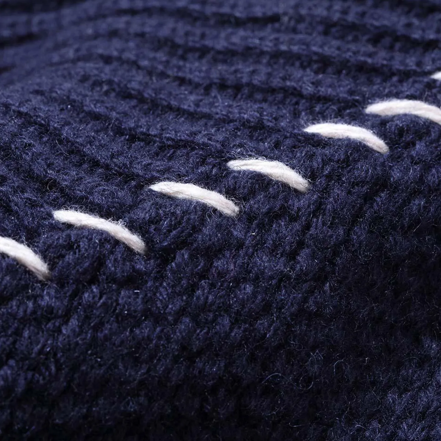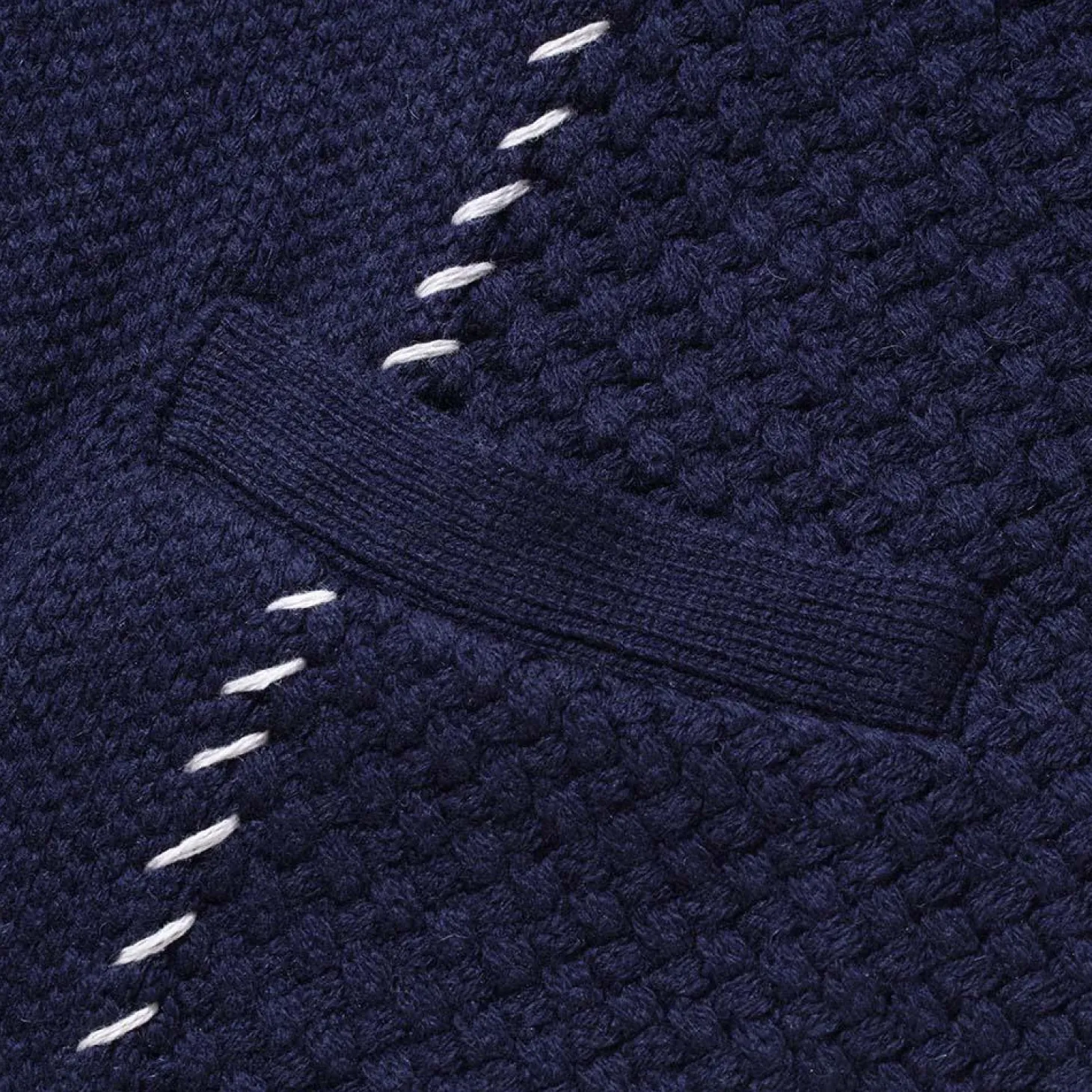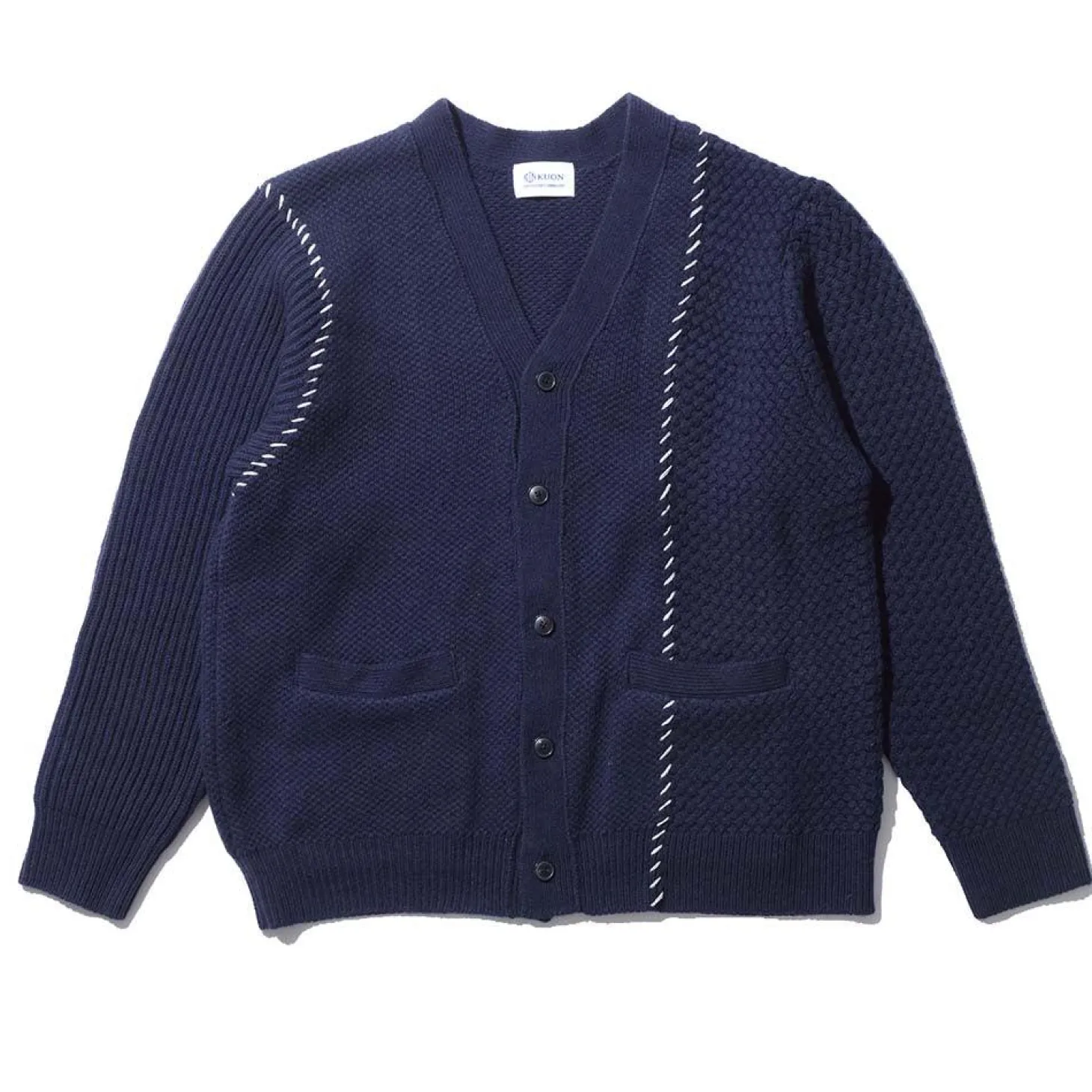 The Multi-Patterned Cardigan w/hand stitch from KUON is inspired by the Japanese art of ‘Kintsugi’ whereby damaged pottery is repaired – this is represented through the hand-stitch that runs through the body and shoulder seam of the cardigan. Made in Japan and cut from 100% wool, this version comes in a classic navy colour-way and features a relaxed fit, a button front and two lower pockets.