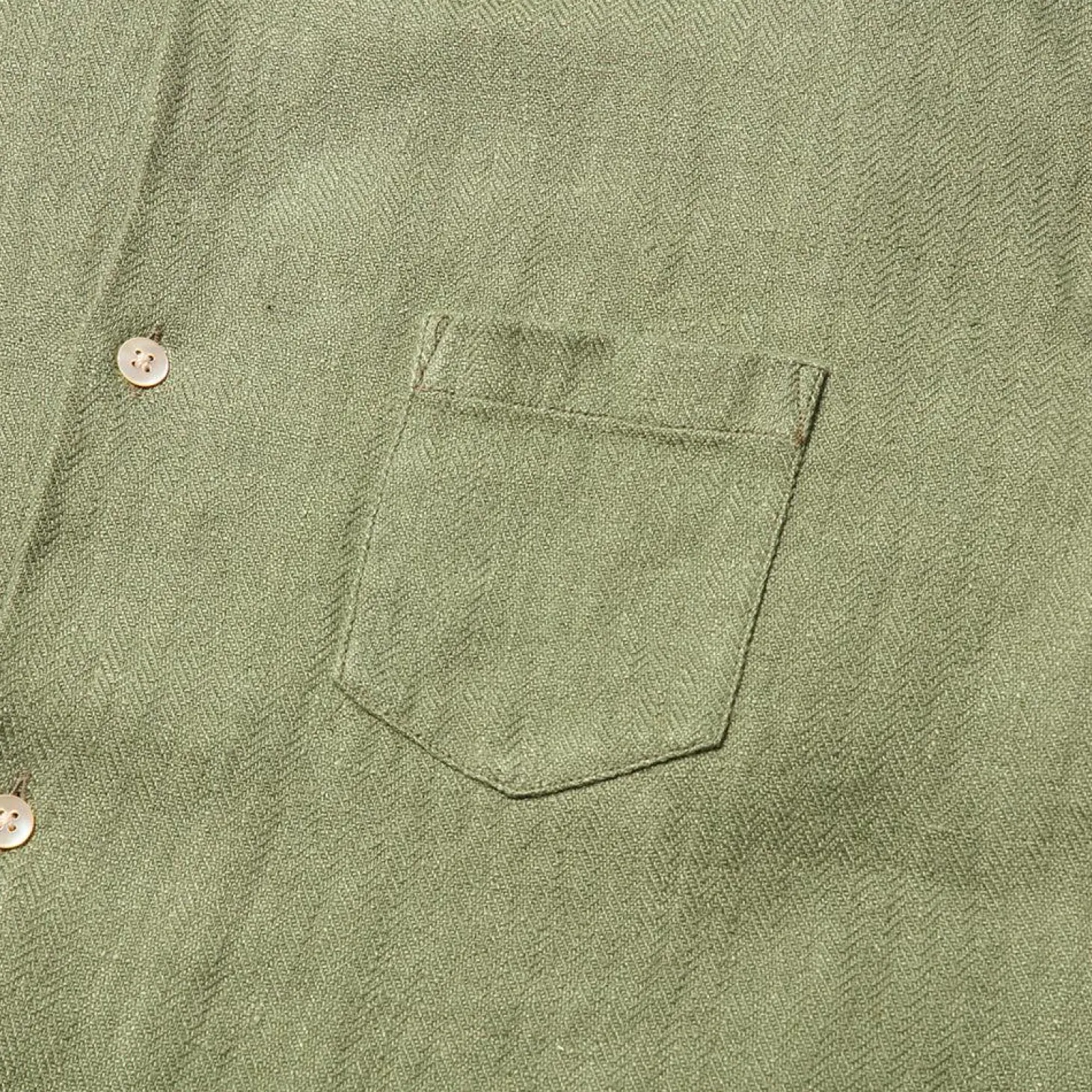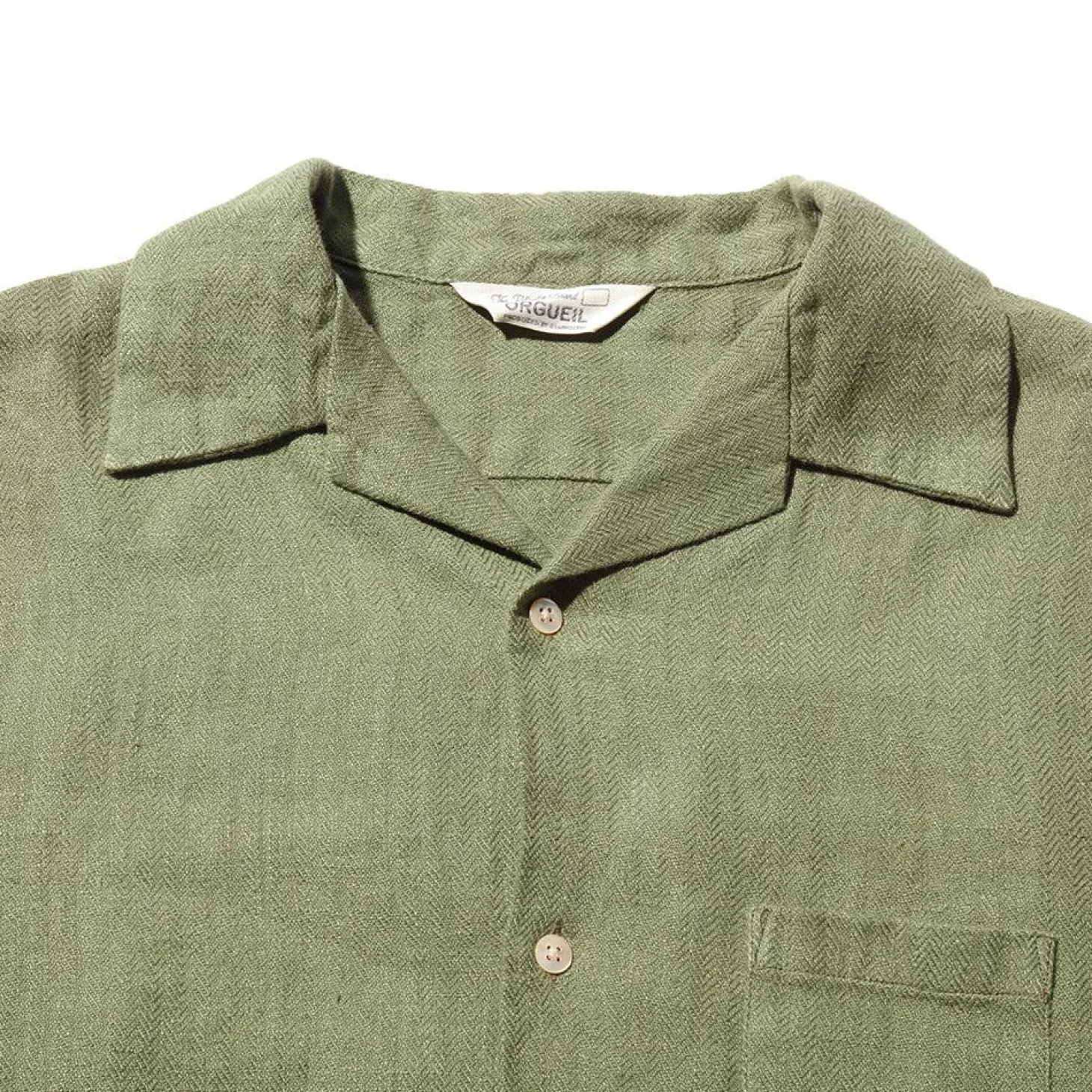 Cut in Japan from 100% linen herringbone that has been woven on vintage machinery at an extremely slow pace on vintage machinery giving the fabric a low tension, almost hand woven touch. A button front has been paired with a single chest pocket while the classic 50’s style open collar completes the look.