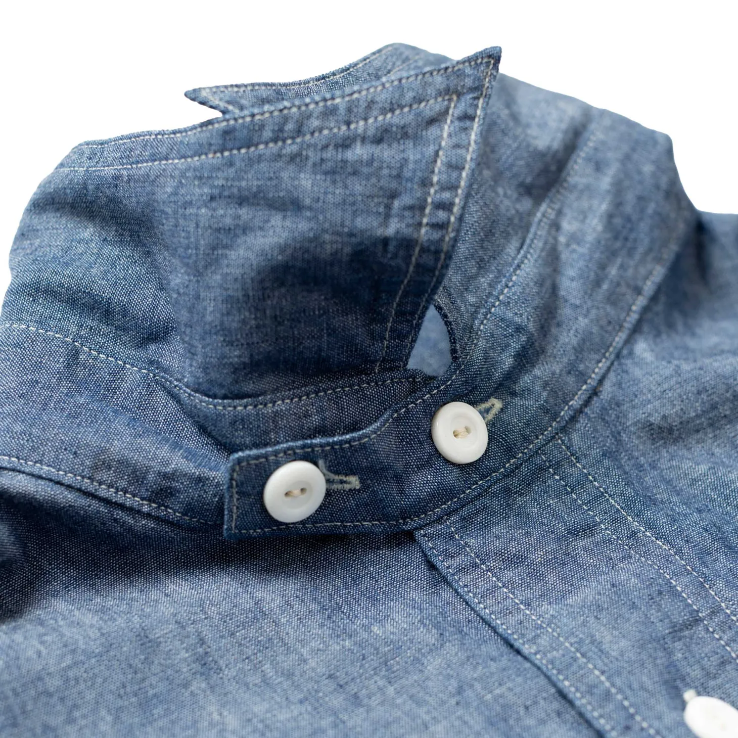 Cut in Japan from a washed Japanese Indigo cotton, the shirt features all the detailing found on these pre-1920’s style shirts. A 1/4 button placket has been paired with a regular collar and double throat tab, two symmetrical chest pockets as well as vintage detailing like chain stitch run offs and reinforced gussets. A curved hem & contrasting stitching throughout finishes of this classic style.