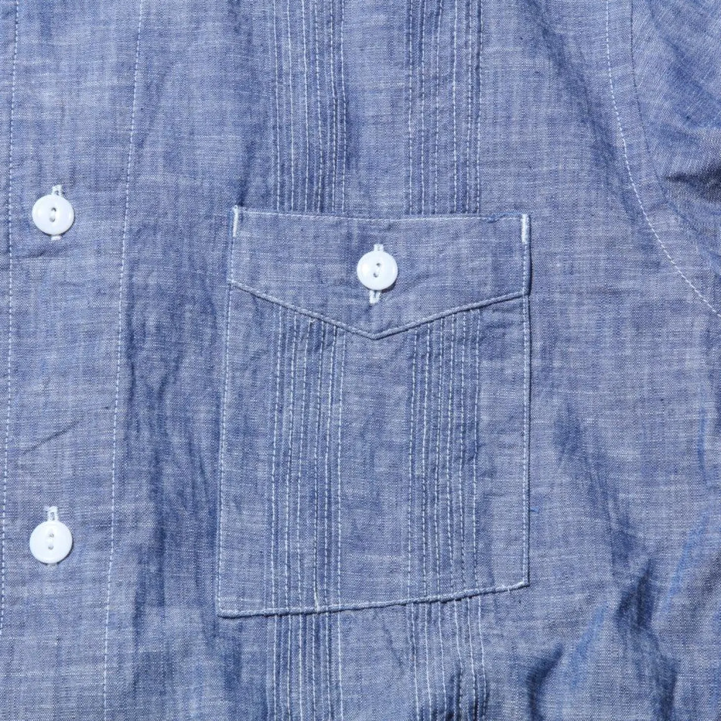 The Havana is cut from 100% cotton chambray in Japan. An open collar has been paired with two chest pockets and two hip pockets with button closure while intricately woven pleats feature on either side of button facing placket. The Havana has been finished with box pleats on the reverse providing the wearer with a traditional silhouette.