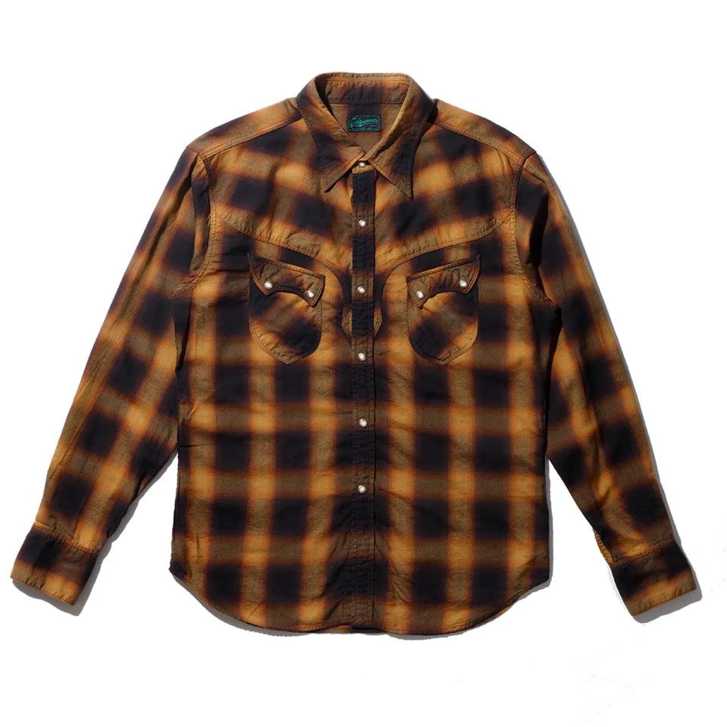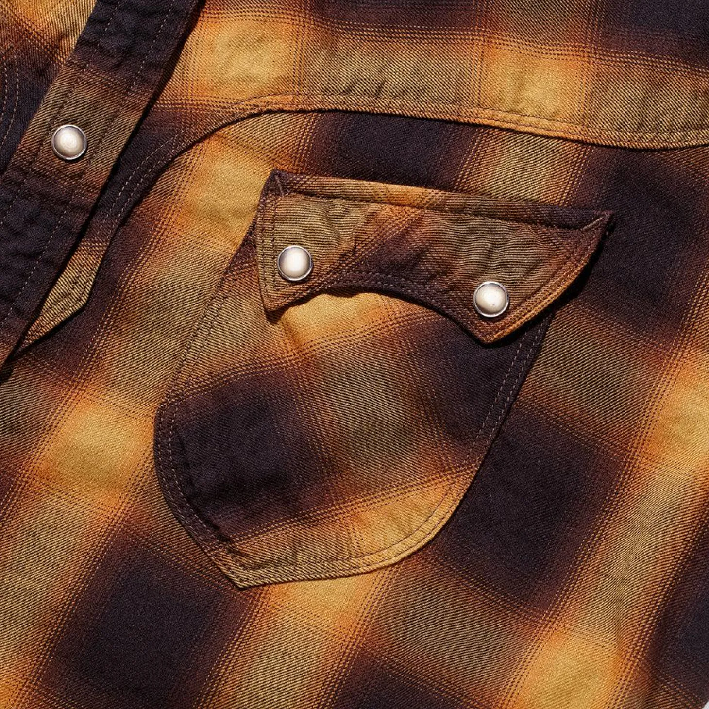 The slanted pocket flaps are sewn between the front yokes, complimenting both the front and back yokes, while mother of pearl snap buttons are used on the button front and cuffs. A truly unique take on the classic Westerner.