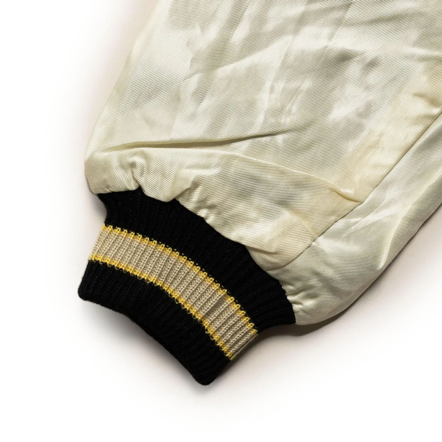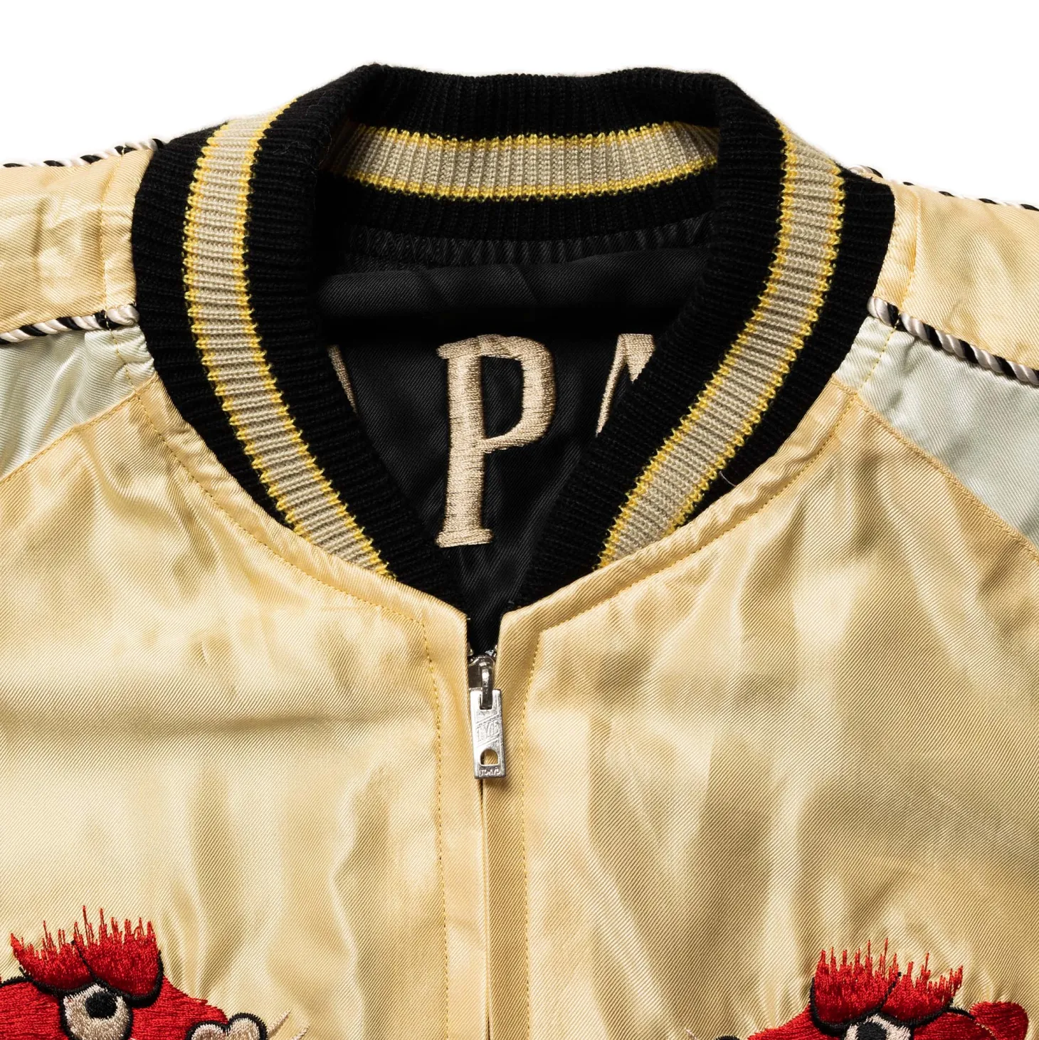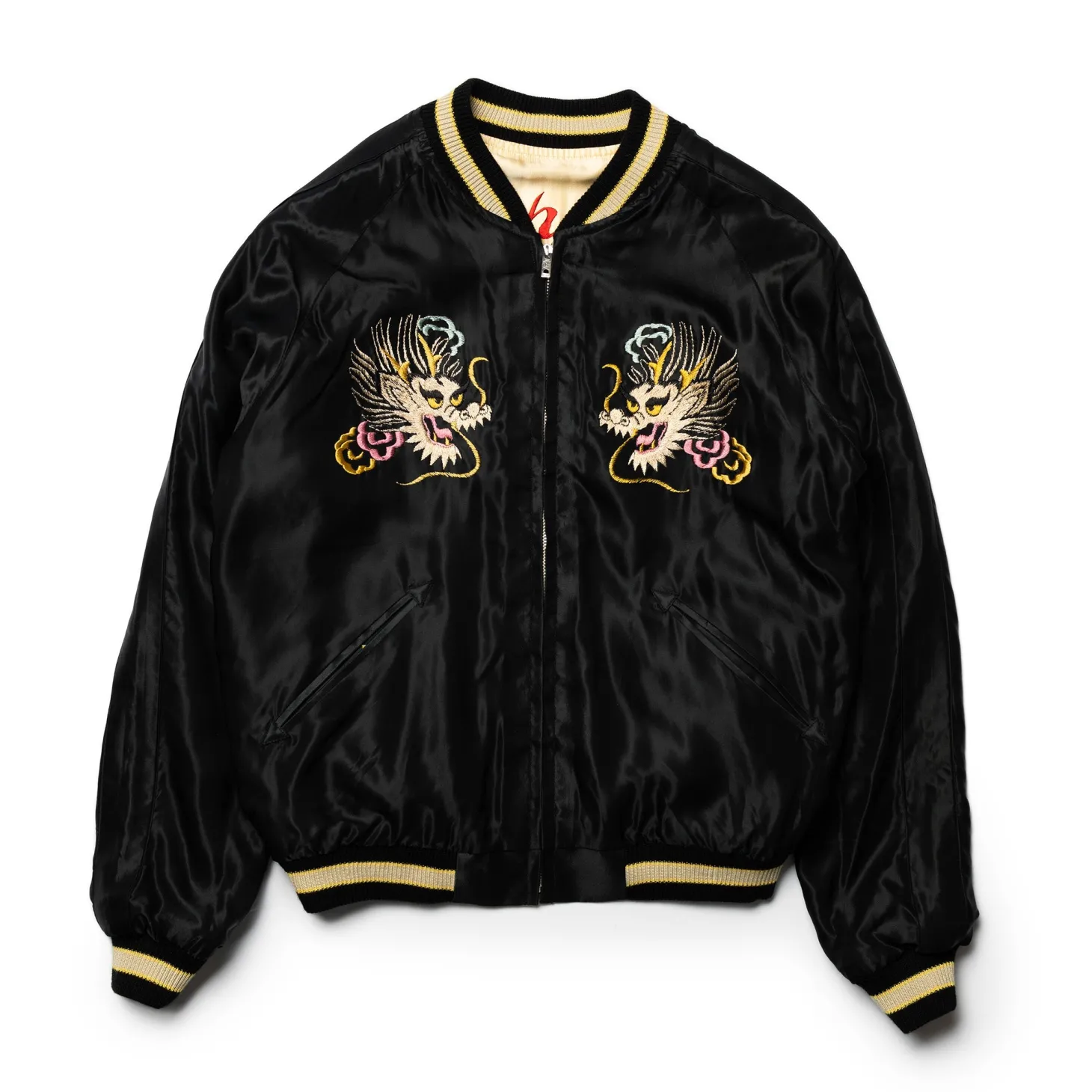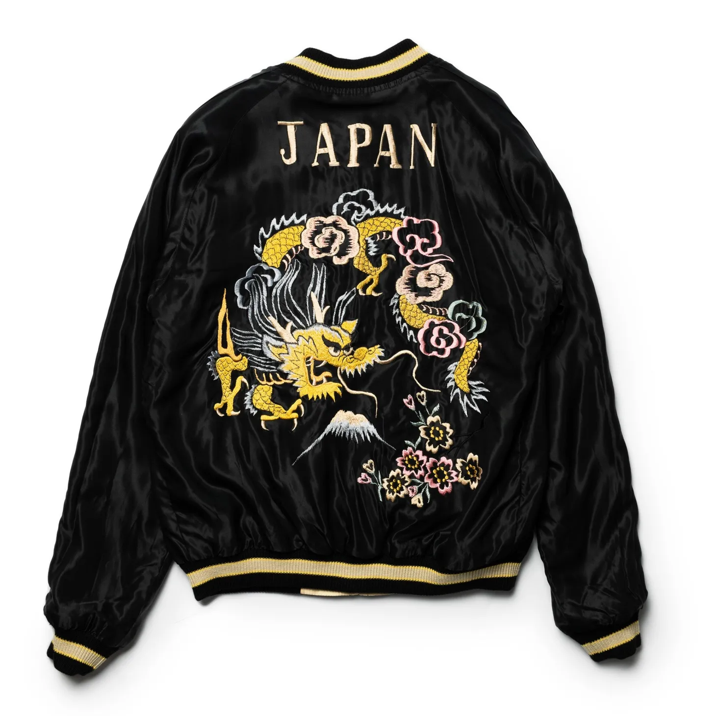 The roots of the Souvenir Jacket, or Sukajan in Japanese, can be traced back to American soldiers stationed in the Pacific following the end of World War II During the post-war occupation, American troops began using traditional Japanese designs and hand-stitching them into the backs of their jackets to commemorate their time in Japan Popular designs included Japanese (and Chinese) style dragons, cherry blossoms and trees Some would also opt for artwork that could have ranged from local maps to Geisha girls These pieces would often use rayon and silk