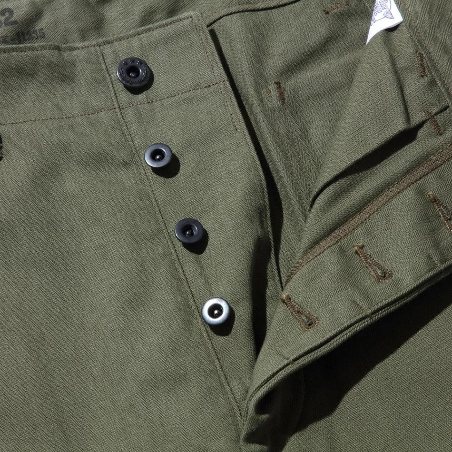 Here we have The Real McCoy’s N-3 Utility Trousers (Model 220), a classic piece of Japanese ‘American Casual’ reproduction clothing. First introduced in the 1940’s as part of 4-piece uniform issued to U.S Navy shore parties and usually cut from a herringbone twill cotton fabric in olive drab colour #7. The ‘N’ was part of clothing identification and contract issue (often seen as NXS) developed by the US Navy.