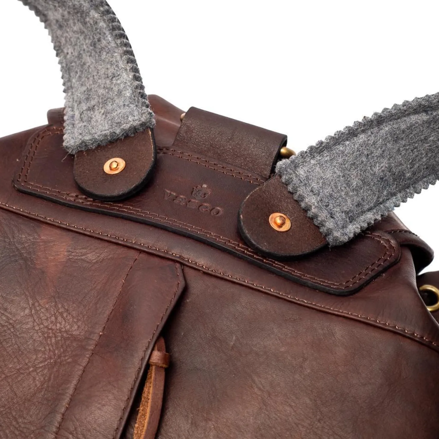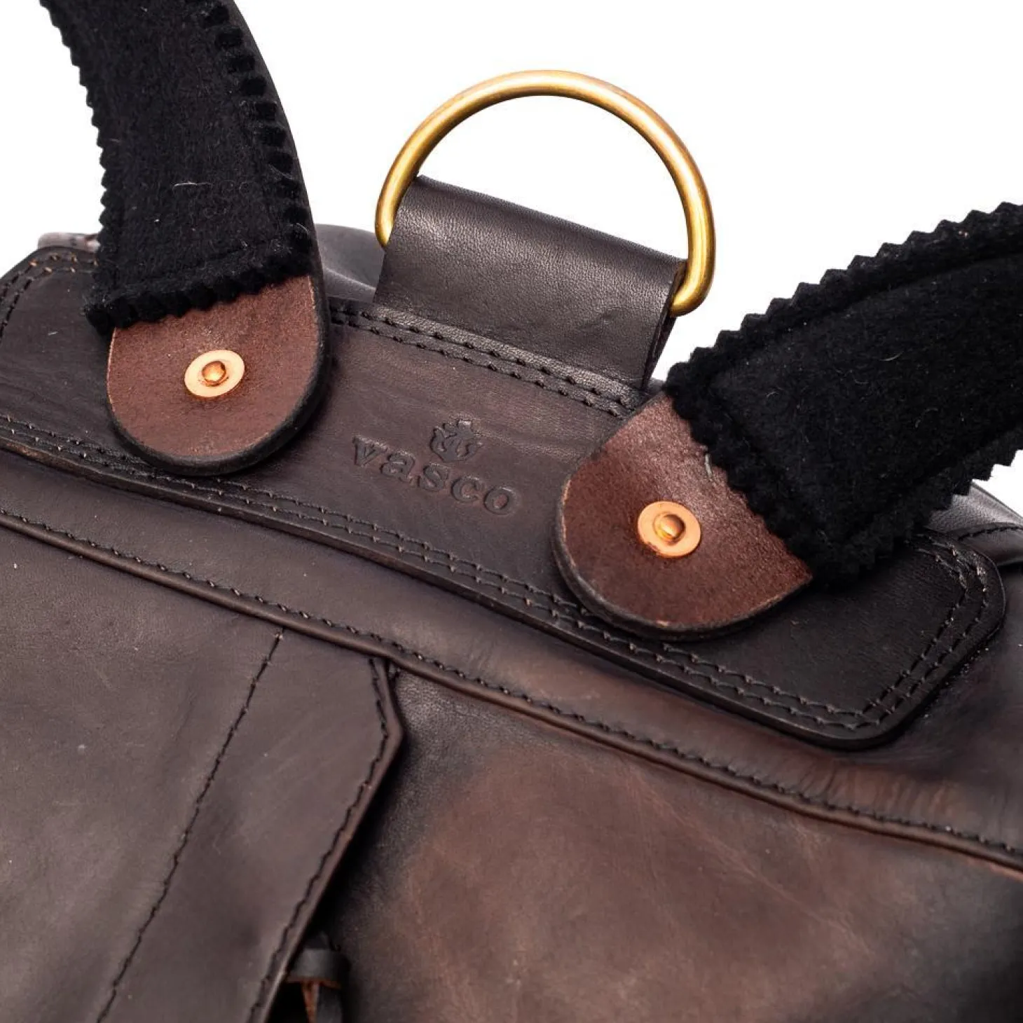 The Leather Army Rucksack from Vasco is inspired by vintage French La Fuma canvas rucksacks from the 1940’s and has been cut from a heavy duty cowhide leather in Japan sourced from the respected Himeji Tannery. This tannery is unique in using traditional hand dying techniques to vegetable tan the strong cow hide, which is infused with oils giving it a rich depth of colour and ‘vintage’ appearance.
