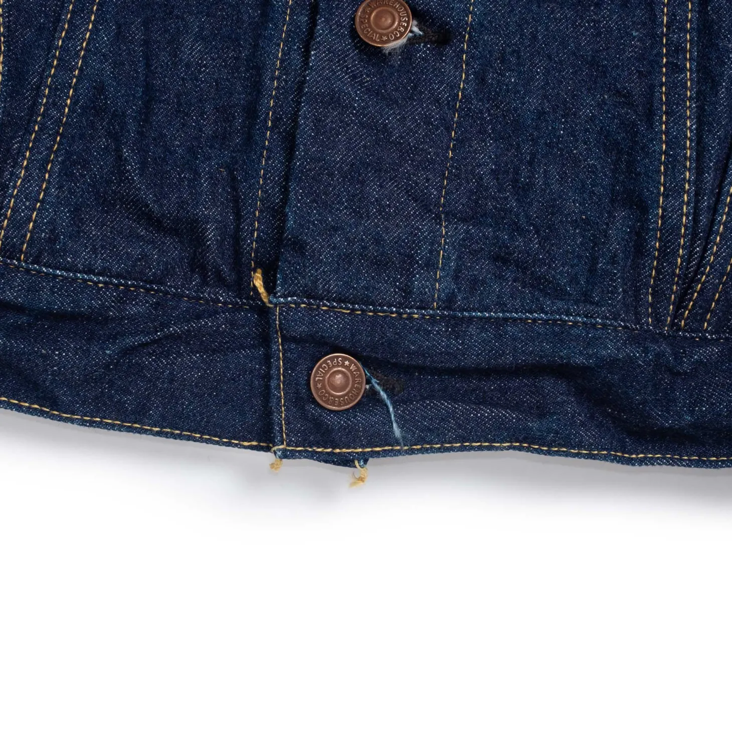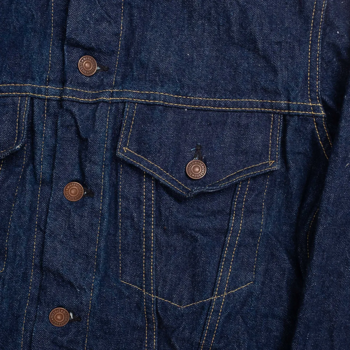 True to their authentic reproduction nature, Warehouse & Co have nailed this one. Cut from a 13.5 oz selvedge denim in Japan, the 2003 xx features the distinctive ‘V’ shaped stitching at the front, which at the time was a significant move away from the Type II Denim Jacket. Two chest pockets with button closure feature lighter weight denim behind the flaps (true to the originals) as well as copper brown buttons & yellow cotton thread used throughout. A period correct paper patch and side adjusters complete the look.