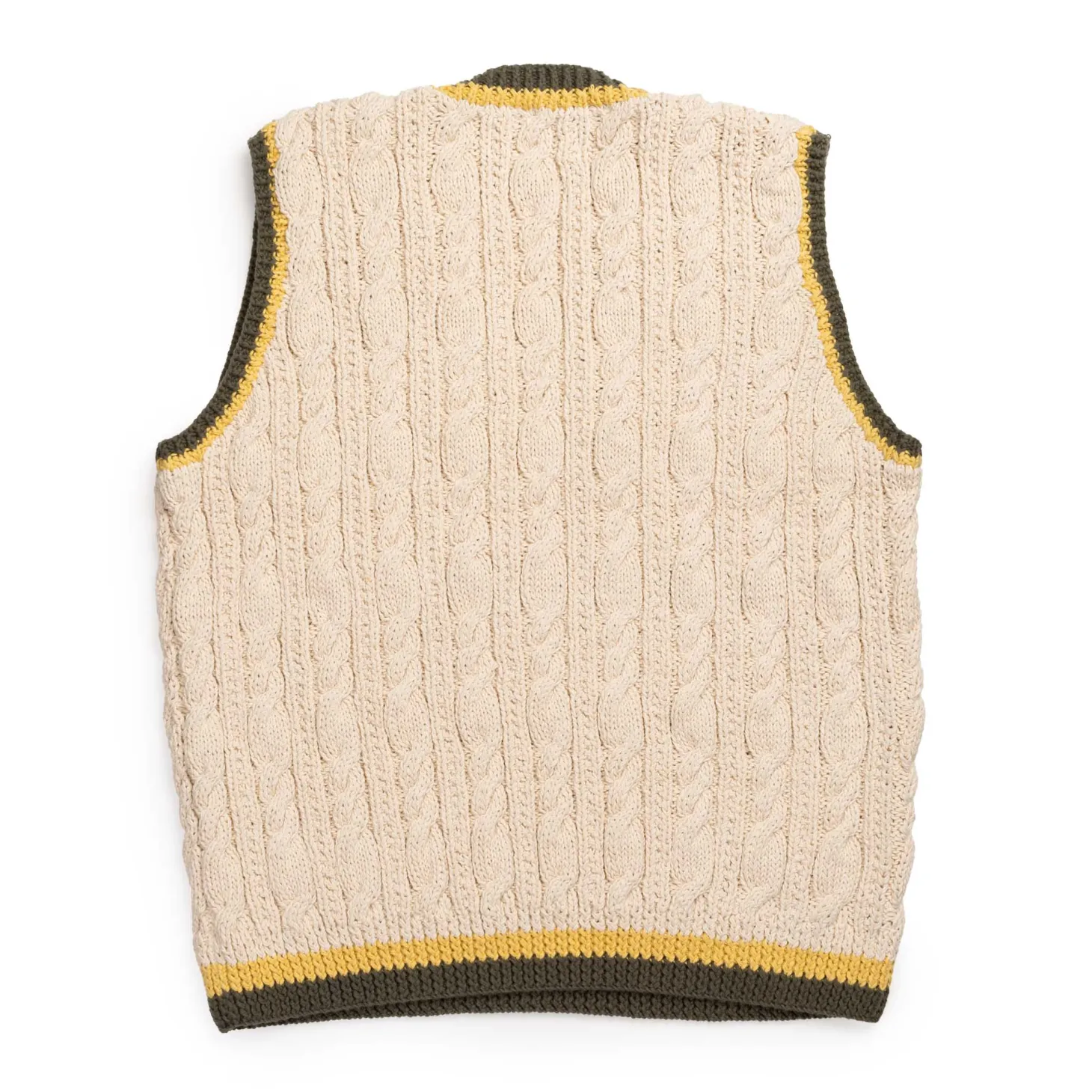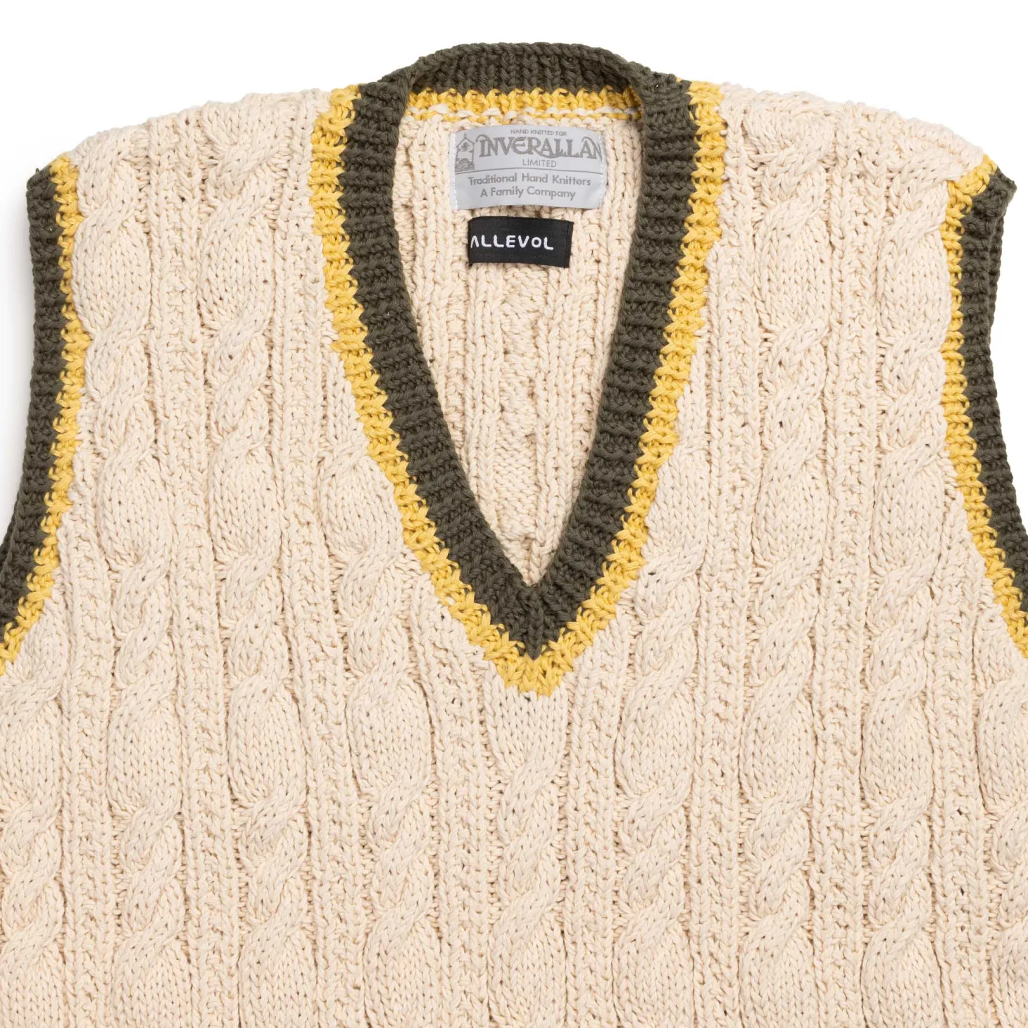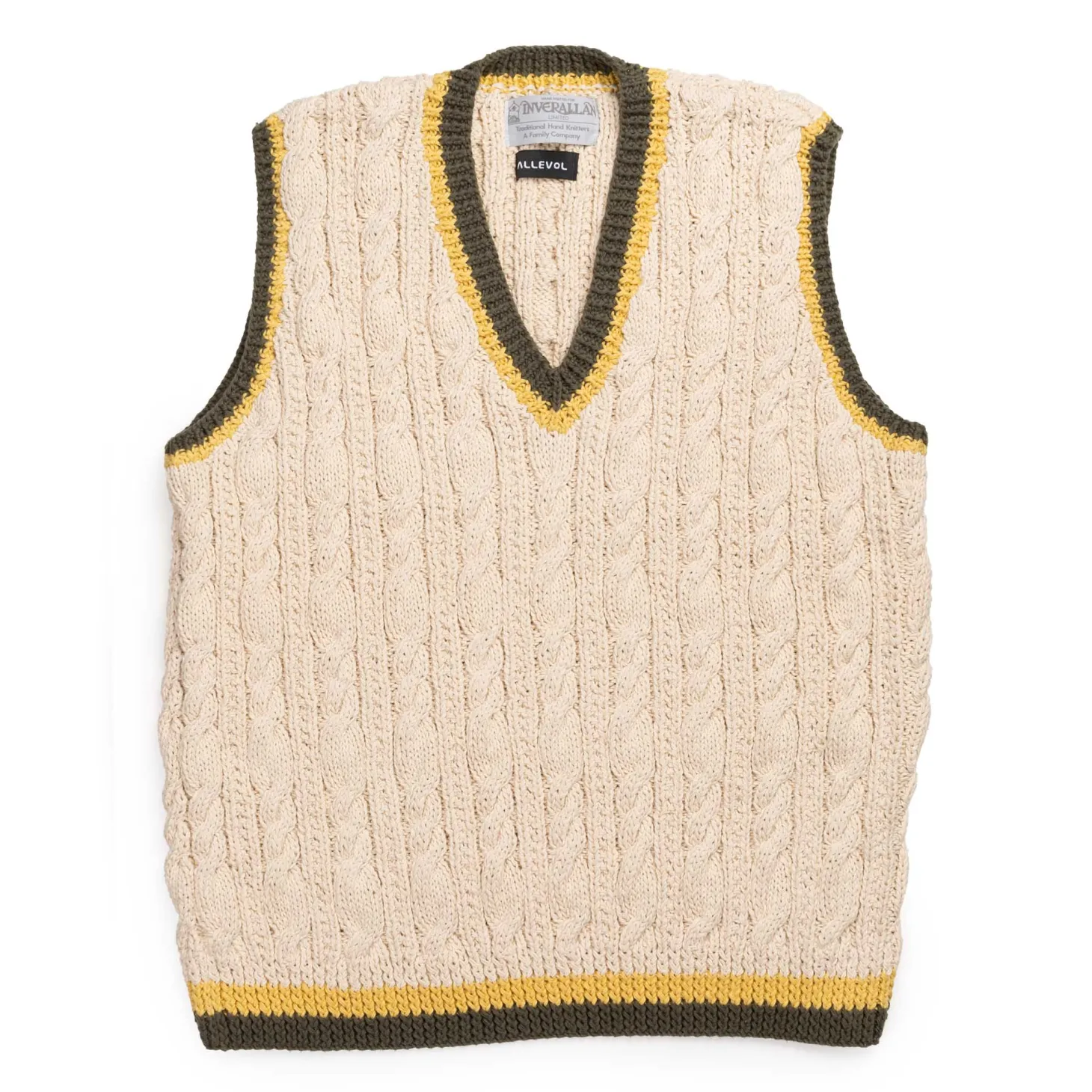 A collaboration with Inverallan of Scotland & Allevol, the Cricket Slipover is inspired by vintage style British Cricket vests. The Cricket Slipover is defined by its cable-knit pattern, with distinctive v-neck & striped trim, traditionally representing school or club colours. Hand-knitted from 100% cotton in Scotland, the chunky knit yarns provide a sturdy handle to this classic piece of British inspired Sportswear.