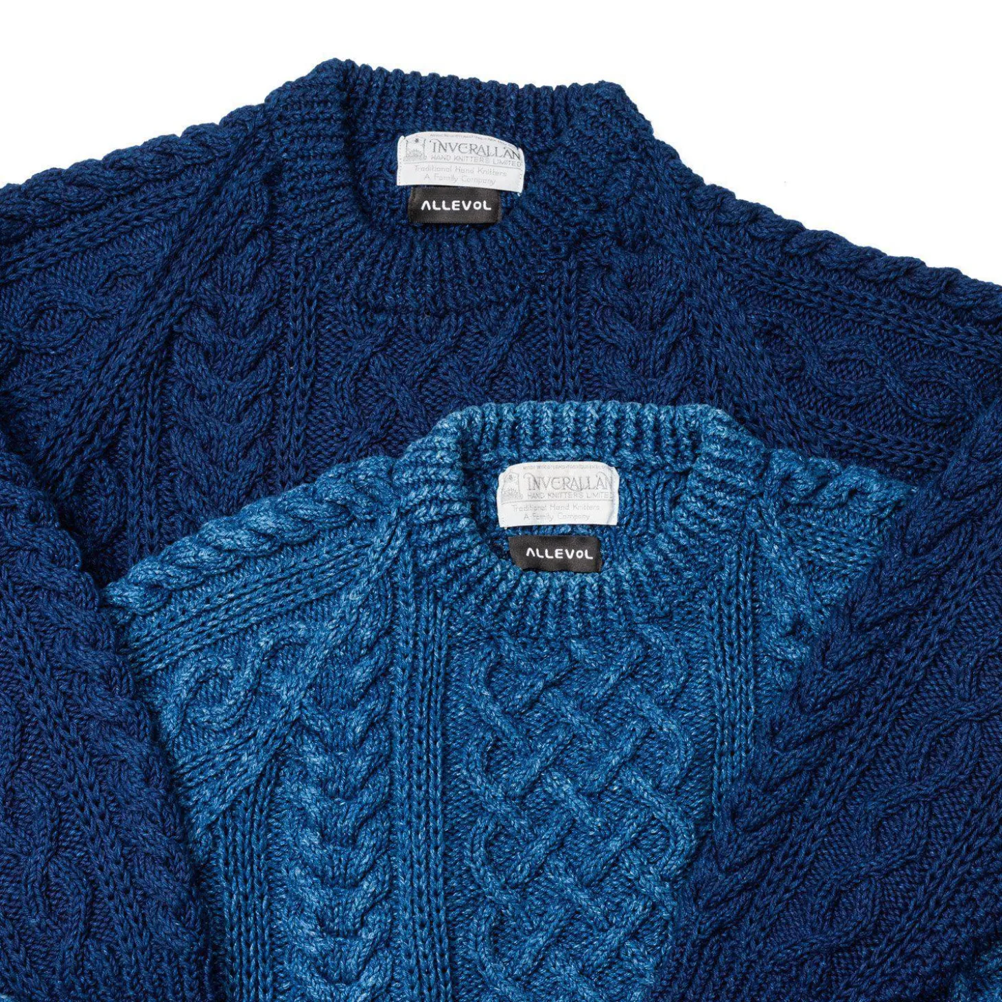 A collaboration between Allevol and Inverallen of Scotland. All pieces are limited in no. and hand knitted to a traditional cable knit pattern, in thick indigo-dyed cotton, which over time, will fade like a pair of jeans