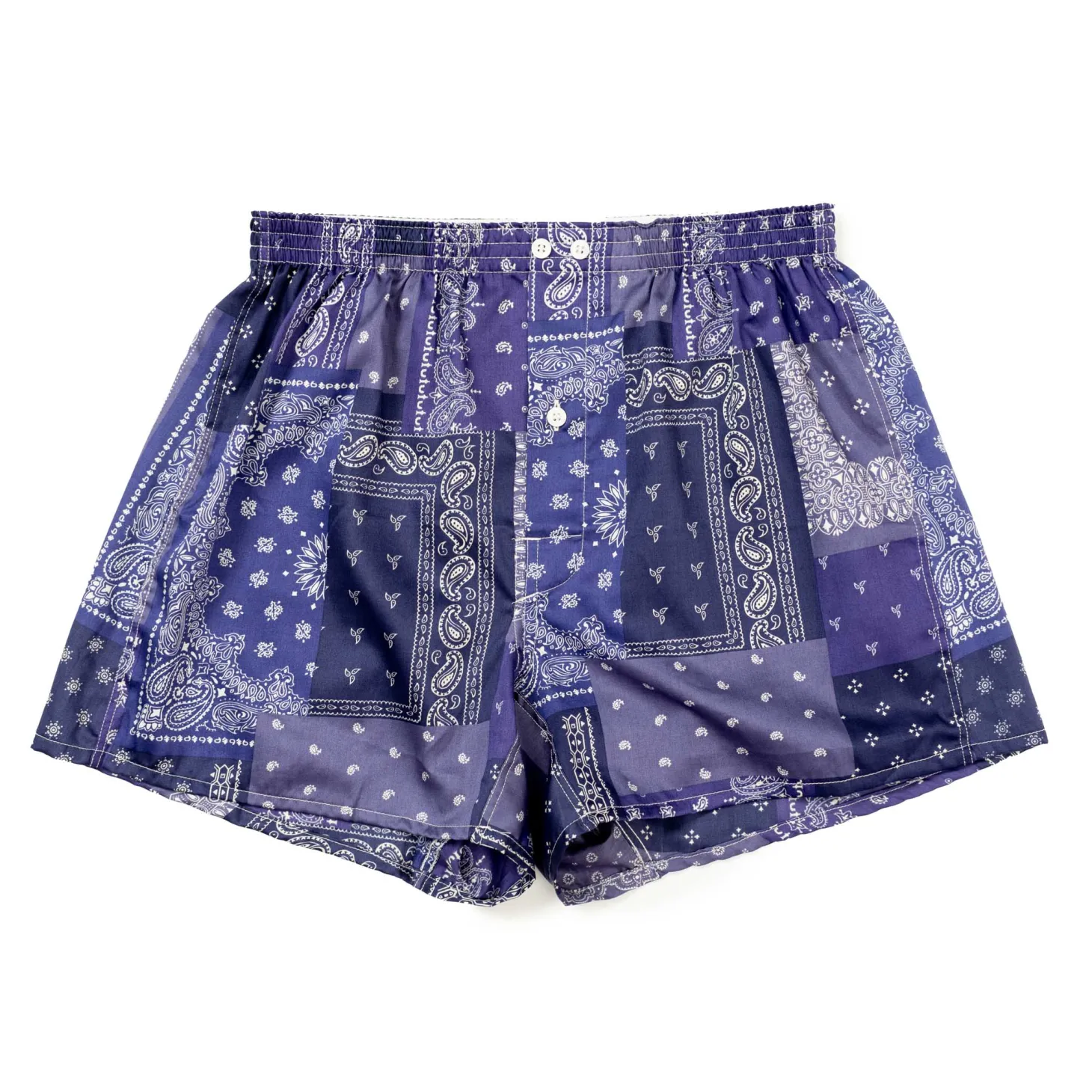 Using a printed Paisley design in a patchwork inspired by traditional Japanese boro patchwork techniques. The Anonymous Ism Boxer Short is cut from a fine satin cotton, with a specially designed elastic waist band, featuring bumps to help keep them in place, these boxers have a special under-carriage gusset for maximum freedom and comfort.