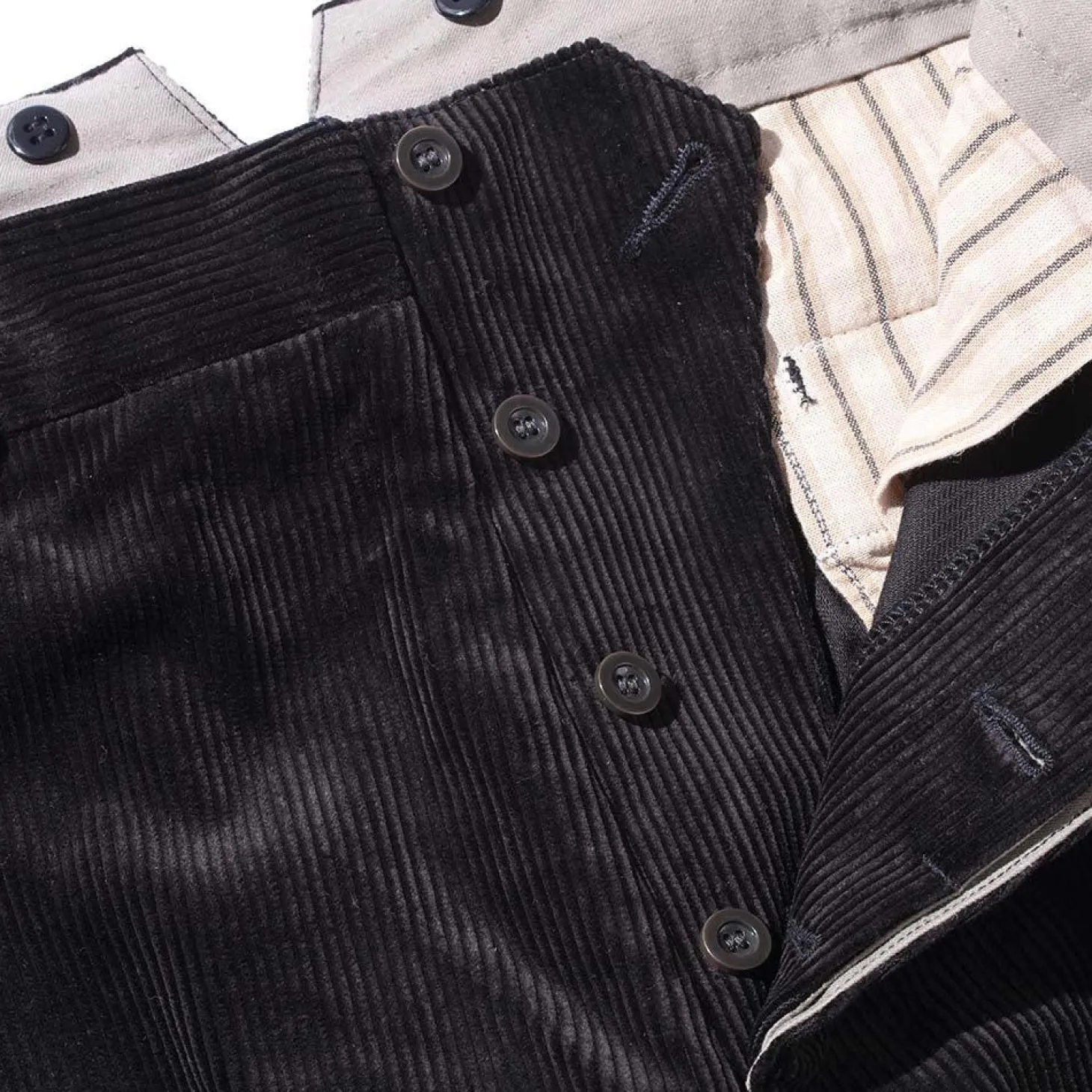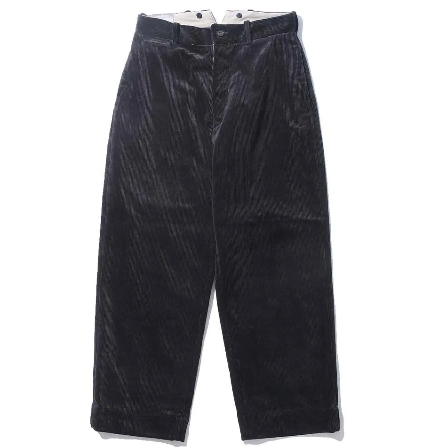 Here we have corduroy Hi Back Trousers. These are an old-school, traditional trouser ubiquitous with Belafonte and heritage, workwear style.