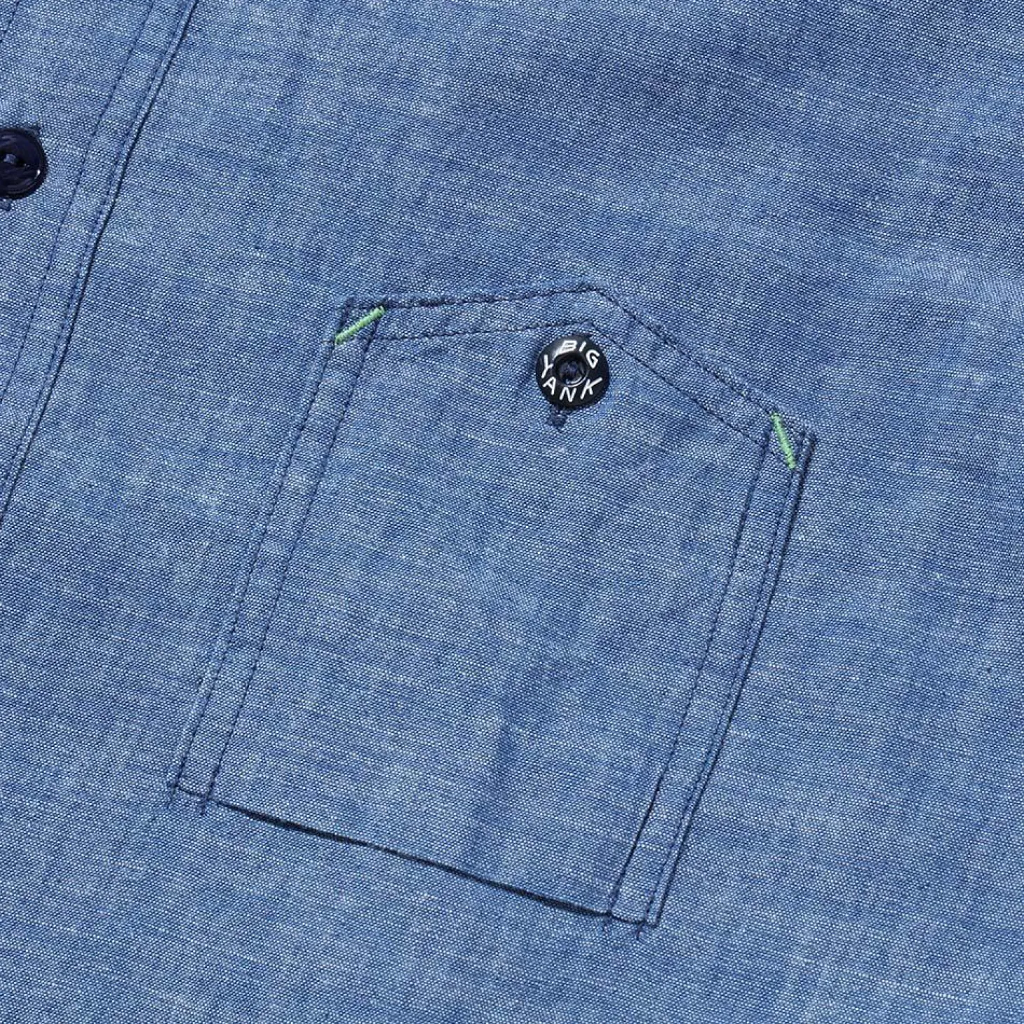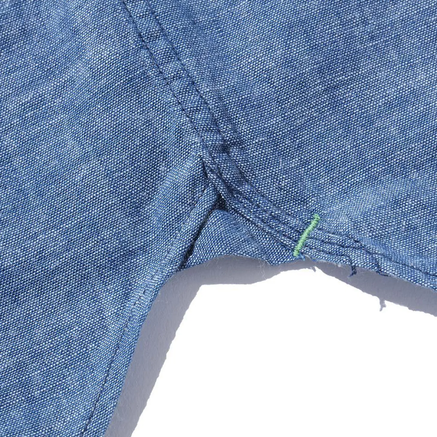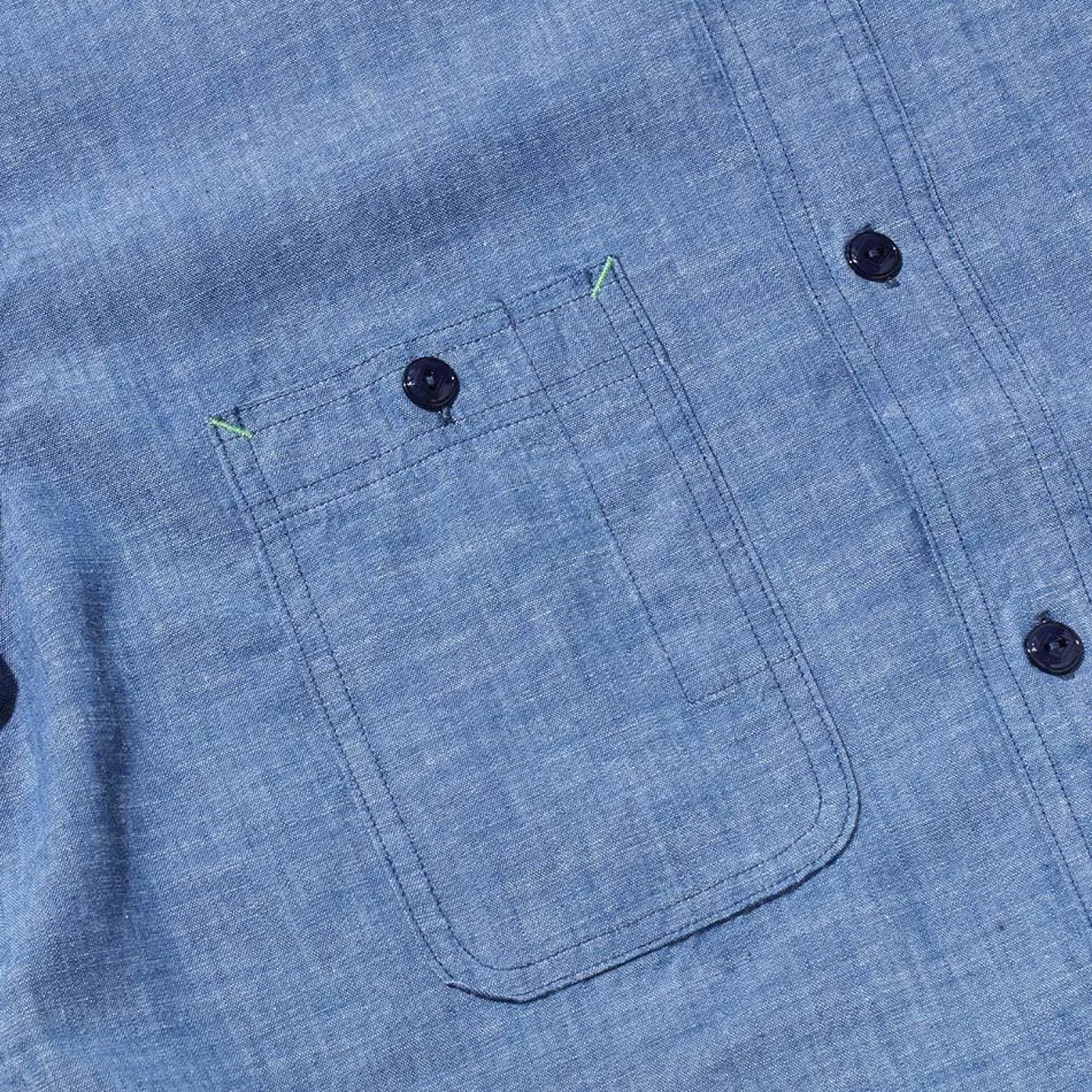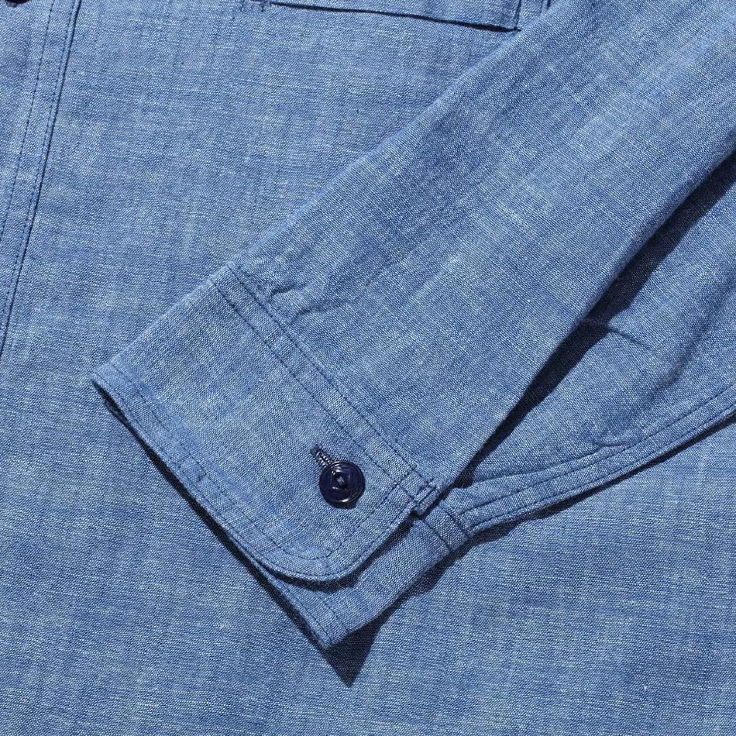 Cut from 100% cotton chambray in Japan, the 1942 Work Shirt features archetypal Big Yank construction, with tonal stitching, bar tack reinforcements throughout, storm cuffs, urea buttons, a single branded aluminium button, action elbows, urea buttons, and the iconic patented asymmetrical Gacha pockets, one designed for a pen and the other a pack of cigarettes (or whatever you like, really).