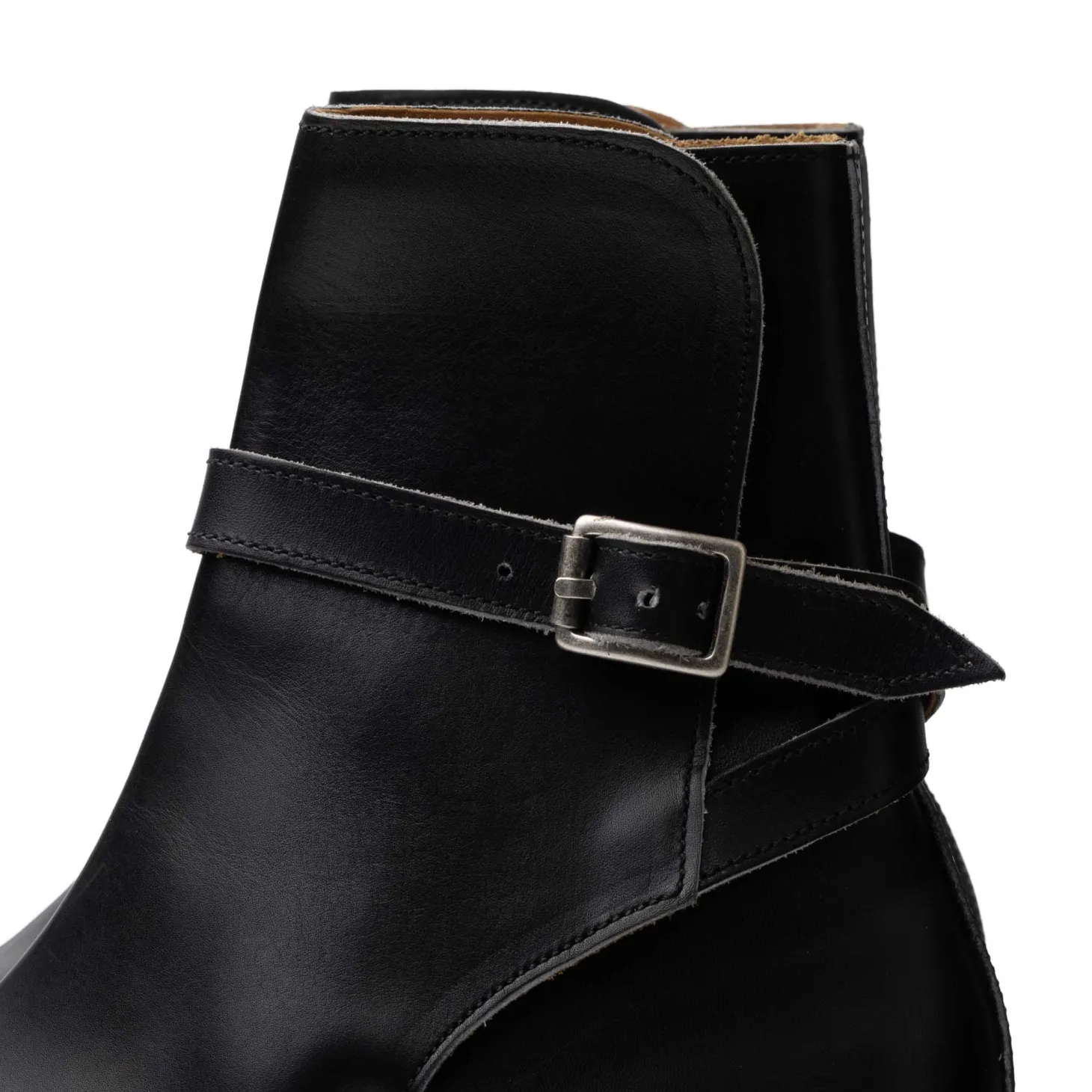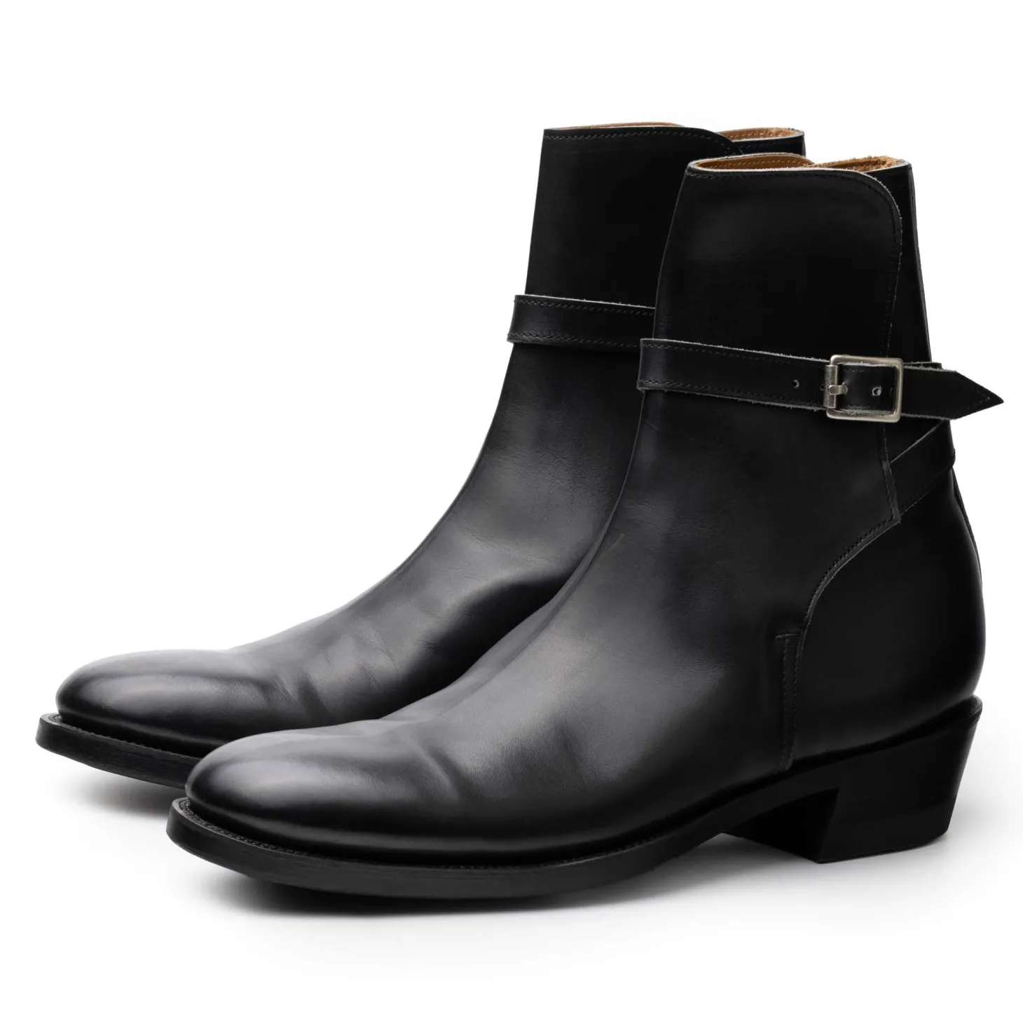 The calfskin uppers are put together in three sections, with each section expertly cut by hand. Put together with intricate, tonal stitching, the Jodhpur boot also features a belt closure where two halves cross one another in an ‘X’ shape, before looping through to the outside shaft and finished with a brass buckle adjuster.