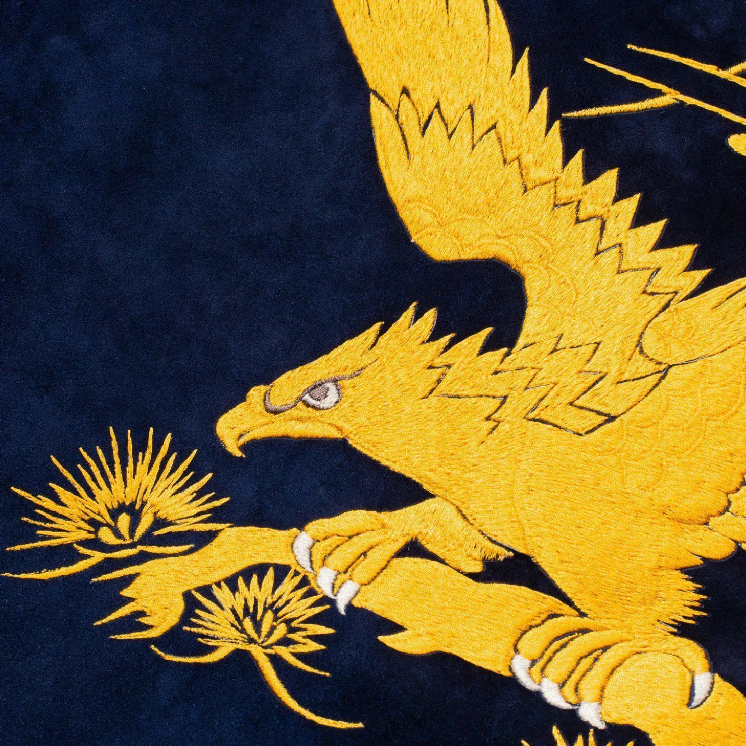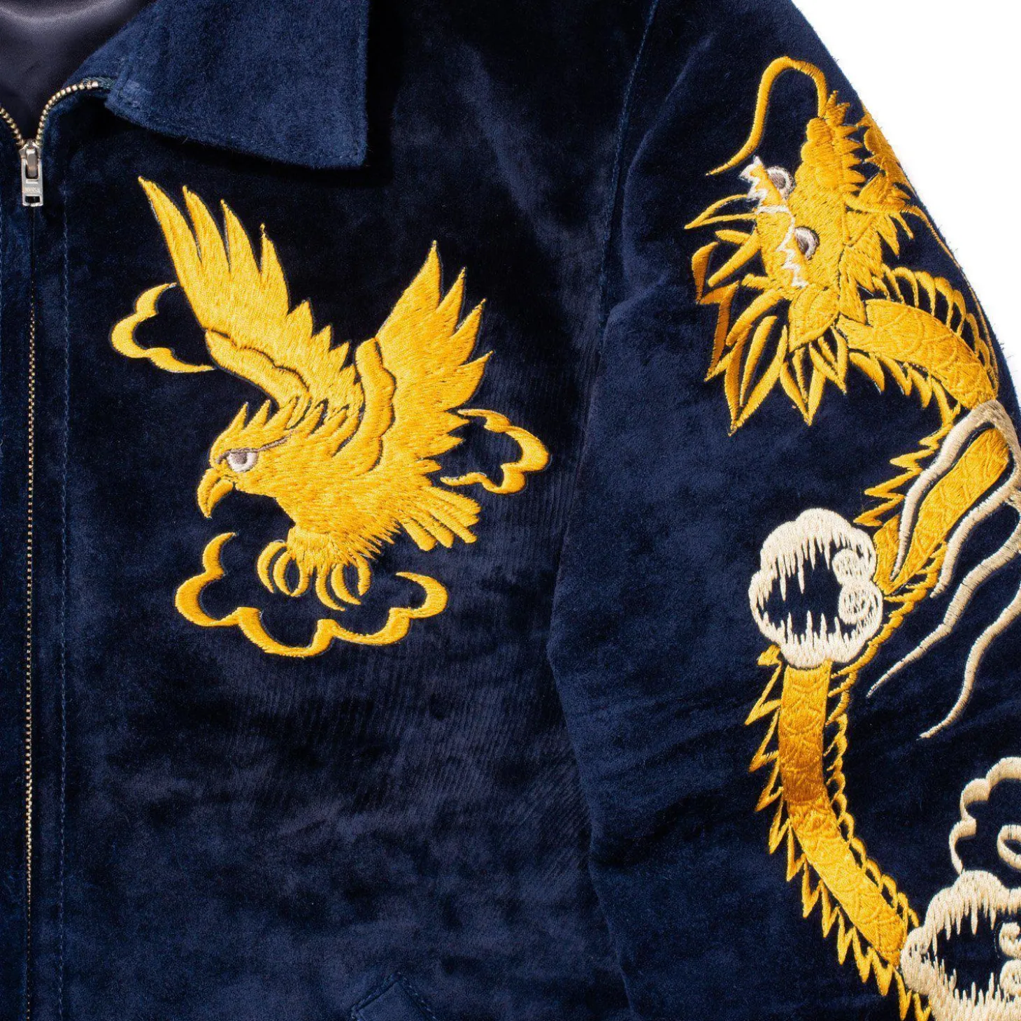 Immediately striking, the imagery on the jacket has been embroidered by hand and showcases the “Kiryu yokoburi ” embroidery technique ( a traditional craft in Kiryu City, Gunma Prefecture) This is carried out by highly skilled craftspeople who are incredibly well versed in the ancient embroidery technique The front is filled with golden hawk embroidery on either side, the sleeves feature golden rising dragons and the back has a hawk perched All in all an incredible piece of art