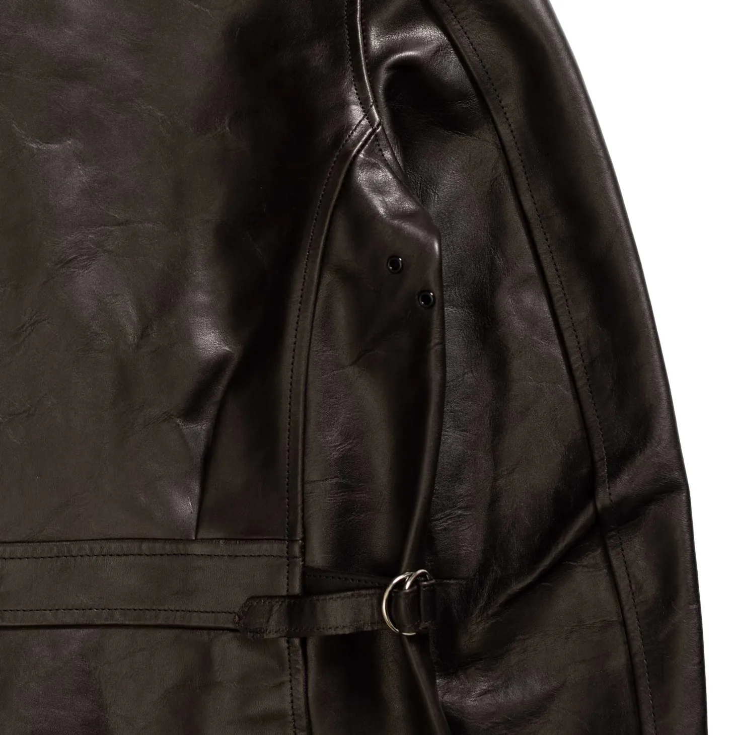 Each jacket is hand-stitched in their Tokyo studio with great skill, using a fine stitch-count which is extremely hard to achieve on leather manufacturing. The Joseph has been produced with the same sewing techniques as seen on vintage leather jackets to enhance the puckering through the seams creating wonderful, subtle areas of character that run through each garment.
