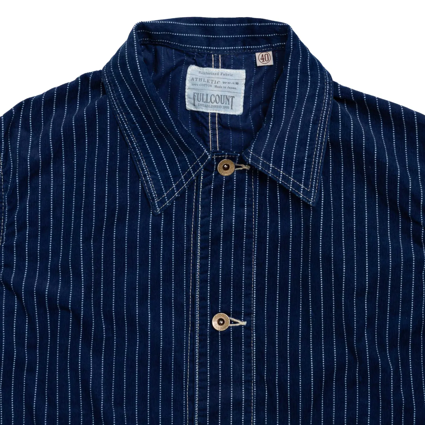 Full Count have paired indigo-dyed corduroy with a classic wabash stripe pattern to elevate this classic piece of utilitarian workwear. Using a discharge dyeing process, where the dotted white stripes are created on top of the indigo-dyed corduroy base.