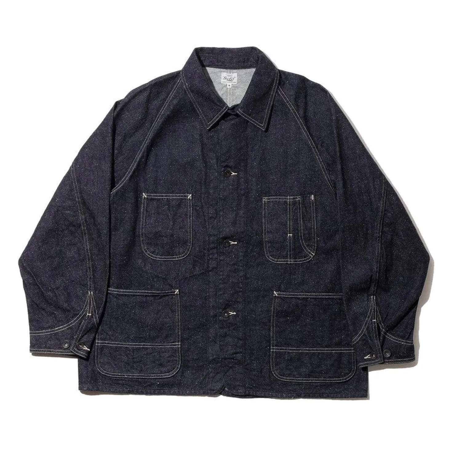 The Jacket features raglan sleeves for ease of wear while a button front has been paired with two lower pockets and two chest pockets. The buttons used are WWII style laurel wreath, painted black that will chip & age nicely over time. A relaxed fit completes this great take on a coverall jacket.