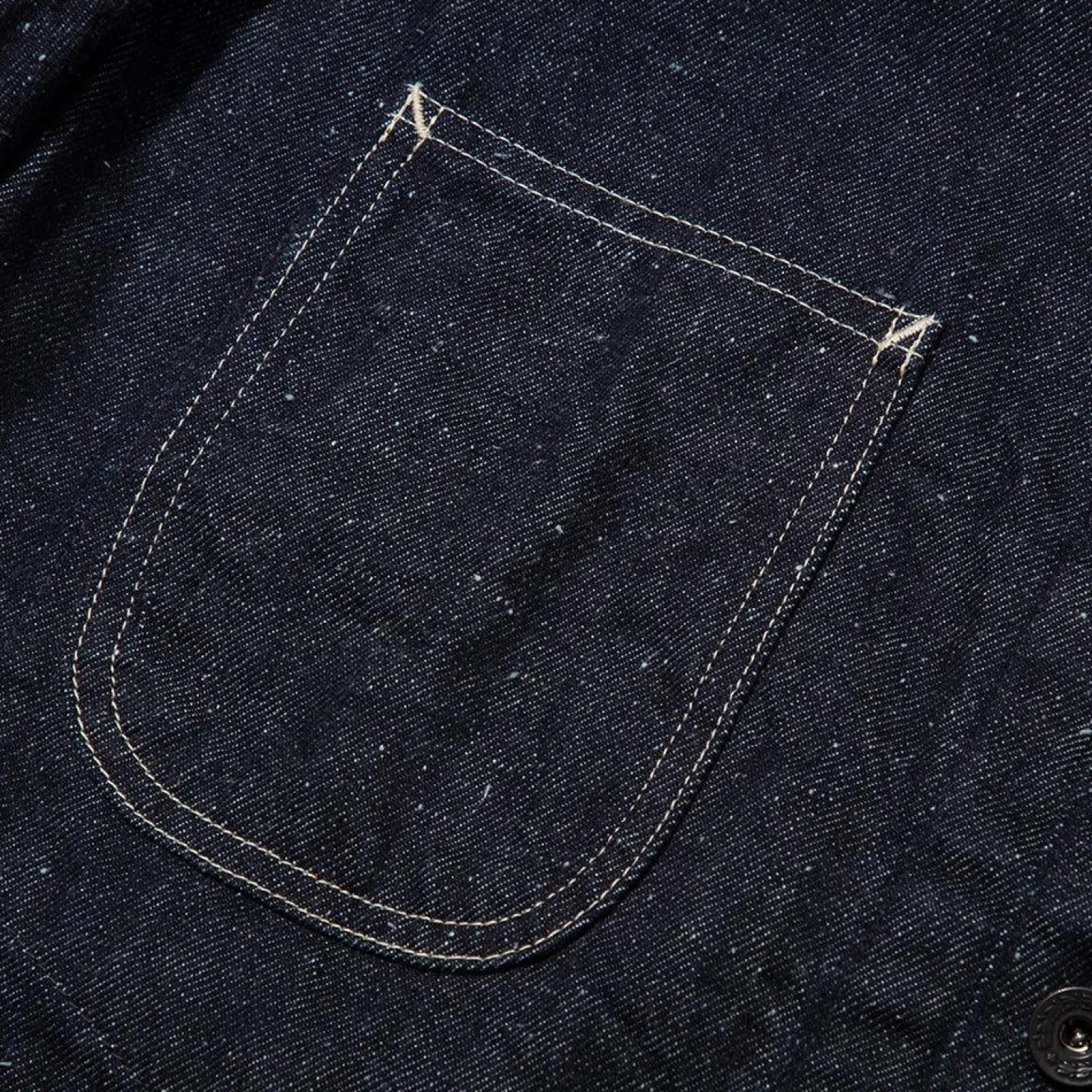 The Denim Work Jacket is inspired by vintage style work Jackets from 1920’s-50’s. Cut in Japan from 100% cotton this Denim Work Jacket utilises recycled suvin cotton yarn waste. Suvin is known as one of the most luxurious cottons in the world and certainly one of the softest. Developed in-house by Toyo, this recycled suvin 11.5 oz cotton has a slubby and unique texture, a distinctive feature of suvin.