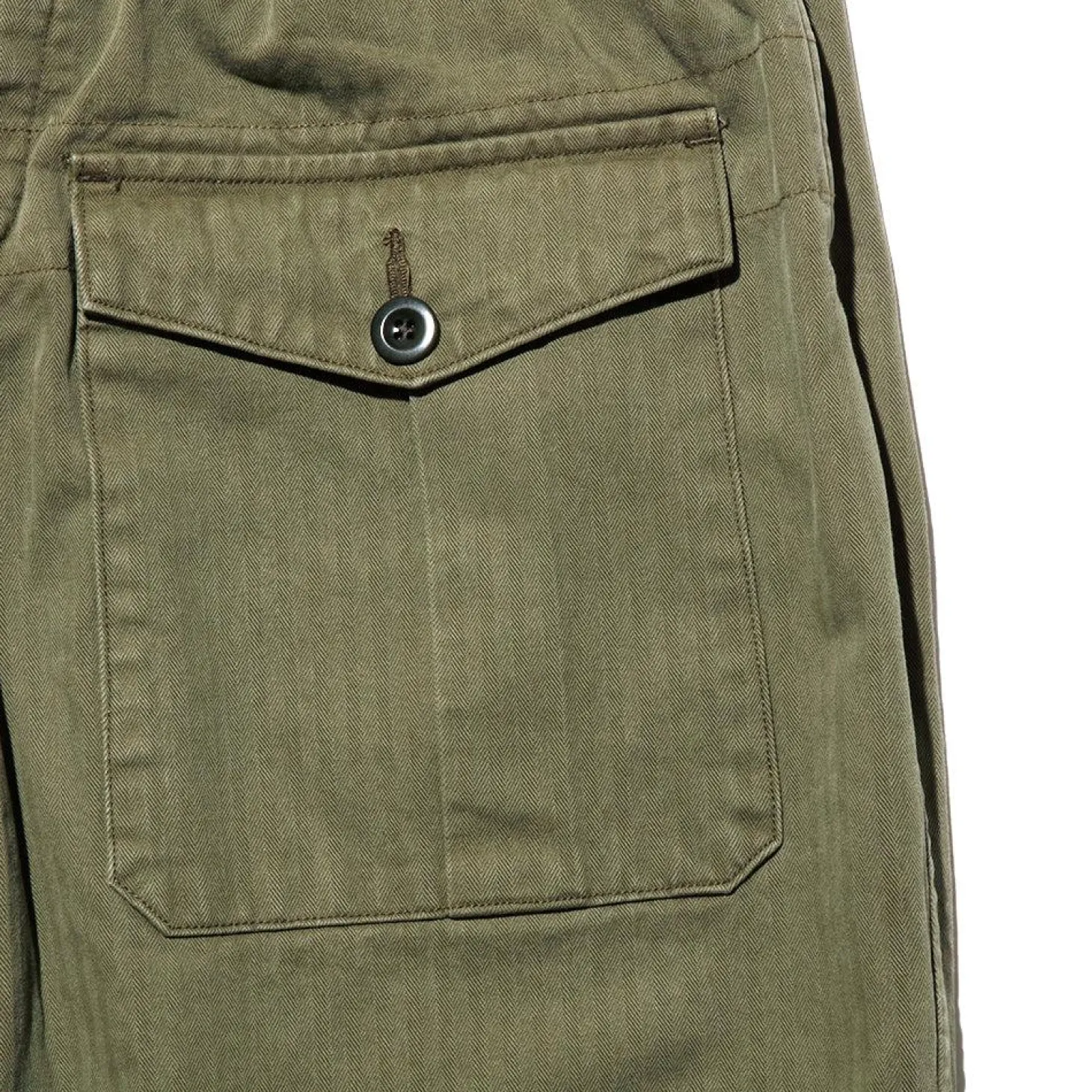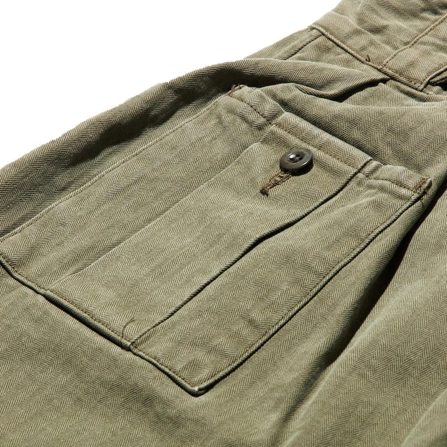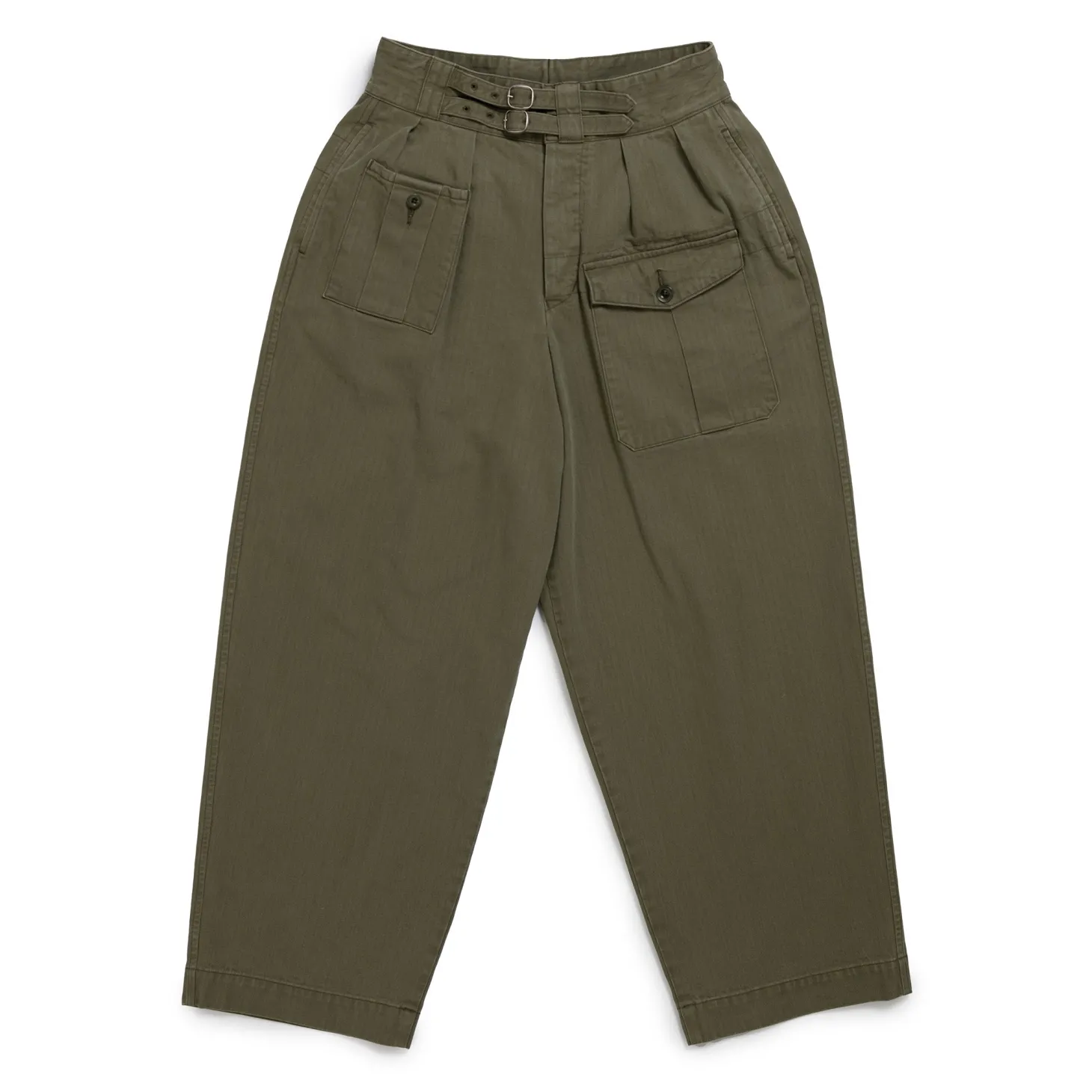 The Gurkha Trouser is defined by its double-pleated front and high, cummerbund-style waistband with buckle fastenings. Cut in Japan from 100% cotton, these are available in two colour-ways. The HBT has a vintage feel to it, while the trousers have two front pockets and one rear pocket. Double pleated front and buckle closure have been paired with a roomy, relaxed tapered silhouette for a modern, clean look.