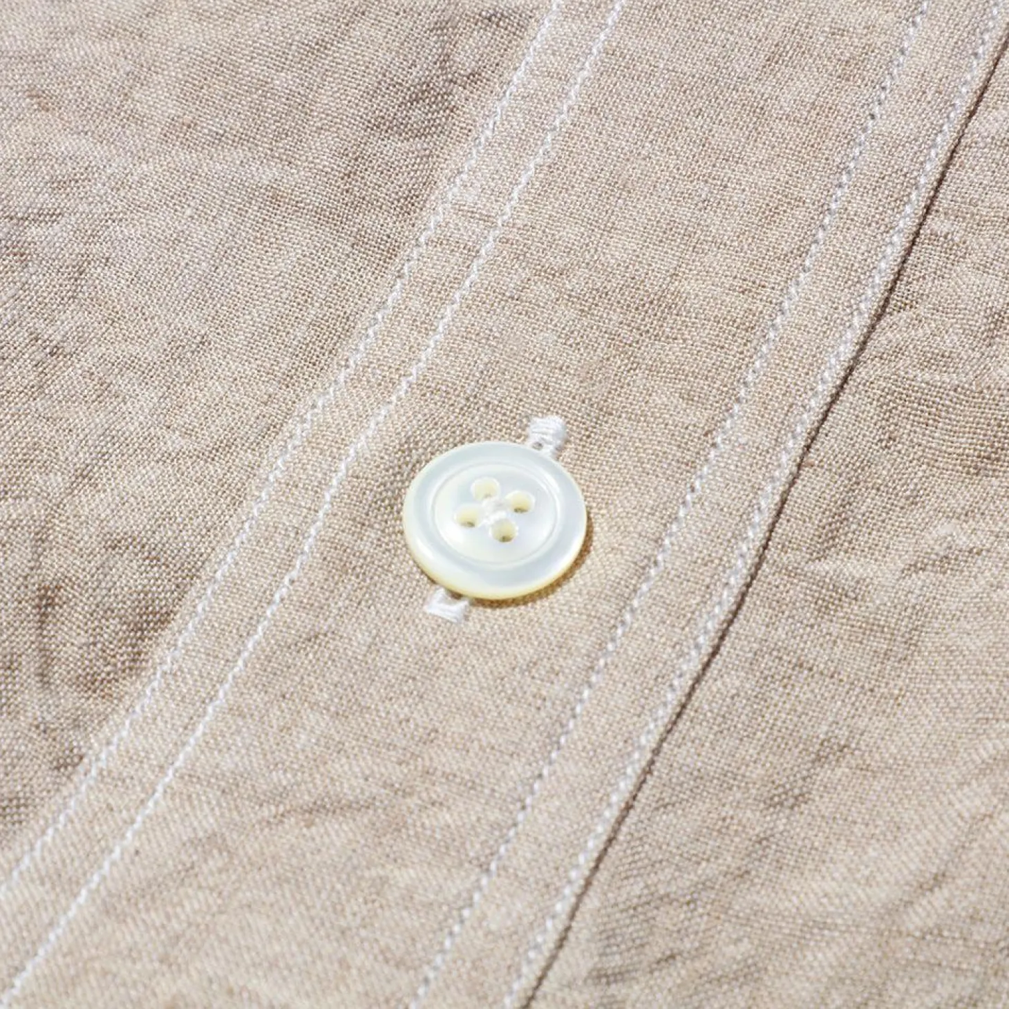 The Dungaree Shirt from Haversack is new for SS24 and has been cut from 100% linen in Japan. The shirt features a band collar with a four button placket, contrasting stitching throughout and one large patch pocket on the left and one large double patch pocket on the right. A curved hem and relaxed fit completes the look.