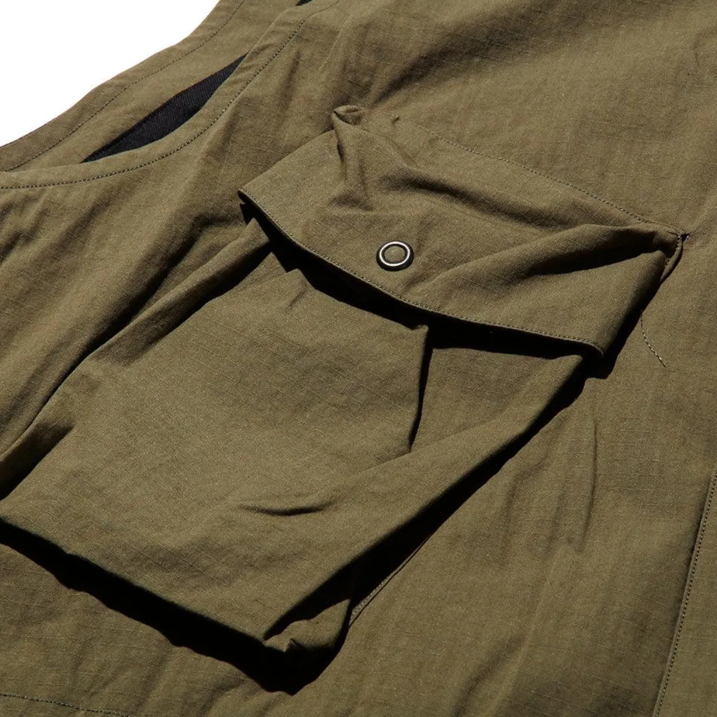Cut in Japan from a 50/50 cotton nylon ripstop, this Military Vest is extremely lightweight, making it the ideal layering piece. The Vest features two chest gusseted pockets with snap closure and two lower pockets with snap closure. A snap button front with concealed zip front front and a loose stand collar have been paired with a drawstring waist to aid fit.