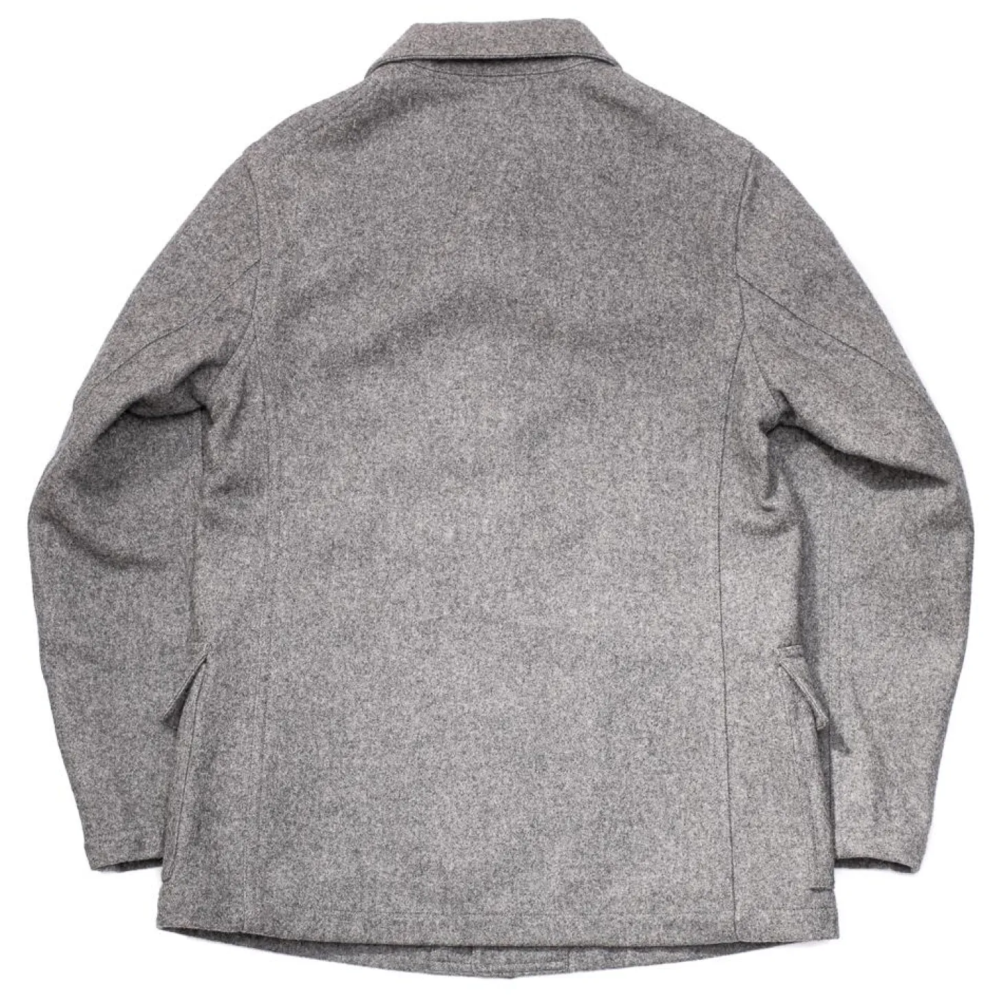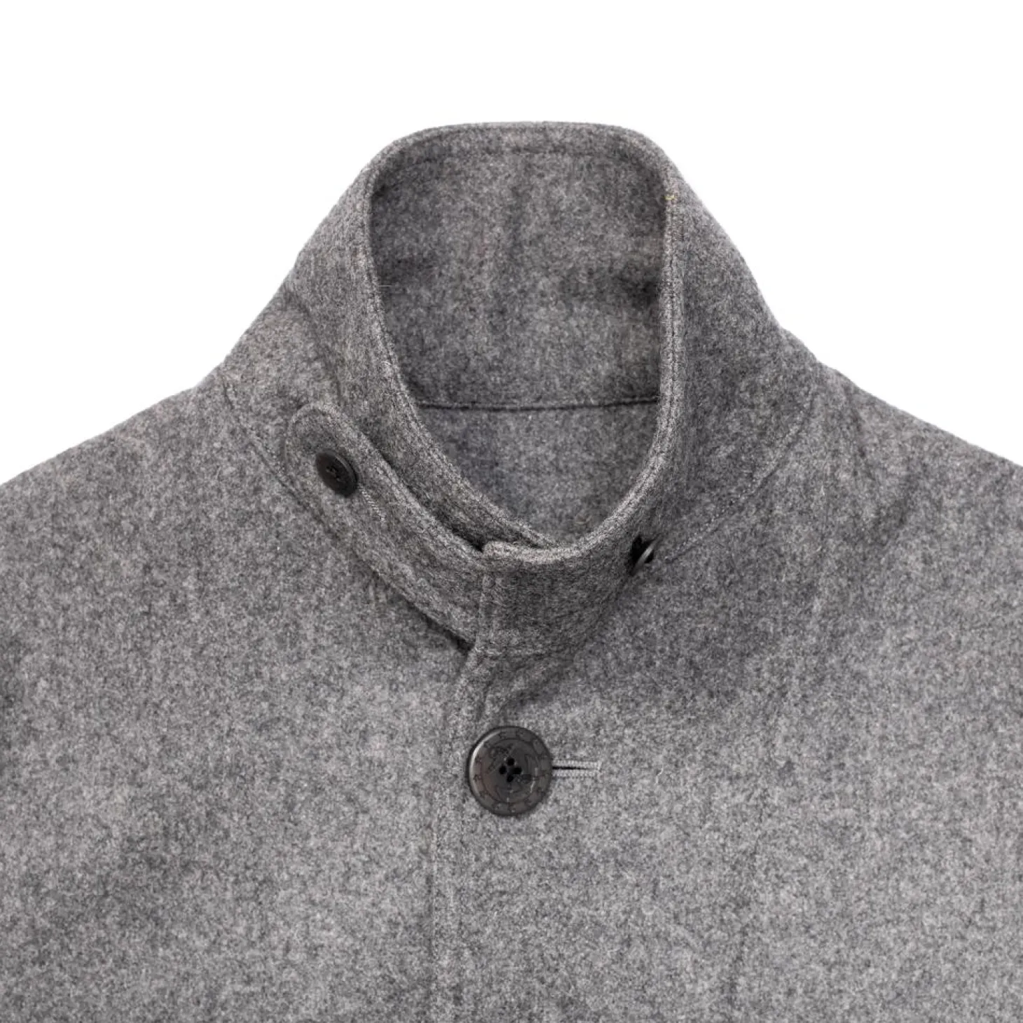 - John Gluckow has left the pattern unchanged but produces the coat in a marl charcoal grey melton wool instead of the standard black or deep navy blue. The button-front boasts the recognisable 13-star fouled anchor buttons design in ivory corozo nut, and two buttoned flapped hip pockets. The angular collar lays flat against the body and fastens up into a funnel around the neck.