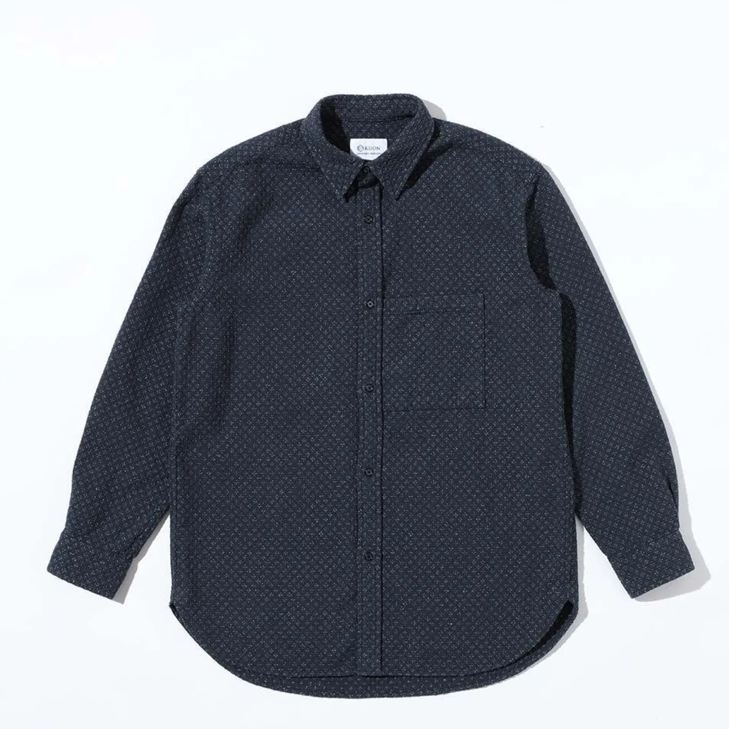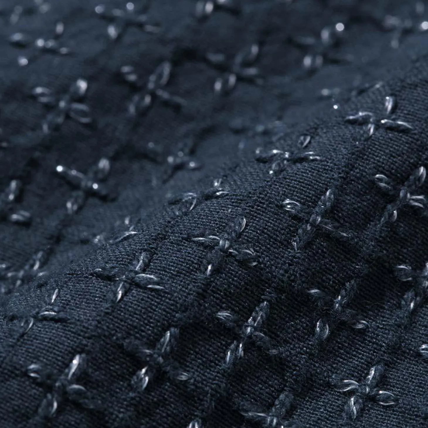 Here we have the Regular Collar Cross Sashiko Shirt, forming a key piece from Kuon’s SS22 collection. Cross Sashiko is a high-density double-woven Sashiko-ori fabric with 2-ply 40 count yarn in the warp and 20 count single yarn in the weft. Although difficult to machine weave, Kuon have made this possible by altering the speed and slowing the machinery down to almost hand sewing pace, resulting in a fabric that is light in weight. The use of thicker Sashiko threads makes the fabric taut and provides the shirt with a three-dimensional surface.