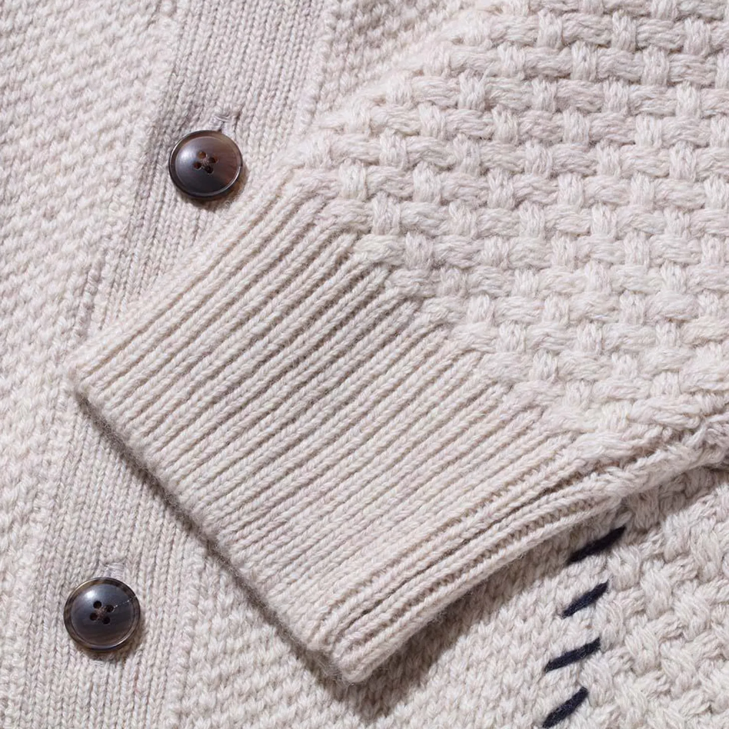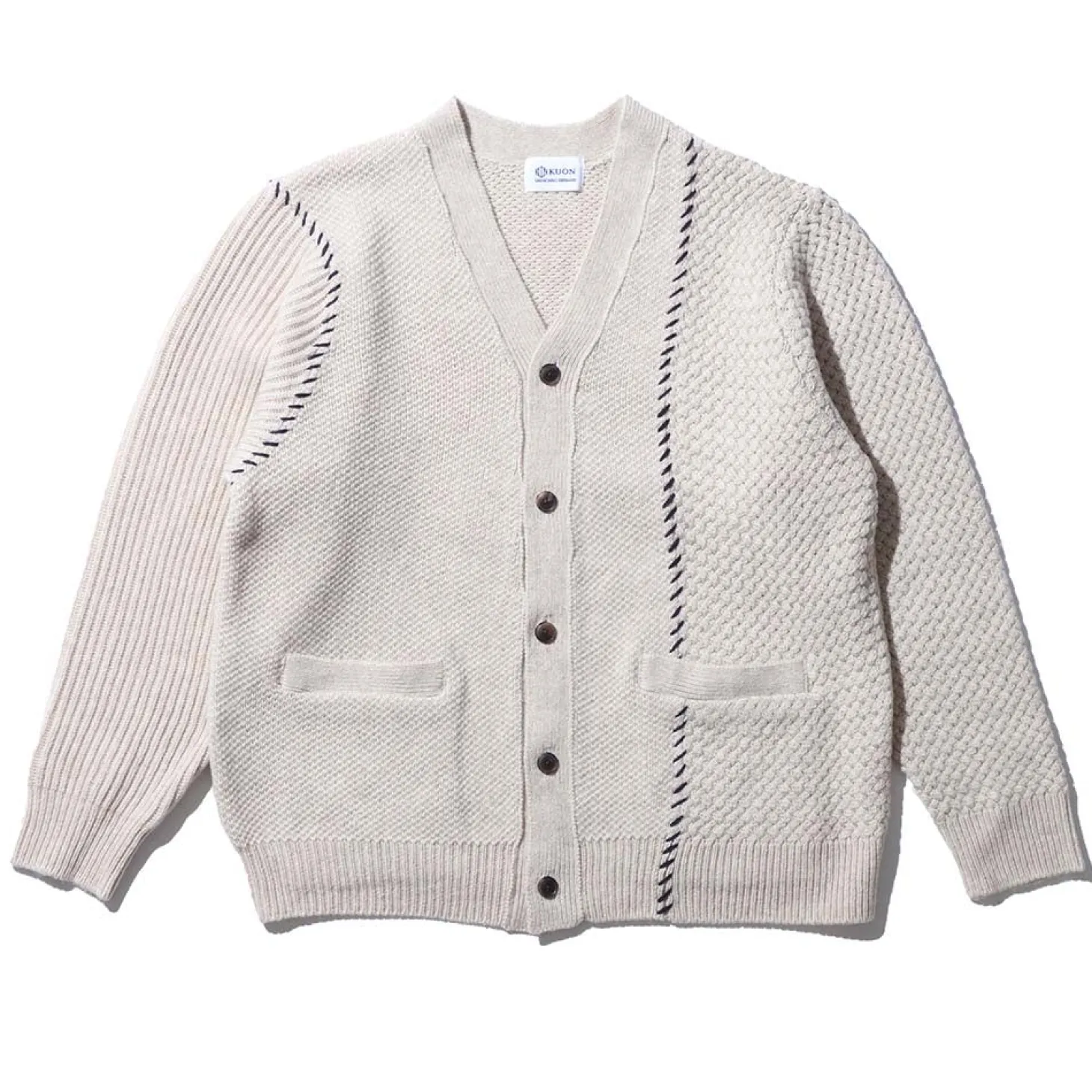 The Multi-Patterned Cardigan w/hand stitch from KUON is inspired by the Japanese art of ‘Kintsugi’ whereby damaged pottery is repaired – this is represented through the hand-stitch that runs through the body and shoulder seam of the cardigan. Made in Japan and cut from 100% wool, this version comes in a classic ecru colour-way and features a relaxed fit, a button front and two lower pockets.