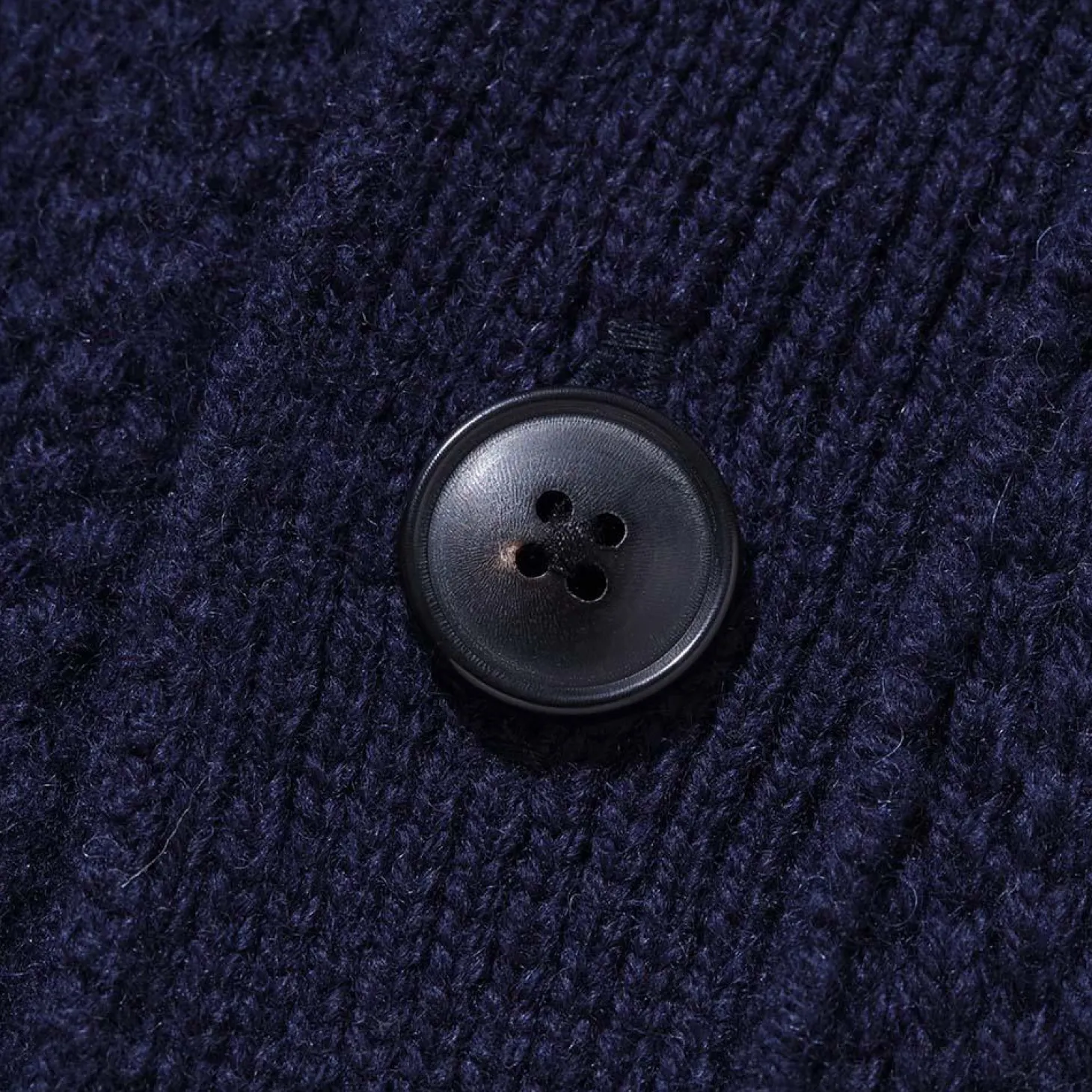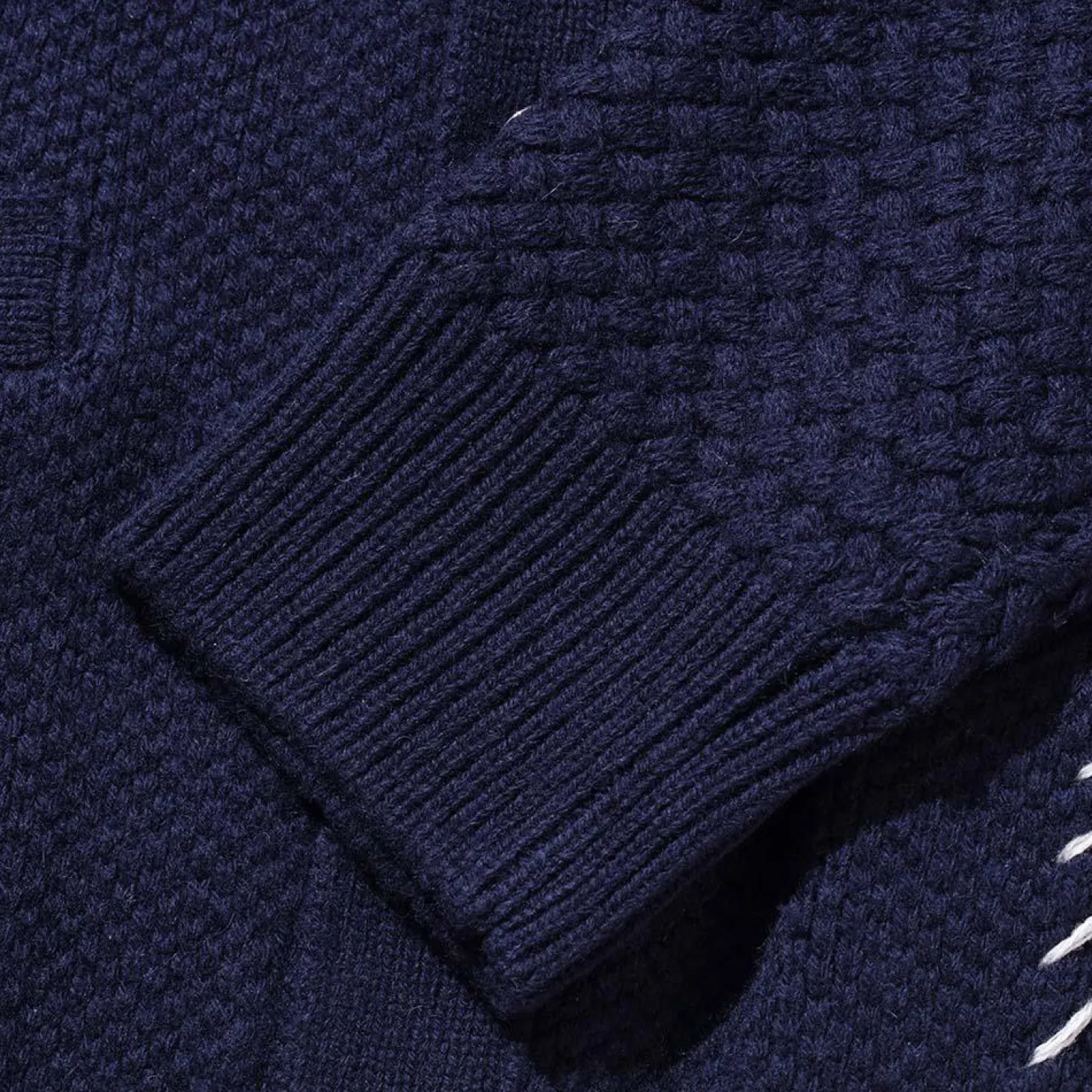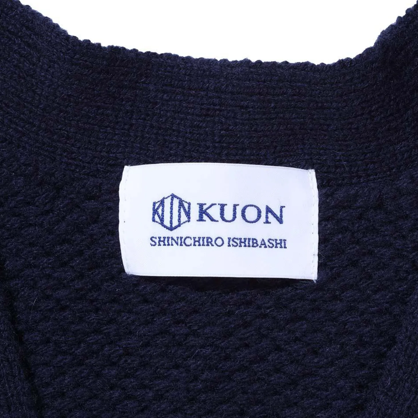 The Multi-Patterned Cardigan w/hand stitch from KUON is inspired by the Japanese art of ‘Kintsugi’ whereby damaged pottery is repaired – this is represented through the hand-stitch that runs through the body and shoulder seam of the cardigan. Made in Japan and cut from 100% wool, this version comes in a classic navy colour-way and features a relaxed fit, a button front and two lower pockets.