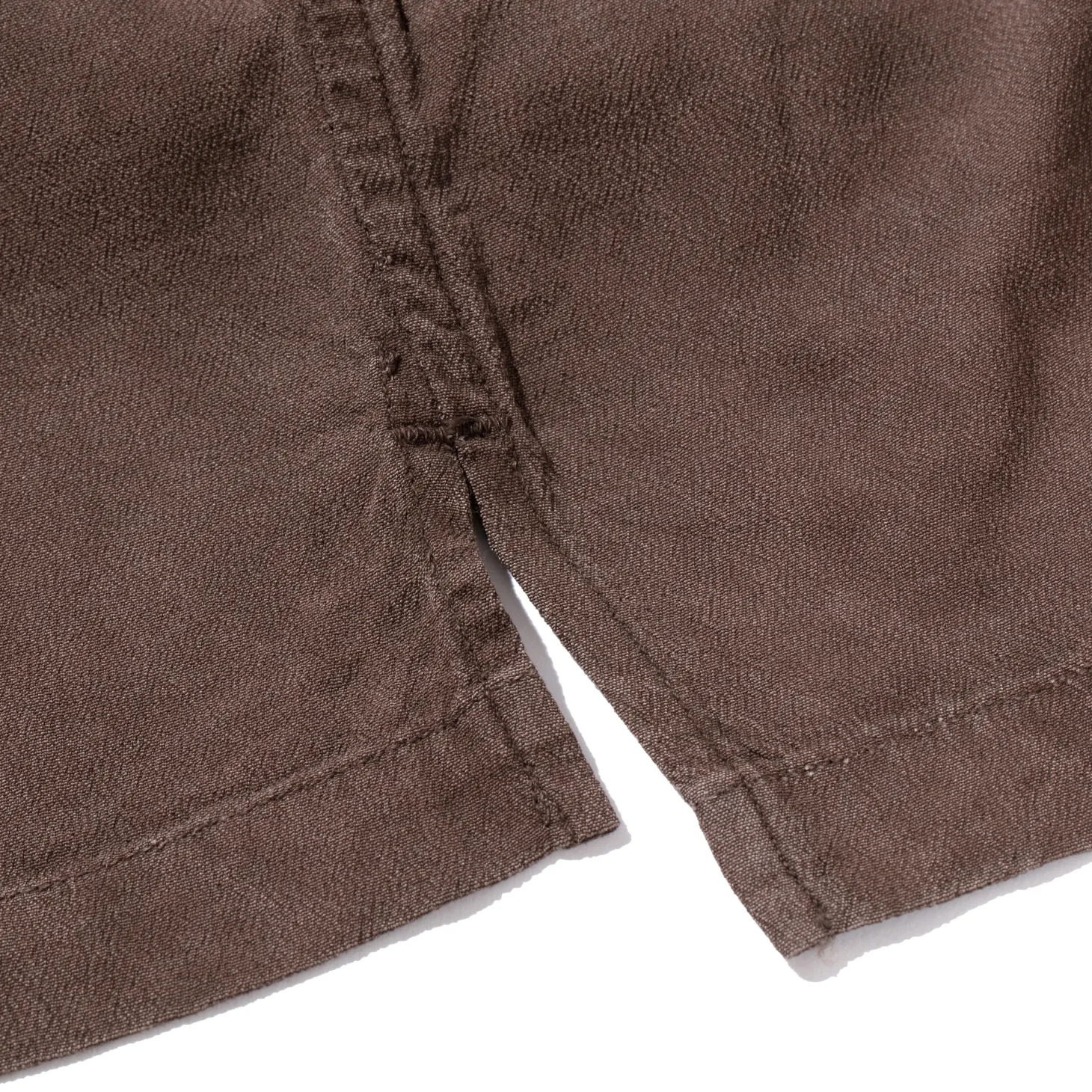 Here we have the Dorozome Open Collar Shirt in a Mud Brown colour-way. Dorozome runs through the veins and history of the island of Amami-Oshima, a collection of islands north of Okinawa. As with most Japanese dying techniques, this natural dye (that comes from Sharimbai – or wood chips from the Japanese Hawthone tree) was used to colour natural silk that was then used for the production of clothing and in particular Kimonos.