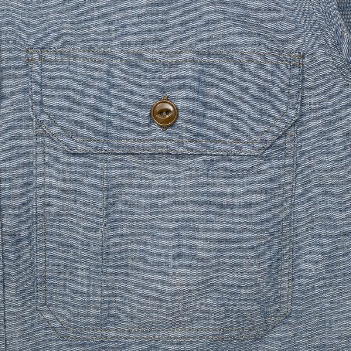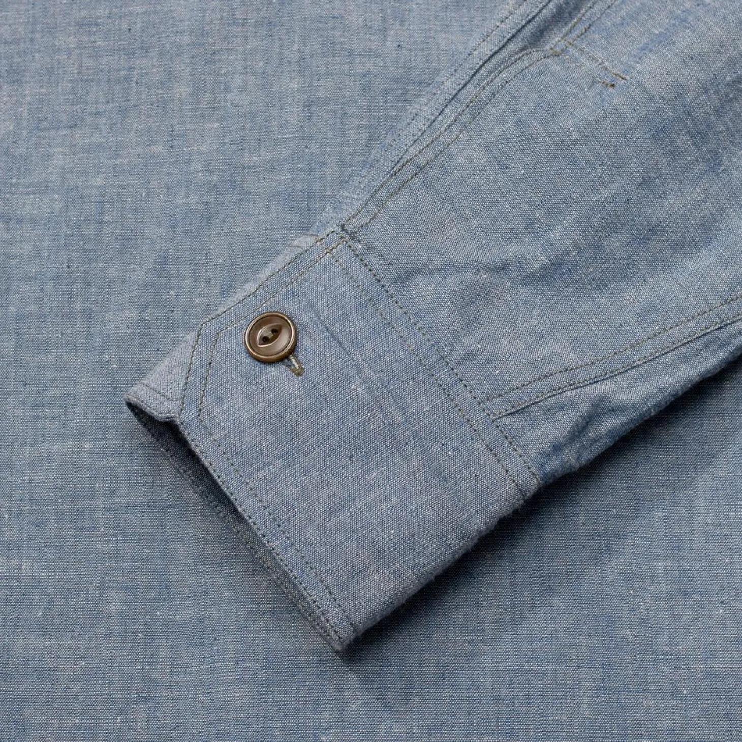 Characteristics from original garments issued included a one-piece unstructured collar (no collar band), a singular style of elbow reinforcement patch, and two large utilitarian chest pockets each with pen compartments. The Snipes features all of these details but has been cut from a slubby indigo chambray fabric with green contrasting stitching.