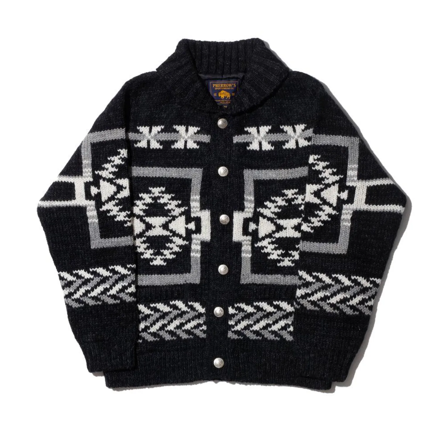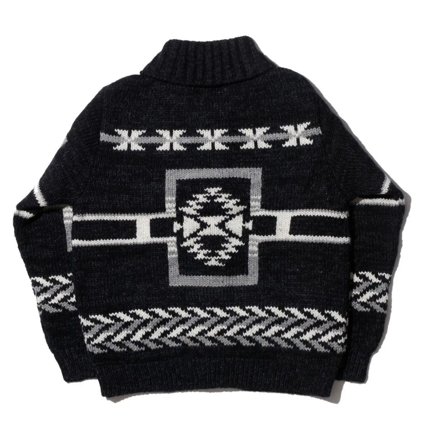 Drawing inspiration from the Cowichan style of knitting, originally made by the Cowichan people of Vancouver Island, British Columbia. The style became popular with tourists and people out side of the Cowichan community in the 1920’s. Usually made in Grey, Cream or Black, Cowichan Cardigans feature geometric and Native American motifs on the back and front and have inspired many brands to reproduce this classic design.