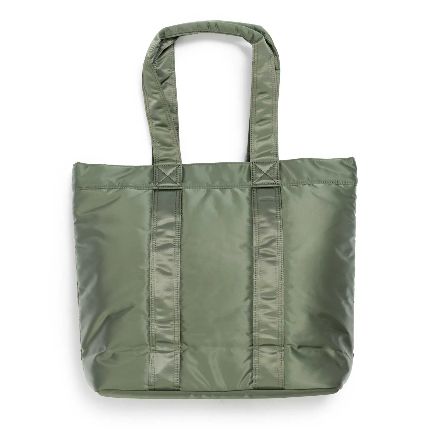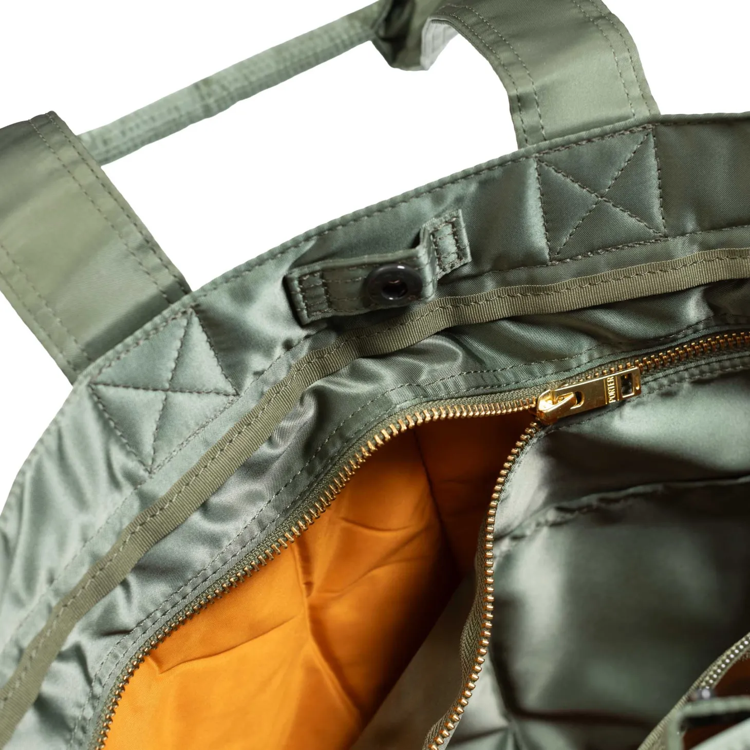 Designed with practicality in mind, the Tote Bag from Porter is a Tanker favourite. Cut in Japan from a nylon shell, with a rescuer orange liner, the Tote Bag features two large pockets to the front with button snap closure while an internal zip closure pocket has been added, together with a matching gold zip closure pocket on the opposite side. A snap closure in the middle brings the bag together while it is finished with two carry handles.