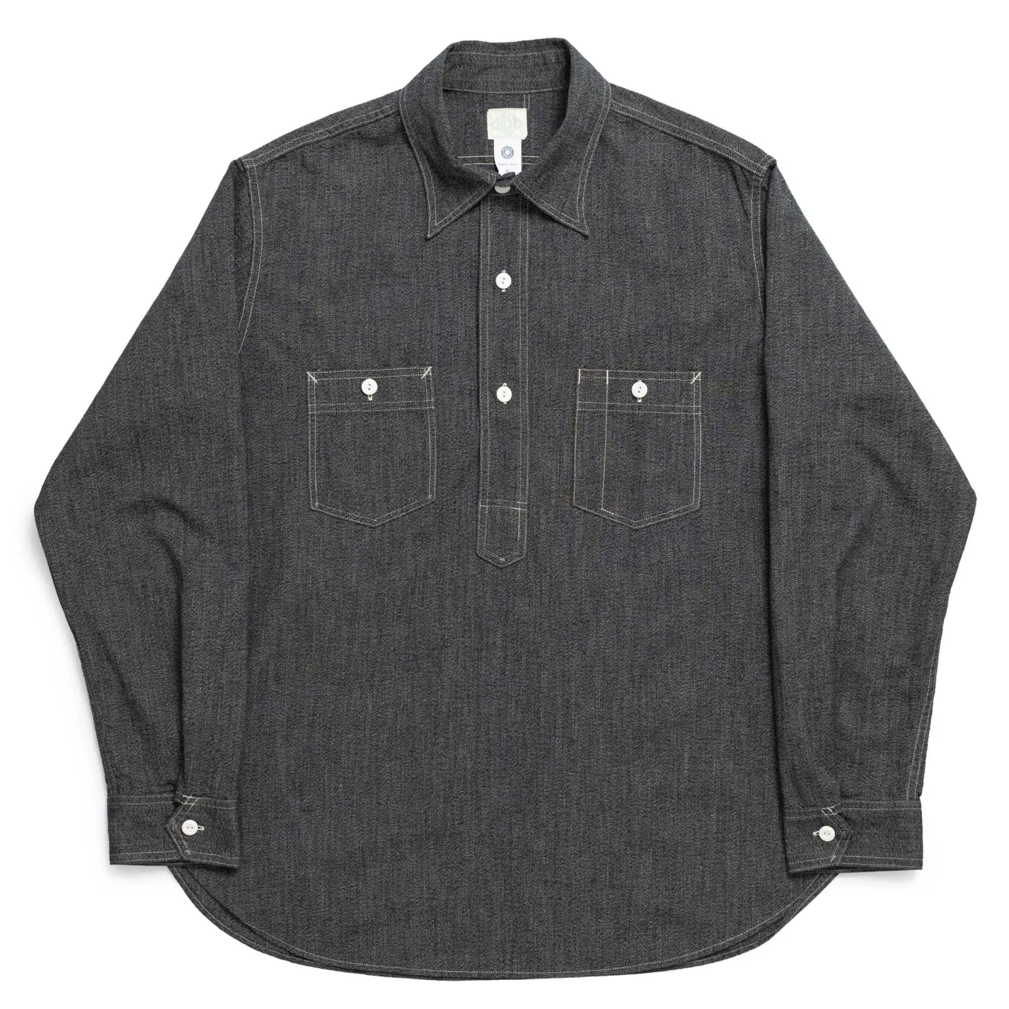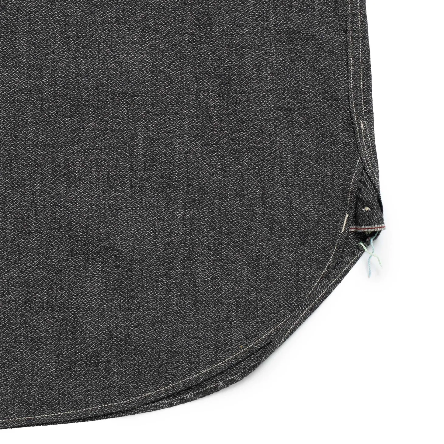 Cut in Japan from a washed grey covert salt & pepper colour-way, the shirt features all the detailing found on these pre-1920’s style shirts. A 1/4 button placket has been paired with a regular collar and double throat tab, two symmetrical chest pockets as well as vintage detailing like chain stitch run offs and reinforced gussets. A curved hem & contrasting stitching throughout finishes of this classic style.