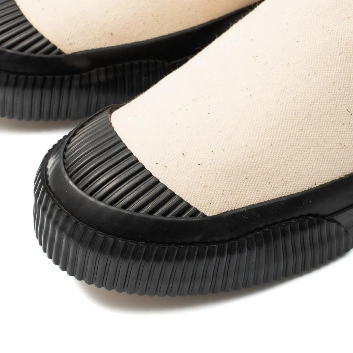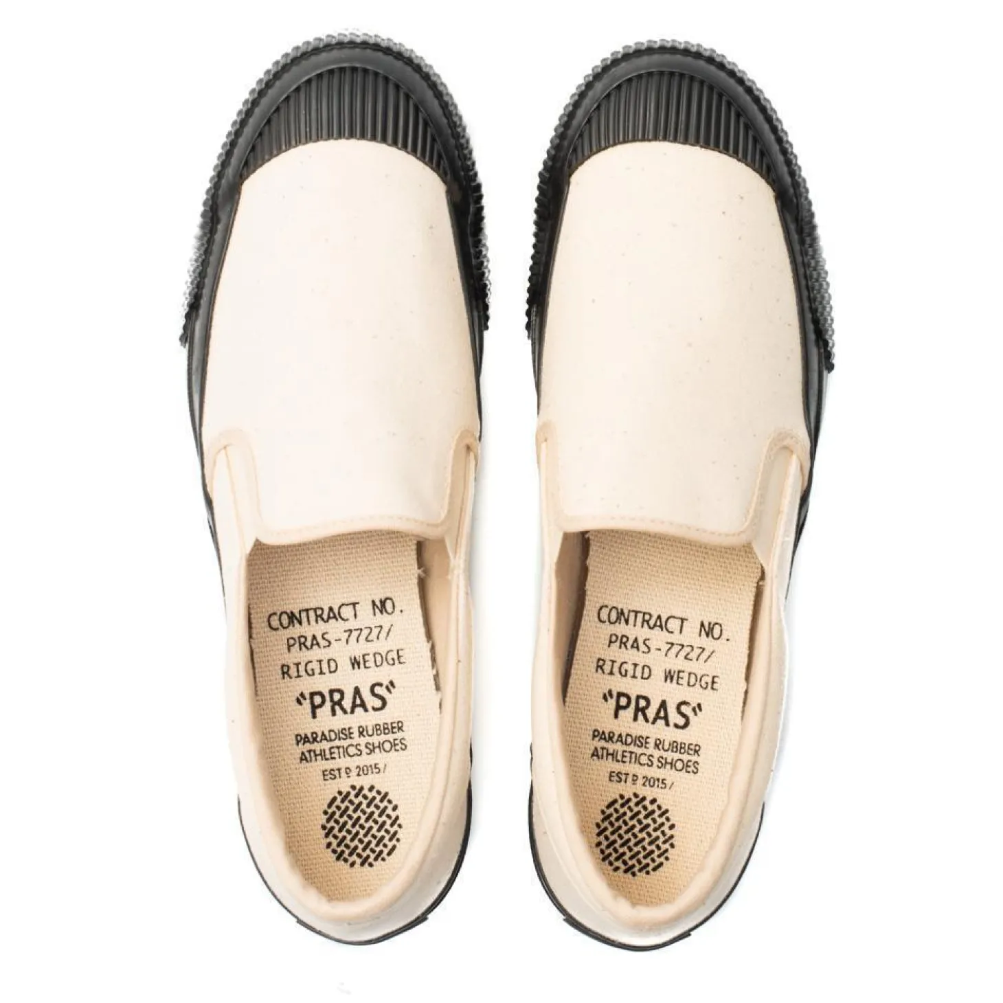 Inspired by the classic athletic sneakers of the 1950’s, the PRAS Shellcap Mould Slip-ON sneakers are an updated silhouette all Made in Japan. The sneakers feature canvas uppers and non-slip rubber soles, inspired by US Naval issued footwear. They also feature vulcanised construction whereby the soles are bonded to the uppers through a firing process via a kiln. There are only two factories in Japan that offer this service, both being based in Kurume. Combining comfort with supreme Japanese craftsmanship, these make for a perfect accompaniment to any Spring/Summer outfit.