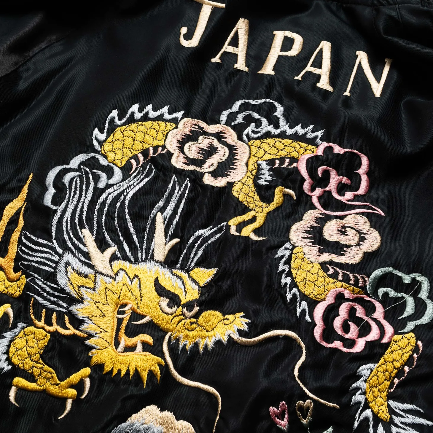 The roots of the Souvenir Jacket, or Sukajan in Japanese, can be traced back to American soldiers stationed in the Pacific following the end of World War II During the post-war occupation, American troops began using traditional Japanese designs and hand-stitching them into the backs of their jackets to commemorate their time in Japan Popular designs included Japanese (and Chinese) style dragons, cherry blossoms and trees Some would also opt for artwork that could have ranged from local maps to Geisha girls These pieces would often use rayon and silk
