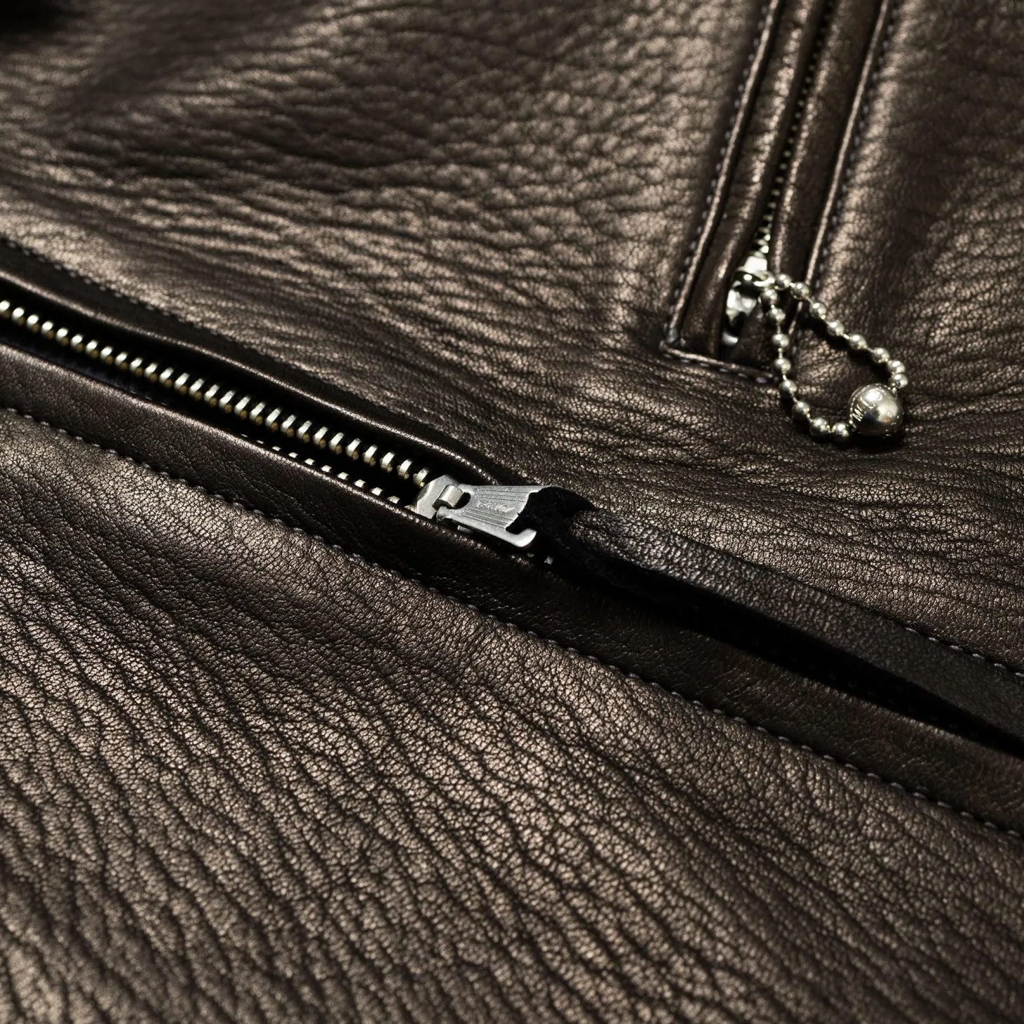 Made in their leather atelier in Kobe, the Freeman uses a super-soft, supple, and comfortable black tanned Deerskin leather. It is lightweight, yet highly durable, making it the ideal companion for this jacket.