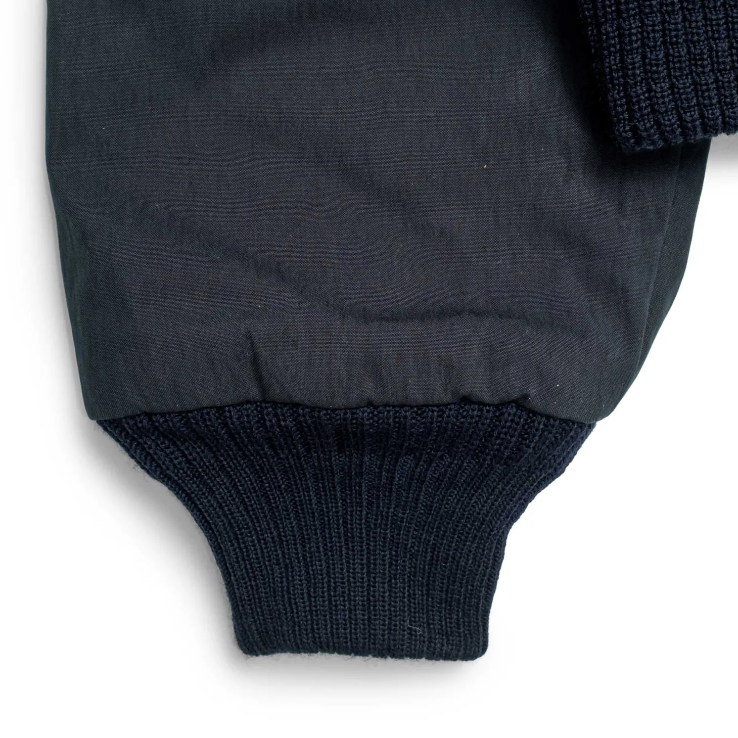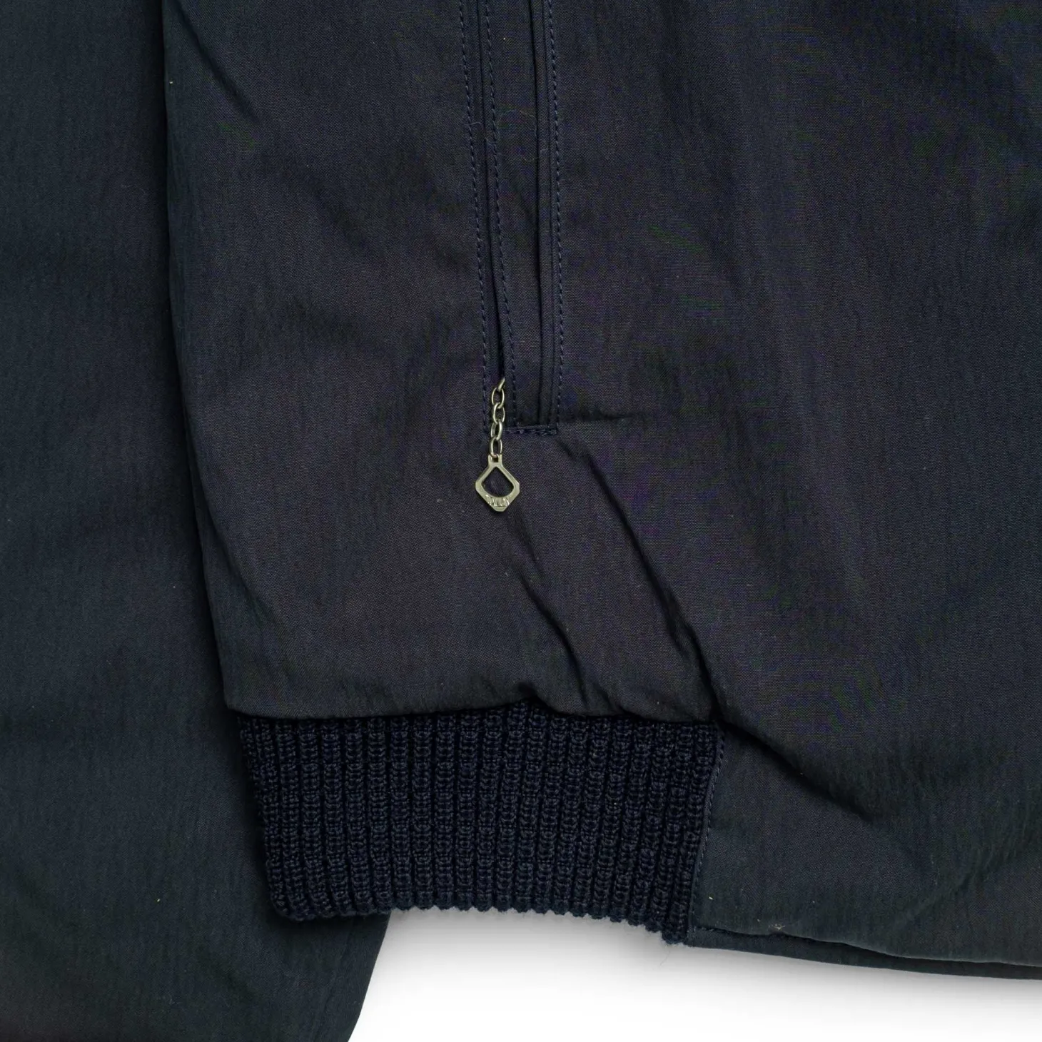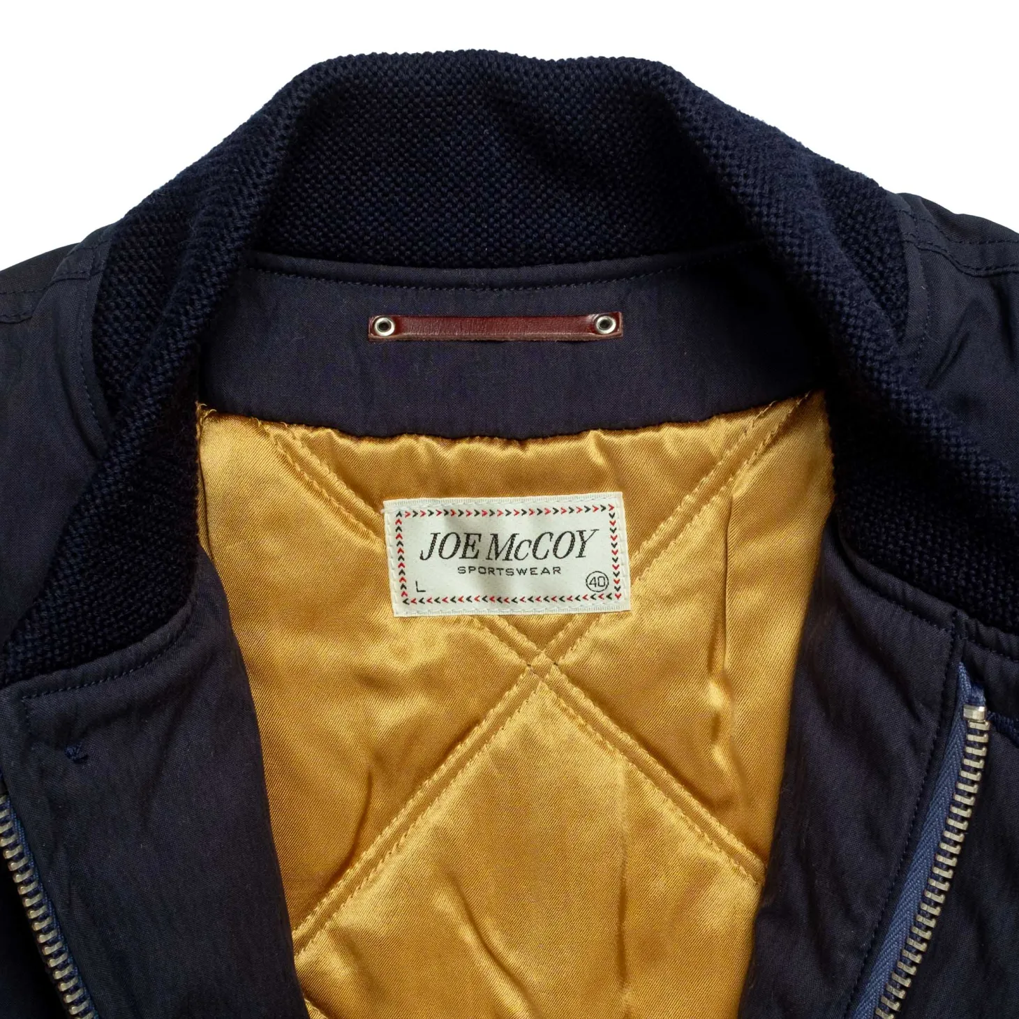 McCoy’s version is crafted from a fine blend of cotton & nylon and lined with a comfortable quilted rayon lining, in a gold colour-way, giving a nice pop of colour against the Jacket’s dark navy exterior. The definitive feature of the jacket is of course the cape shoulder while the jacket is paired with era style pull front zipper and a rhombus link zips on the pockets. Two slash pockets and custom wool-nylon cuffs, hem and collar have been paired with custom leather hanger on collar.