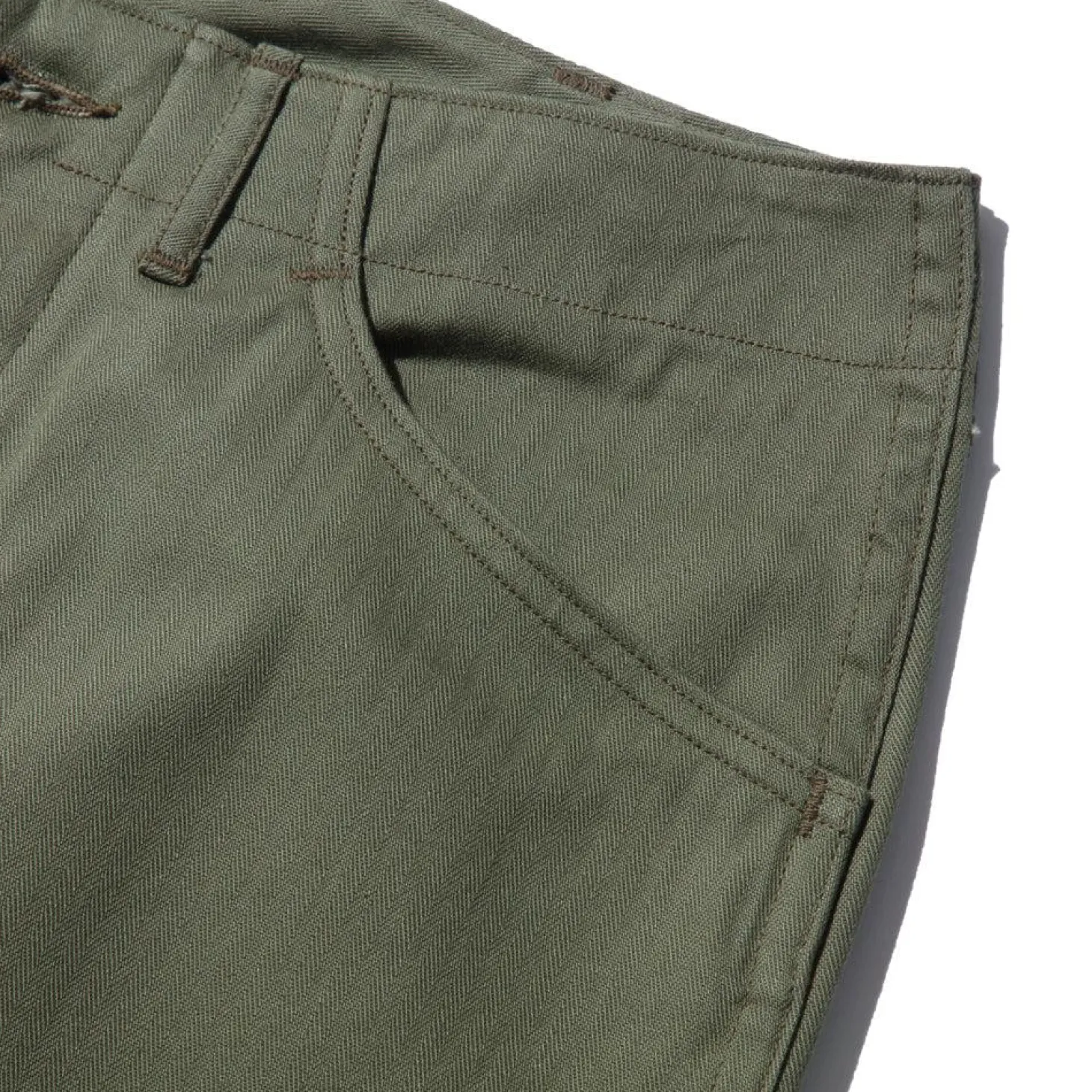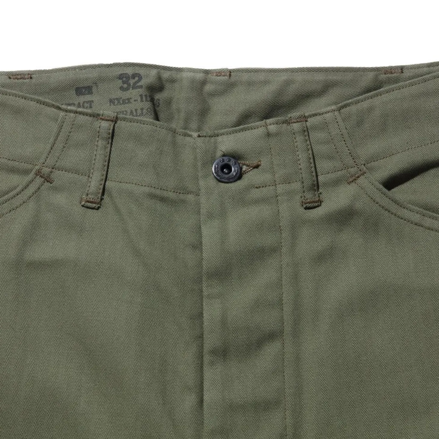 Here we have The Real McCoy’s N-3 Utility Trousers (Model 220), a classic piece of Japanese ‘American Casual’ reproduction clothing. First introduced in the 1940’s as part of 4-piece uniform issued to U.S Navy shore parties and usually cut from a herringbone twill cotton fabric in olive drab colour #7. The ‘N’ was part of clothing identification and contract issue (often seen as NXS) developed by the US Navy.