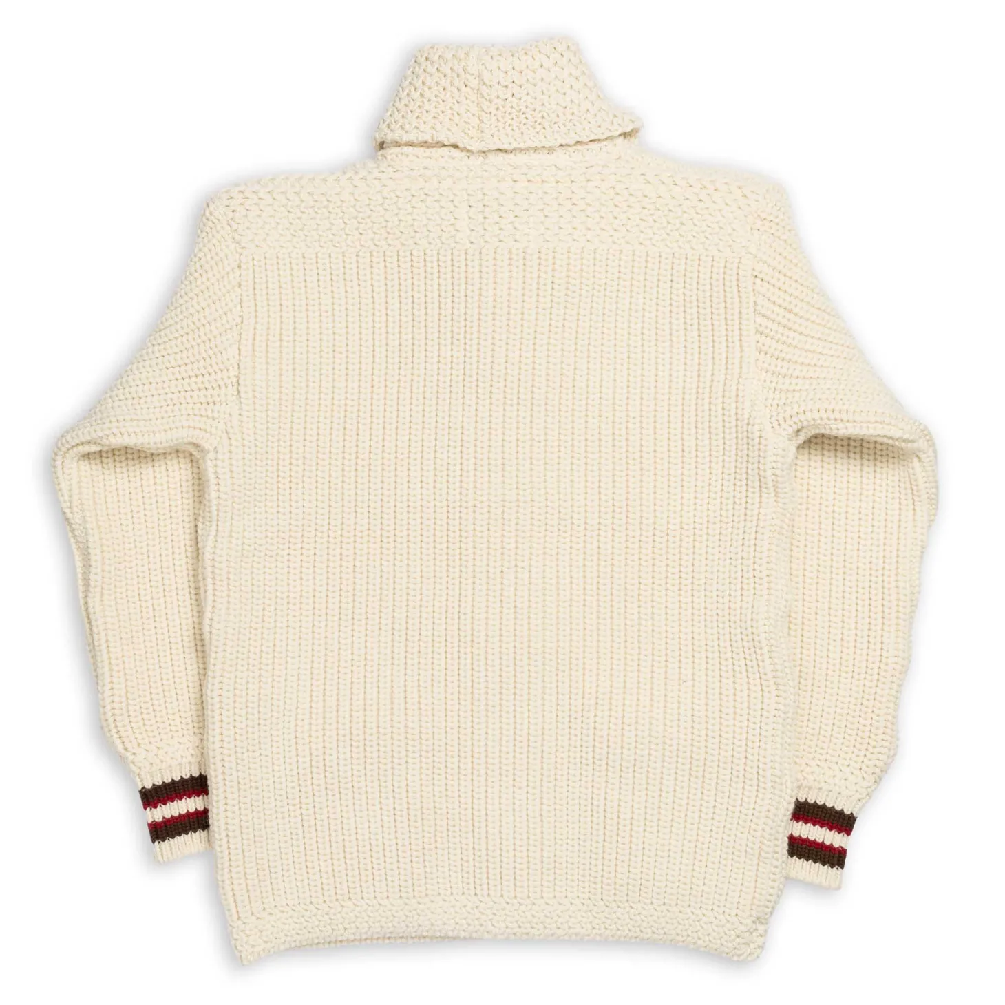 This version is Made in Japan to McCoy’s unwavering standards and uses a tightly woven 3-gauge wool knit. The Shawl collar is complimented with two pockets and a button front, while the stripes are a nod back to vintage style school/sport or campus cardigans.